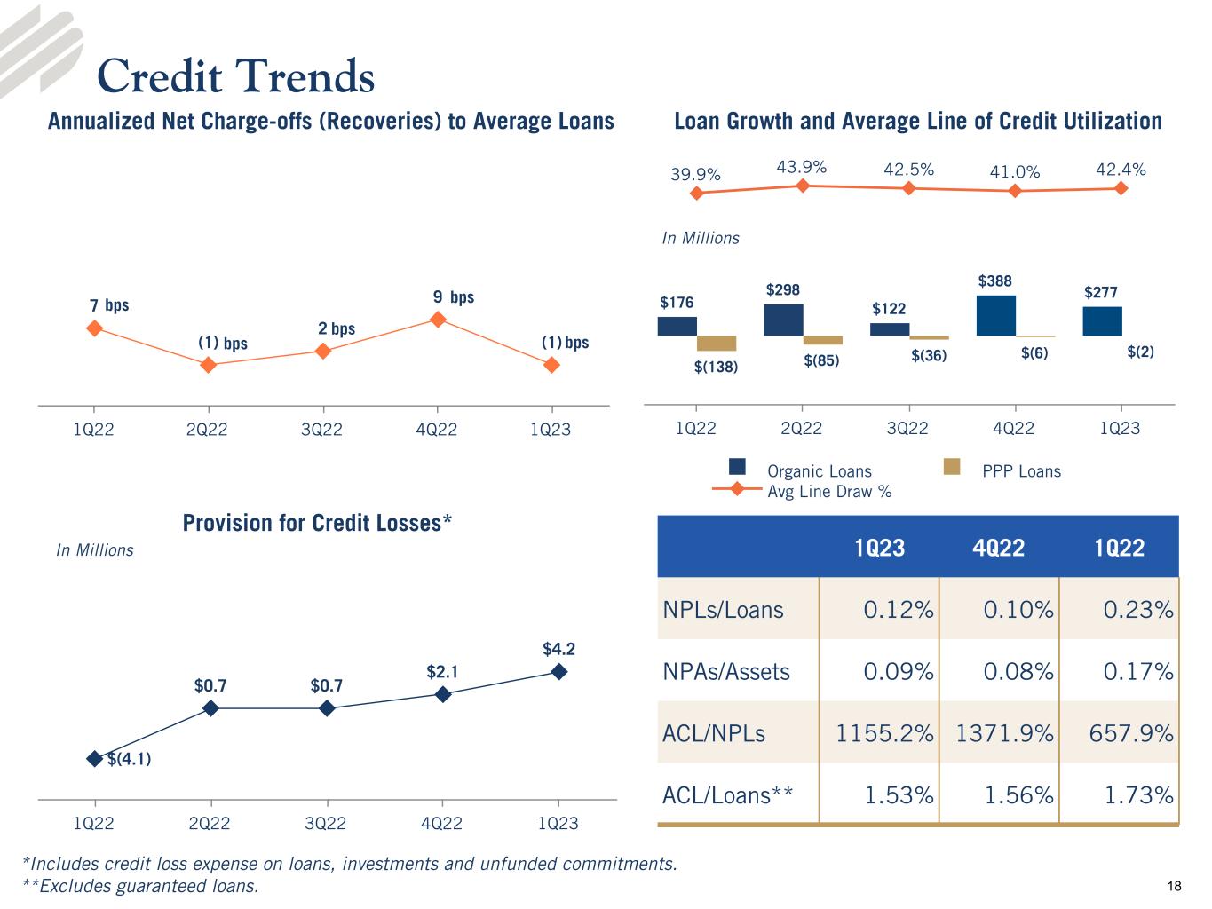 •Asset quality - The allowance for credit losses to total loans was 1.38% at March 31, 2023, compared to 1.41% at December 31, 2022 and 1.54% at March 31, 2022. Nonperforming assets to total assets was 0.09% at March 31, 2023, compared to 0.08% and 0.17% at December 31, 2022 and March 31, 2022, respectively. The provision for credit losses of $4.2 million recorded in the first quarter 2023 was primarily related to the credit impairment of an investment security in subordinated debt of a failed bank, and to loan growth, partially offset by a decrease in the reserve for unfunded commitments.