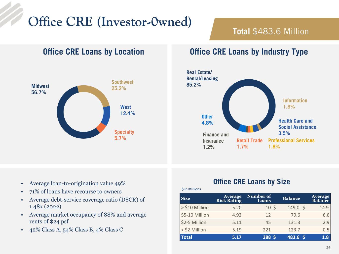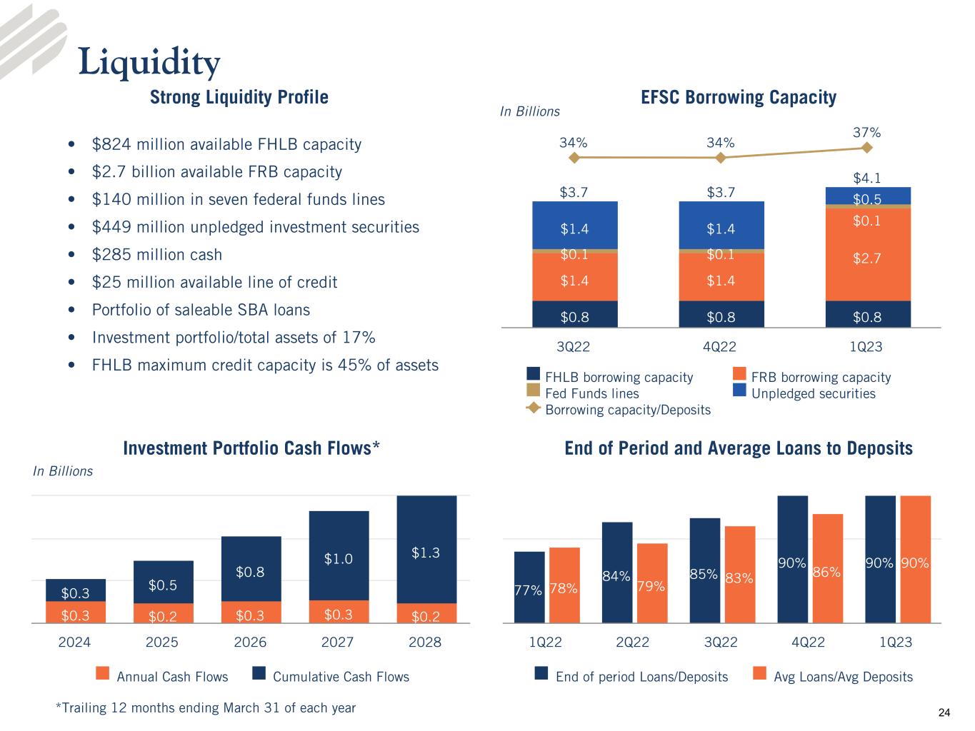 •Liquidity - The Company’s total available on- and off-balance-sheet liquidity was approximately $4.4 billion at March 31, 2023. On-balance-sheet liquidity consisted of cash of $285.1 million and unpledged investment securities with a fair value of $449.2 million at March 31, 2023. In the first quarter 2023, the Company pledged additional securities to the Federal Reserve to increase its available borrowing capacity. The Company also has $937.4 million of SBA guaranteed loans, a portion of which could be sold in the secondary market to generate earnings and liquidity. Off-balance-sheet liquidity consisted of $824.1 million available through the Federal Home Loan Bank, $2.7 billion through the Federal Reserve and $140.0 million through correspondent bank lines. The Company also has an unused $25.0 million revolving line of credit and maintains a shelf registration allowing for the issuance of various forms of equity and debt securities.