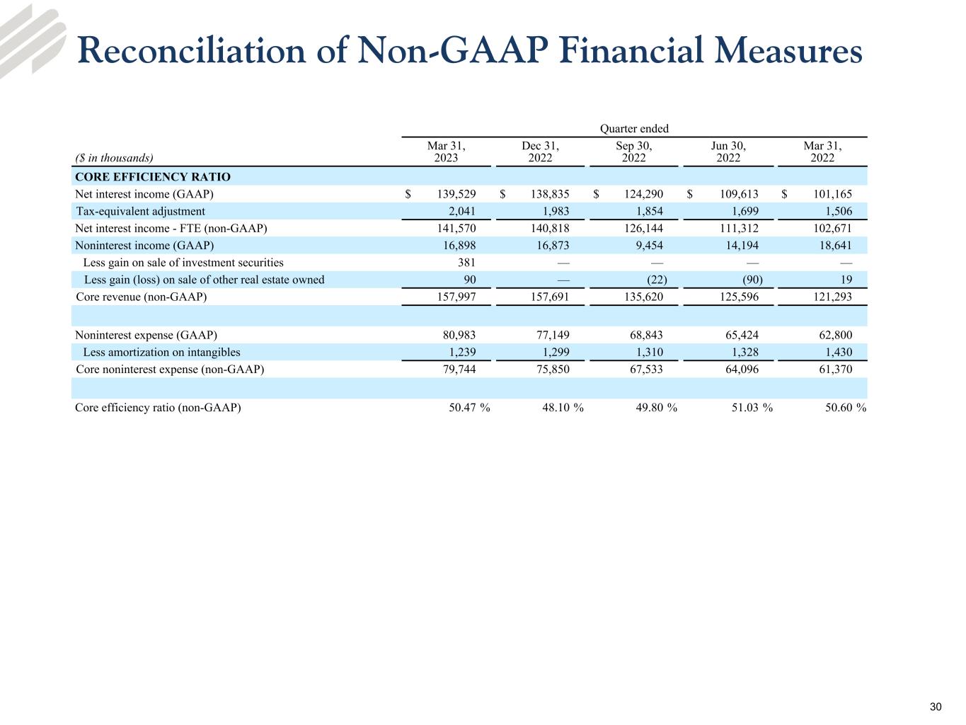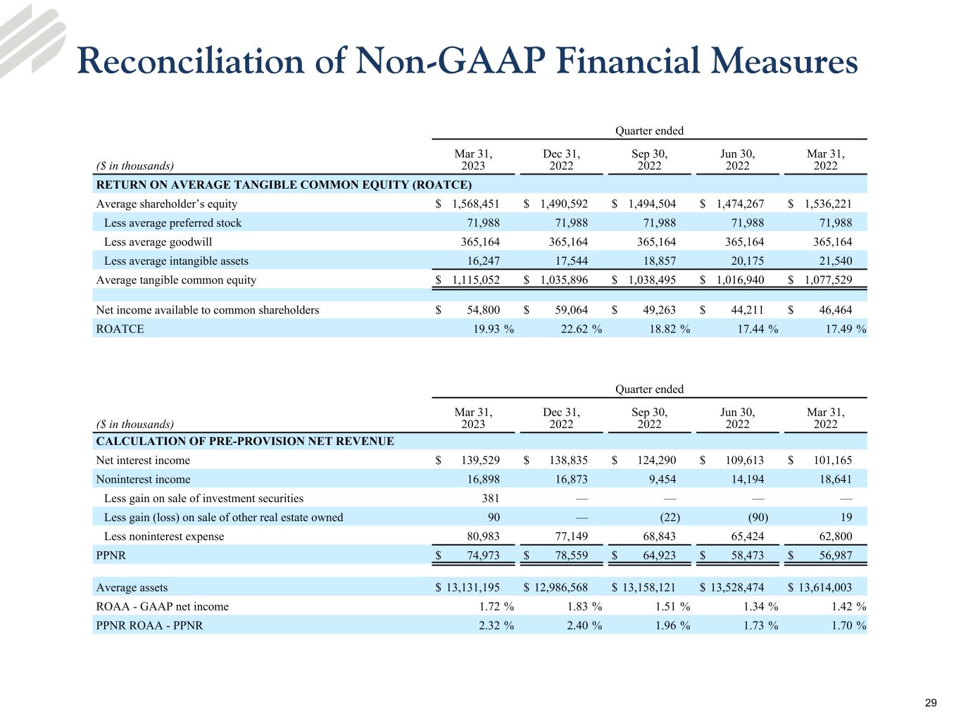 •Pre-provision net revenue2 (“PPNR”) - PPNR of $75.0 million in the first quarter 2023 decreased $3.6 million from the linked quarter and increased $18.0 million from the prior year quarter, respectively. The decrease from the linked quarter was primarily due to a seasonal increase in noninterest expense, partially offset by an increase in net interest income. The increase compared to the prior year quarter was primarily due to an increase in net interest income, partially offset by an increase in noninterest expense.