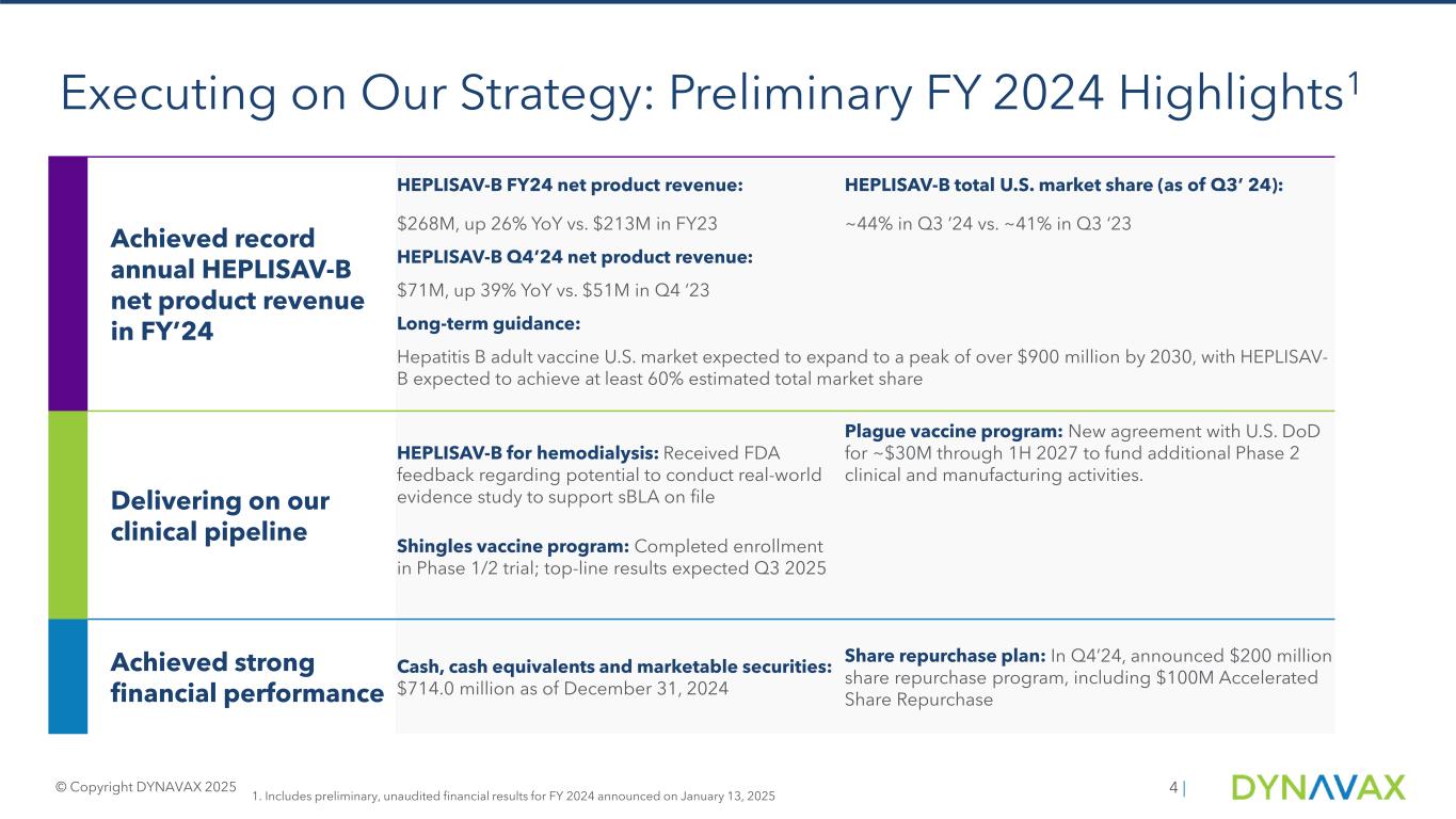 カリフォルニア州エメリービル-2025年1月13日-革新的なワクチンを開発・商業化しているコマーシャルステージのバイオ医薬品企業であるダイナバックス・テクノロジーズ・コーポレーション(Nasdaq: DVAX)は本日、2024年12月31日を期末とする第4四半期および通期の仮決算ハイライト(未監査)を発表しました。