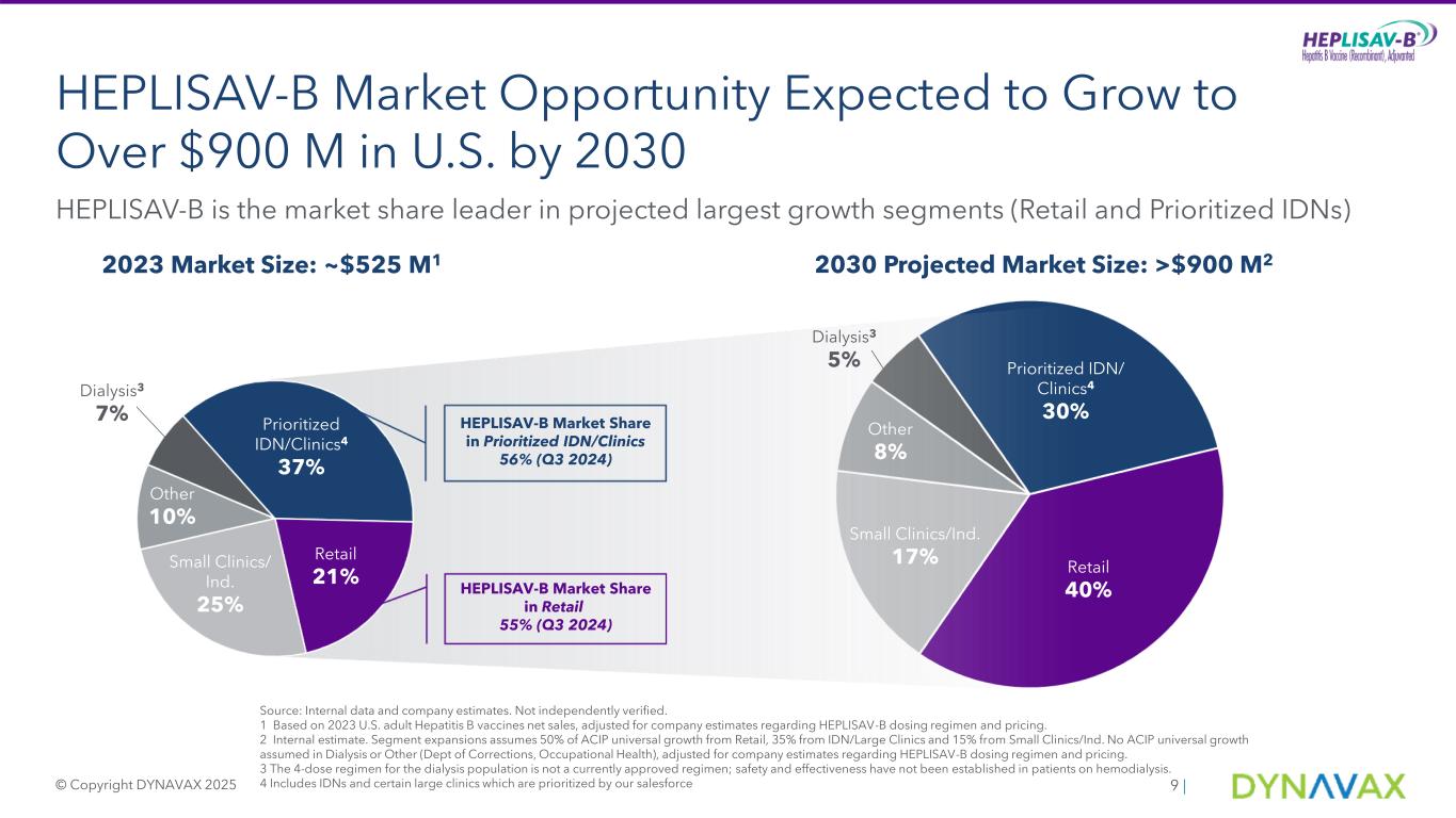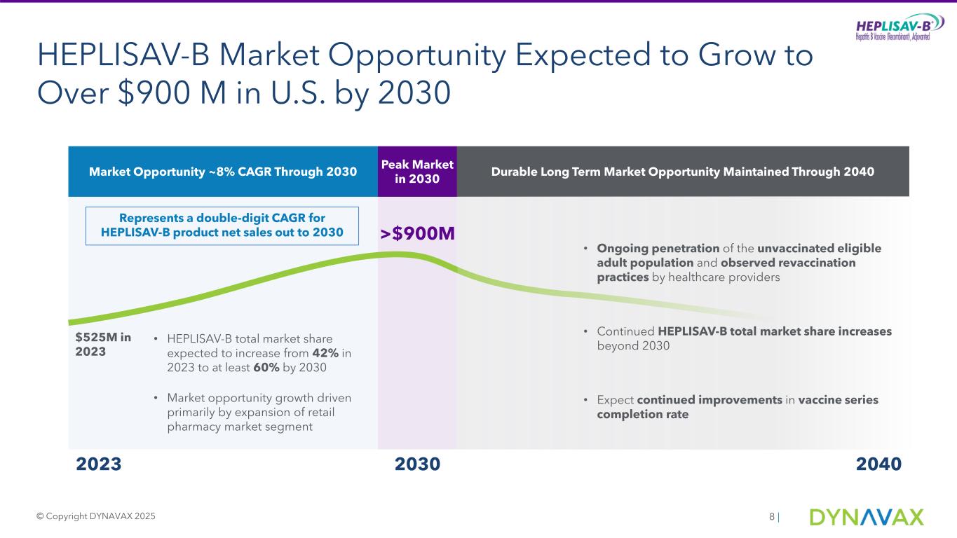 -ダイナバックスは引き続き、米国の成人B型肝炎ワクチン市場が2030年までに年間売上高9億ドル超のピークに達すると予想しており、HEPLISAV-Bは少なくとも60%の市場シェアを達成すると見込んでいます。さらにダイナバックスは、HEPLISAV-Bの米国における市場機会は、ワクチン未接種の成人への浸透、医療従事者による再接種の実施、市場シェアの継続的な拡大により、2030年以降も引き続き大きいと考えています。