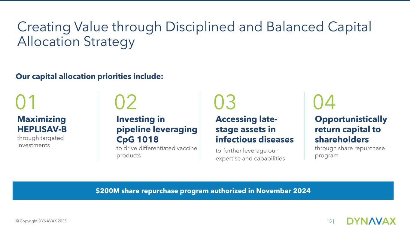 「HEPLISAV-Bが2024年に記録的な年間売上高を達成し、前年比26%増となったことを発表できることをうれしく思います。この持続的なトップライン成長は、HEPLISAV-Bブランドの強さを強調するだけでなく、長期的な価値創造のための強固な基盤を築くものです。ダイナバックスのライアン・スペンサー最高経営責任者(CEO)は、次のように述べています。「当社の強固な財務基盤は、パイプライン・プログラムを推進し、経常的な収益性を達成することに重点を置き、積極的な自社株買戻しプログラムを通じて株主に資本を還元するための力となっています。「2025年を見据えて、HEPLISAV-Bの機会を最大限に活用し、臨床パイプラインを実現し、株主のために持続可能な価値を生み出す外部機会を追求することを中心に、戦略的成長の柱を実行していきます。
