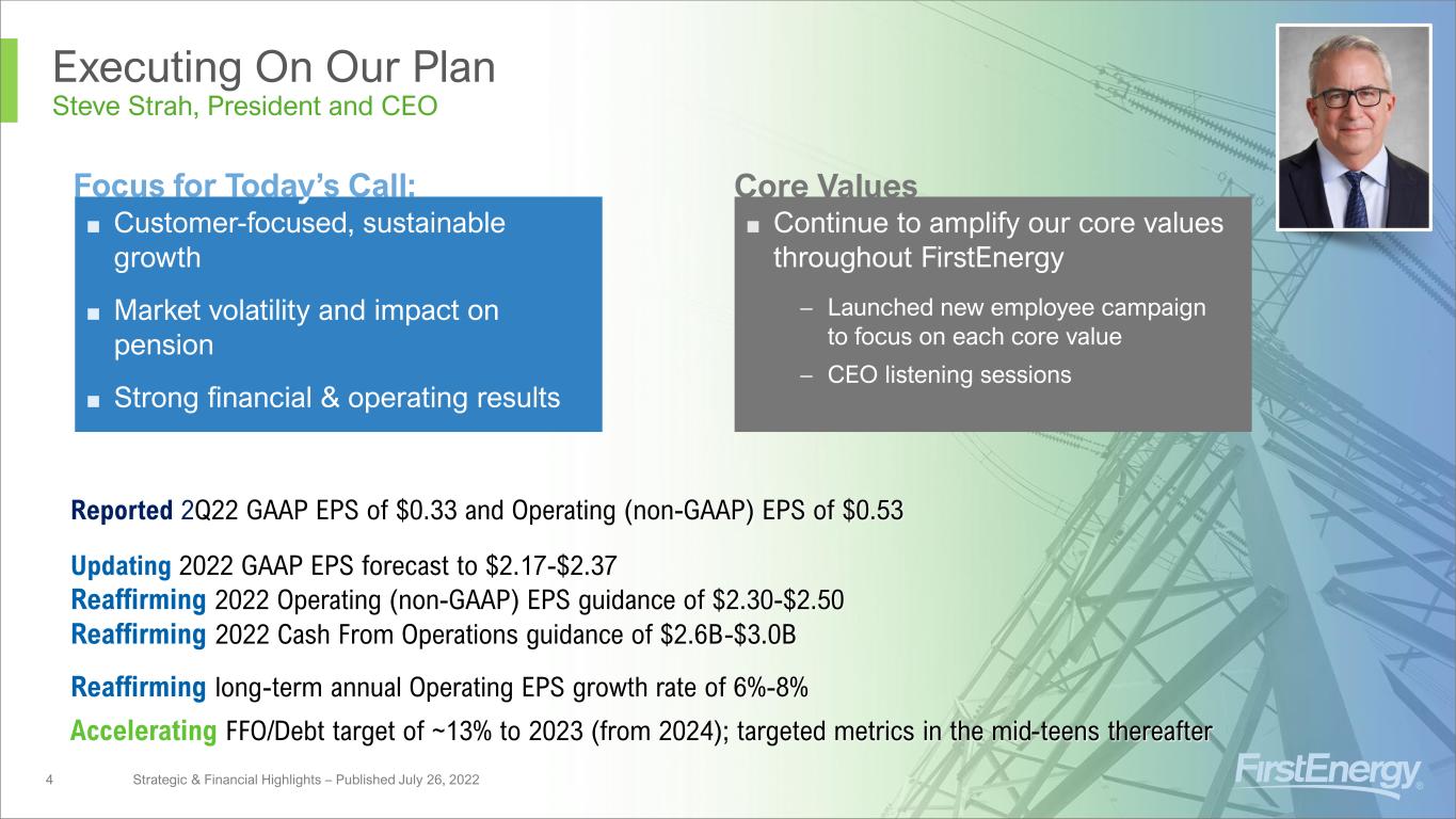 ファーストエナジーの社長兼CEOであるスティーブン・E・ストラーは、「2022年上半期を通じて、企業文化の強化、業務の最適化、財務基盤の強化に向けた大きな進展があり、より顧客志向で持続可能な企業になるという当社の使命を支えています」と述べました。