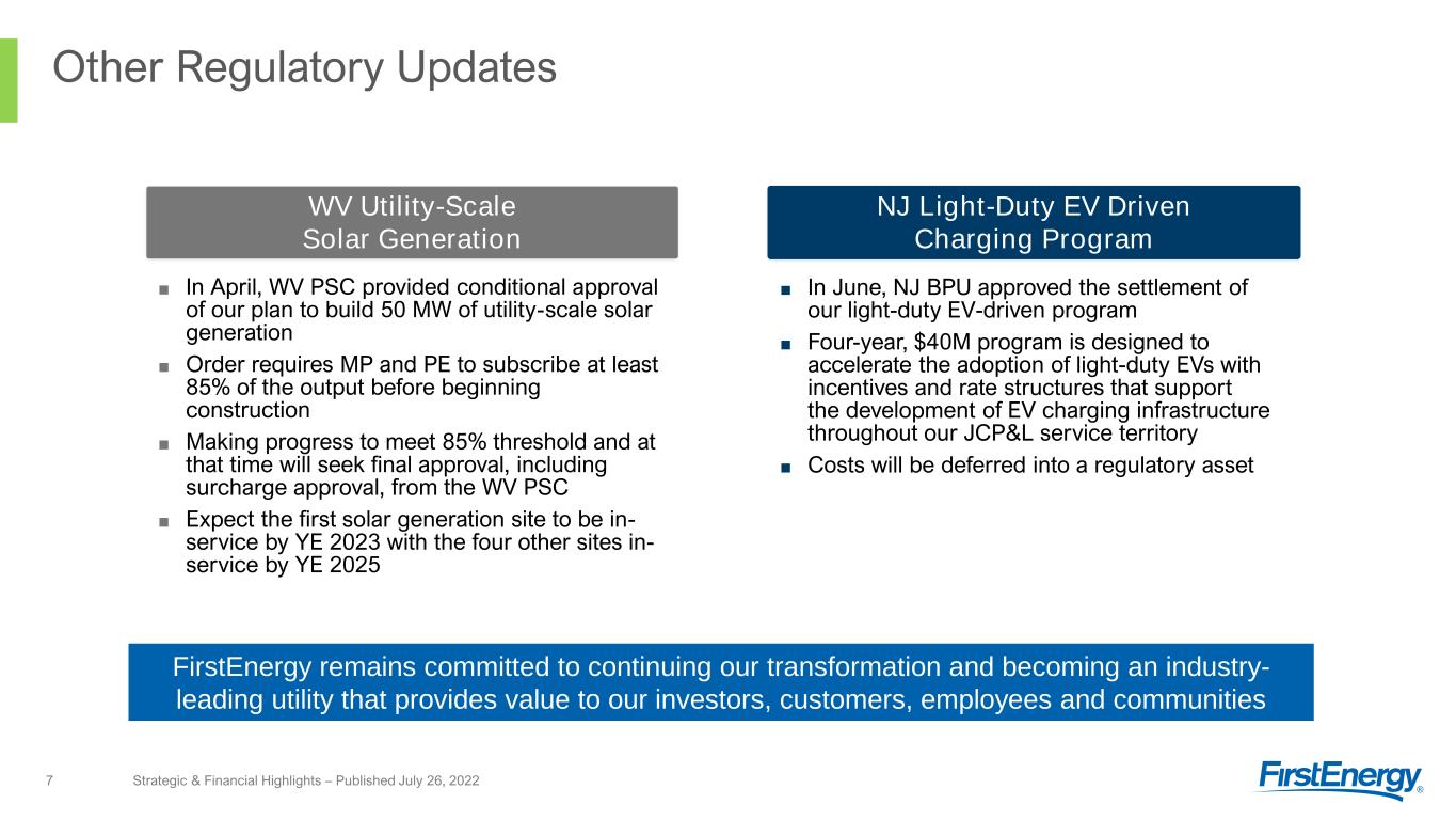 ファーストエナジーの戦略・財務ハイライトは、同社の投資家情報サイト - www.firstenergycorp.com/ir に掲載されています。この報告書にアクセスするには、「2022年第2四半期財務報告書」のリンクをクリックしてください。