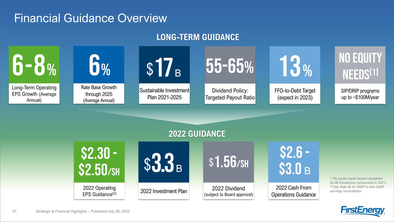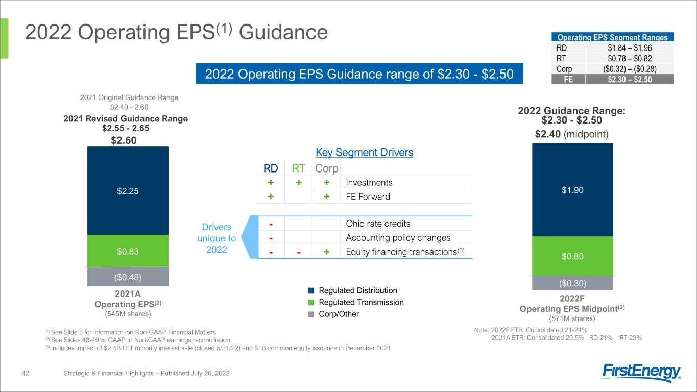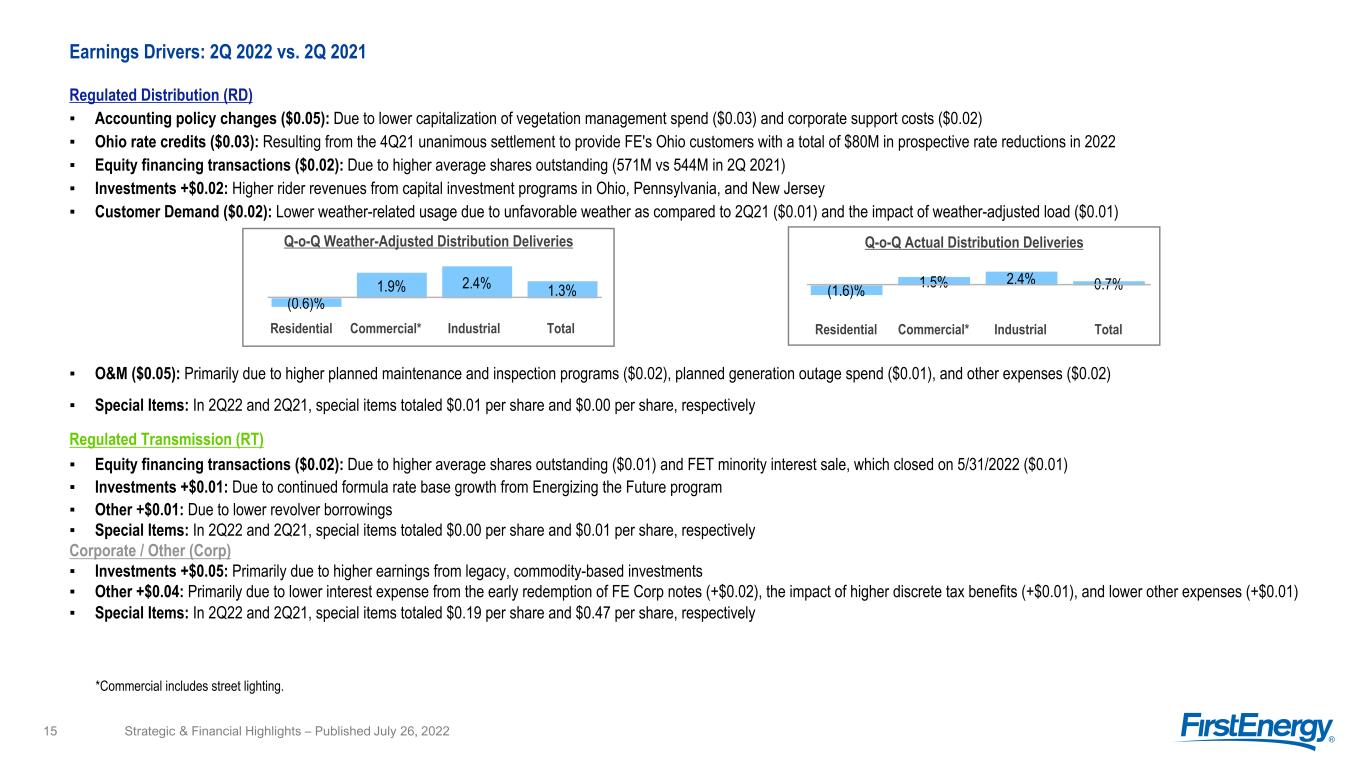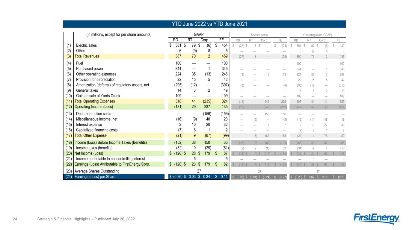 2022年第2四半期および累計の業績には、特定の会計方針の変更の影響、同社が以前に承認した規定に基づきオハイオ州の顧客に提供した料金クレジット、2021年末に完了した普通株融資取引および2022年5月31日に完了したファーストエナジートランスミッション社の少数株主持分の売却に関する希薄化が反映されています。