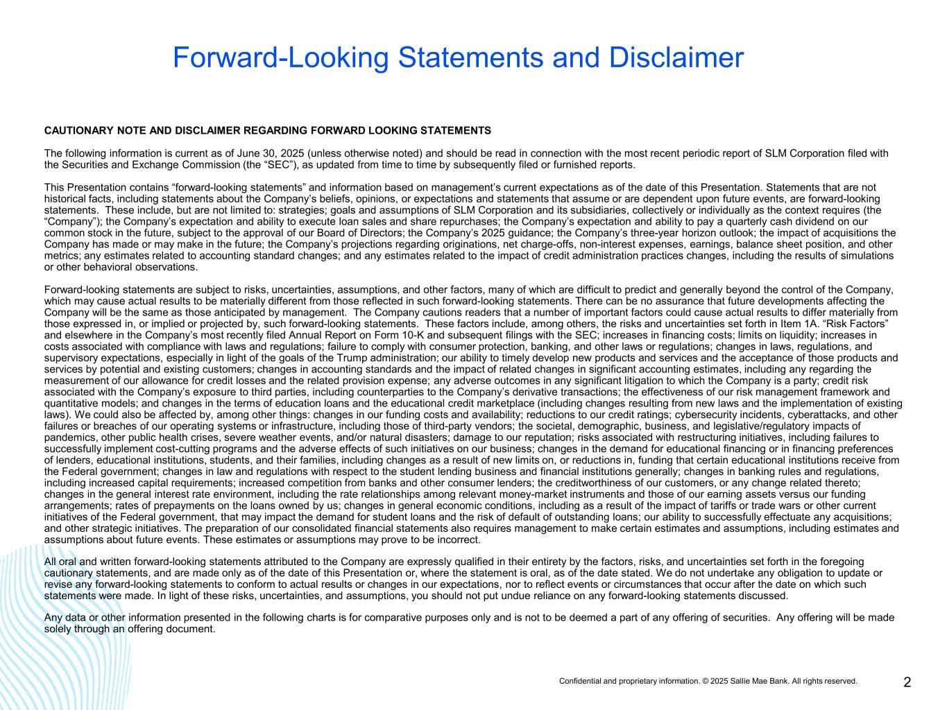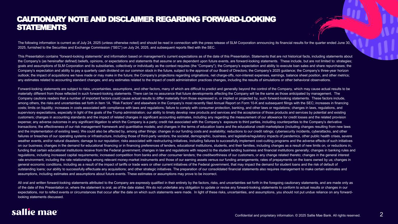Confidential and proprietary information. © 2025 Sallie Mae Bank. All rights reserved. 2 CAUTIONARY NOTE AND DISCLAIMER REGARDING FORWARD LOOKING STATEMENTS The following information is current as of June 30, 2025 (unless otherwise noted) and should be read in connection with the most recent periodic report of SLM Corporation filed with the Securities and Exchange Commission (the “SEC”), as updated from time to time by subsequently filed or furnished reports. This Presentation contains “forward-looking statements” and information based on management’s current expectations as of the date of this Presentation. Statements that are not historical facts, including statements about the Company’s beliefs, opinions, or expectations and statements that assume or are dependent upon future events, are forward-looking statements. These include, but are not limited to: strategies; goals and assumptions of SLM Corporation and its subsidiaries, collectively or individually as the context requires (the “Company”); the Company’s expectation and ability to execute loan sales and share repurchases; the Company’s expectation and ability to pay a quarterly cash dividend on our common stock in the future, subject to the approval of our Board of Directors; the Company’s 2025 guidance; the Company’s three-year horizon outlook; the impact of acquisitions the Company has made or may make in the future; the Company’s projections regarding originations, net charge-offs, non-interest expenses, earnings, balance sheet position, and other metrics; any estimates related to accounting standard changes; and any estimates related to the impact of credit administration practices changes, including the results of simulations or other behavioral observations. Forward-looking statements are subject to risks, uncertainties, assumptions, and other factors, many of which are difficult to predict and generally beyond the control of the Company, which may cause actual results to be materially different from those reflected in such forward-looking statements. There can be no assurance that future developments affecting the Company will be the same as those anticipated by management. The Company cautions readers that a number of important factors could cause actual results to differ materially from those expressed in, or implied or projected by, such forward-looking statements. These factors include, among others, the risks and uncertainties set forth in Item 1A. “Risk Factors” and elsewhere in the Company’s most recently filed Annual Report on Form 10-K and subsequent filings with the SEC; increases in financing costs; limits on liquidity; increases in costs associated with compliance with laws and regulations; failure to comply with consumer protection, banking, and other laws or regulations; changes in laws, regulations, and supervisory expectations, especially in light of the goals of the Trump administration; our ability to timely develop new products and services and the acceptance of those products and services by potential and existing customers; changes in accounting standards and the impact of related changes in significant accounting estimates, including any regarding the measurement of our allowance for credit losses and the related provision expense; any adverse outcomes in any significant litigation to which the Company is a party; credit risk associated with the Company’s exposure to third parties, including counterparties to the Company’s derivative transactions; the effectiveness of our risk management framework and quantitative models; and changes in the terms of education loans and the educational credit marketplace (including changes resulting from new laws and the implementation of existing laws). We could also be affected by, among other things: changes in our funding costs and availability; reductions to our credit ratings; cybersecurity incidents, cyberattacks, and other failures or breaches of our operating systems or infrastructure, including those of third-party vendors; the societal, demographic, business, and legislative/regulatory impacts of pandemics, other public health crises, severe weather events, and/or natural disasters; damage to our reputation; risks associated with restructuring initiatives, including failures to successfully implement cost-cutting programs and the adverse effects of such initiatives on our business; changes in the demand for educational financing or in financing preferences of lenders, educational institutions, students, and their families, including changes as a result of new limits on, or reductions in, funding that certain educational institutions receive from the Federal government; changes in law and regulations with respect to the student lending business and financial institutions generally; changes in banking rules and regulations, including increased capital requirements; increased competition from banks and other consumer lenders; the creditworthiness of our customers, or any change related thereto; changes in the general interest rate environment, including the rate relationships among relevant money-market instruments and those of our earning assets versus our funding arrangements; rates of prepayments on the loans owned by us; changes in general economic conditions, including as a result of the impact of tariffs or trade wars or other current initiatives of the Federal government, that may impact the demand for student loans and the risk of default of outstanding loans; our ability to successfully effectuate any acquisitions; and other strategic initiatives. The preparation of our consolidated financial statements also requires management to make certain estimates and assumptions, including estimates and assumptions about future events. These estimates or assumptions may prove to be incorrect. All oral and written forward-looking statements attributed to the Company are expressly qualified in their entirety by the factors, ris