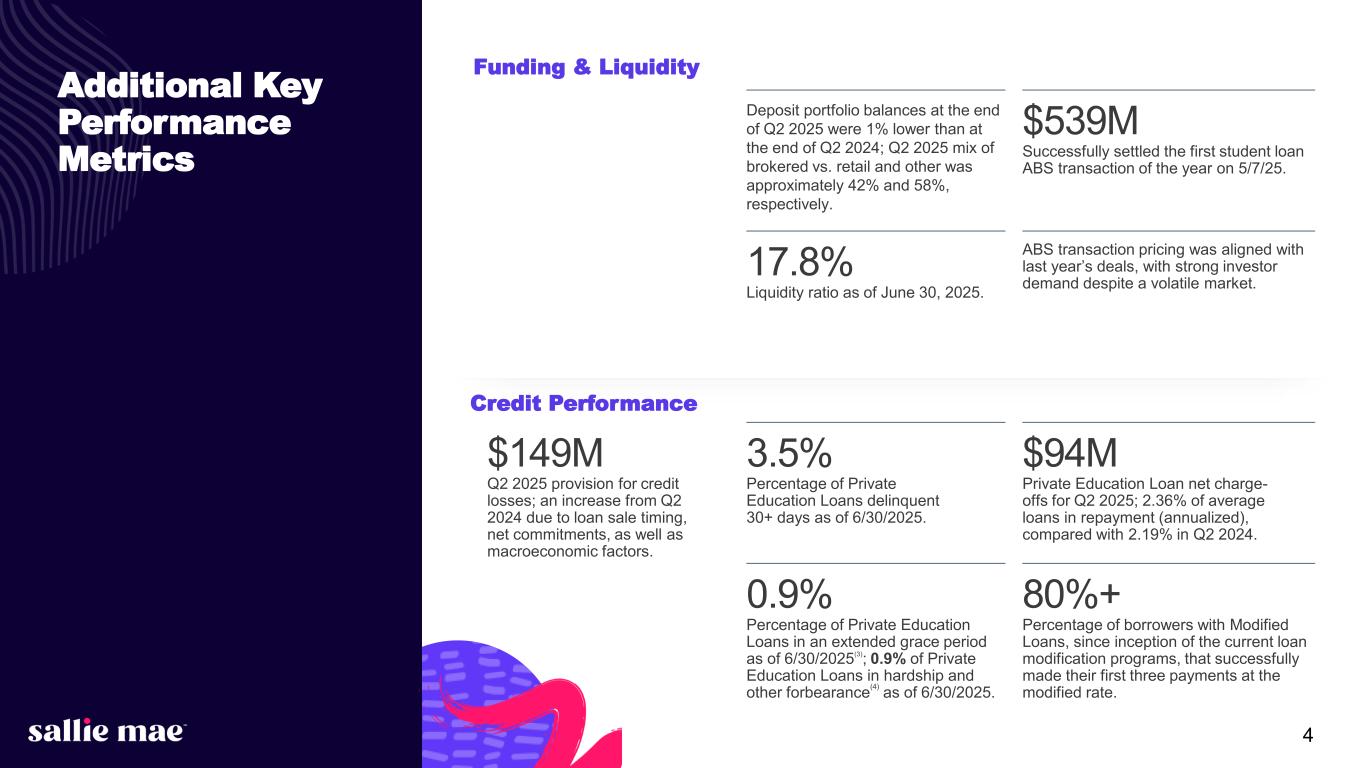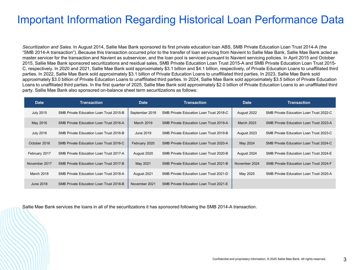 Confidential and proprietary information. © 2025 Sallie Mae Bank. All rights reserved. 3 Important Information Regarding Historical Loan Performance Data Securitization and Sales. In August 2014, Sallie Mae Bank sponsored its first private education loan ABS, SMB Private Education Loan Trust 2014-A (the “SMB 2014-A transaction”). Because this transaction occurred prior to the transfer of loan servicing from Navient to Sallie Mae Bank, Sallie Mae Bank acted as master servicer for the transaction and Navient as subservicer, and the loan pool is serviced pursuant to Navient servicing policies. In April 2015 and October 2015, Sallie Mae Bank sponsored securitizations and residual sales, SMB Private Education Loan Trust 2015-A and SMB Private Education Loan Trust 2015- C, respectively. In 2020 and 2021, Sallie Mae Bank sold approximately $3.1 billion and $4.1 billion, respectively, of Private Education Loans to unaffiliated third parties. In 2022, Sallie Mae Bank sold approximately $3.1 billion of Private Education Loans to unaffiliated third parties. In 2023, Sallie Mae Bank sold approximately $3.0 billion of Private Education Loans to unaffiliated third parties. In 2024, Sallie Mae Bank sold approximately $3.5 billion of Private Education Loans to unaffiliated third parties. In the first quarter of 2025, Sallie Mae Bank sold approximately $2.0 billion of Private Education Loans to an unaffiliated third party. Sallie Mae Bank also sponsored on-balance sheet term securitizations as follows: Sallie Mae Bank services the loans in all of the securitizations it has sponsored following the SMB 2014-A transaction. Date Transaction Date Transaction Date Transaction July 2015 SMB Private Education Loan Trust 2015-B September 2018 SMB Private Education Loan Trust 2018-C August 2022 SMB Private Education Loan Trust 2022-C May 2016 SMB Private Education Loan Trust 2016-A March 2019 SMB Private Education Loan Trust 2019-A March 2023 SMB Private Education Loan Trust 2023-A July 2016 SMB Private Education Loan Trust 2016-B June 2019 SMB Private Education Loan Trust 2019-B August 2023 SMB Private Education Loan Trust 2023-C October 2016 SMB Private Education Loan Trust 2016-C February 2020 SMB Private Education Loan Trust 2020-A May 2024 SMB Private Education Loan Trust 2024-C February 2017 SMB Private Education Loan Trust 2017-A August 2020 SMB Private Education Loan Trust 2020-B August 2024 SMB Private Education Loan Trust 2024-E November 2017 SMB Private Education Loan Trust 2017-B May 2021 SMB Private Education Loan Trust 2021-B November 2024 SMB Private Education Loan Trust 2024-F March 2018 SMB Private Education Loan Trust 2018-A August 2021 SMB Private Education Loan Trust 2021-D May 2025 SMB Private Education Loan Trust 2025-A June 2018 SMB Private Education Loan Trust 2018-B November 2021 SMB Private Education Loan Trust 2021-E