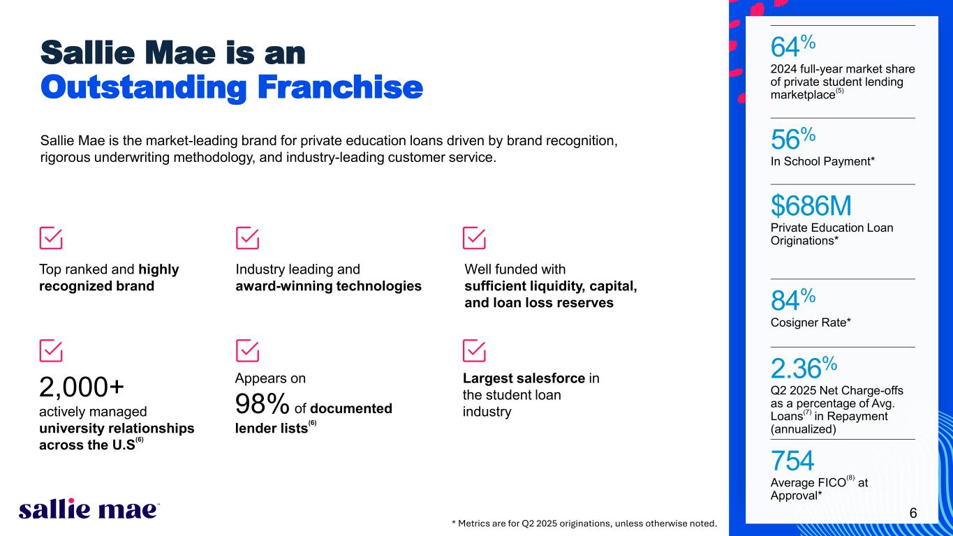 Confidential and proprietary information. © 2025 Sallie Mae Bank. All rights reserved. 5 Smart Option Serviced Portfolio: 30-59 Day Delinquencies(1) as a % of Loans in P&I Repayment(2) 0% 2% 4% 6% 8% 10% M ar -1 5 Ju n- 15 Se p- 15 D ec -1 5 M ar -1 6 Ju n- 16 Se p- 16 D ec -1 6 M ar -1 7 Ju n- 17 Se p- 17 D ec -1 7 M ar -1 8 Ju n- 18 Se p- 18 D ec -1 8 M ar -1 9 Ju n- 19 Se p- 19 D ec -1 9 M ar -2 0 Ju n- 20 Se p- 20 D ec -2 0 M ar -2 1 Ju n- 21 Se p- 21 D ec -2 1 M ar -2 2 Ju n- 22 Se p- 22 D ec -2 2 M ar -2 3 Ju n- 23 Se p- 23 D ec -2 3 M ar -2 4 Ju n- 24 Se p- 24 D ec -2 4 M ar -2 5 Ju n- 25 Pe rc en t o f P & I R ep ay m en t B al an ce Data for Sallie Mae Bank Aggregate of P&I Repayment Vintages 2015-2024(3), (4) Data as of June 30, 2025. (1) Data for delinquencies occurring prior to Q1 2021 and reflected in the graphs above is based on delinquency bucket period previously used (i.e., 31-60 days). Data for delinquencies occurring Q1 2021 onwards is based on an updated delinquency bucket period (i.e., 30-59 days) to conform with delinquency bucket periods defined by the FFIEC. (2) Loans in P&I Repayment include only those loans for which scheduled principal and interest payments were due at the end of the applicable monthly reporting period. (3) P&I Repayment Vintage is defined as the calendar year during which a borrower is first required to make full principal and interest payments on the loan. (4) Vintage performance history excludes data points for a vintage when the balance of loans in P&I Repayment outstanding in that vintage constitutes less than 1% of total balance of loans in P&I Repayment outstanding for all vintages.