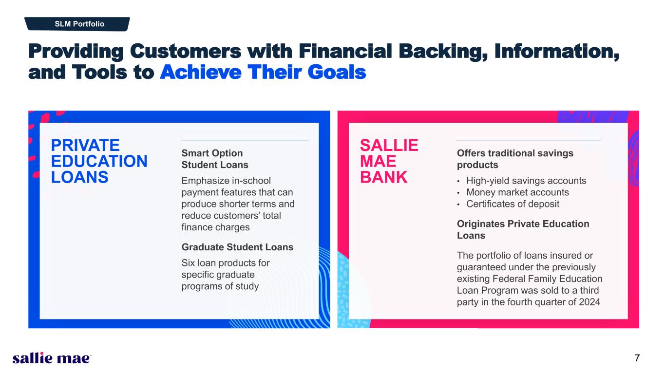Confidential and proprietary information. © 2025 Sallie Mae Bank. All rights reserved. 6 Smart Option Serviced Portfolio: 30-59 Day Delinquencies(1) as a % of Loans in P&I Repayment(2) continued 0% 2% 4% 6% 8% 10% M ar -1 5 Ju n- 15 Se p- 15 D ec -1 5 M ar -1 6 Ju n- 16 Se p- 16 D ec -1 6 M ar -1 7 Ju n- 17 Se p- 17 D ec -1 7 M ar -1 8 Ju n- 18 Se p- 18 D ec -1 8 M ar -1 9 Ju n- 19 Se p- 19 D ec -1 9 M ar -2 0 Ju n- 20 Se p- 20 D ec -2 0 M ar -2 1 Ju n- 21 Se p- 21 D ec -2 1 M ar -2 2 Ju n- 22 Se p- 22 D ec -2 2 M ar -2 3 Ju n- 23 Se p- 23 D ec -2 3 M ar -2 4 Ju n- 24 Se p- 24 D ec -2 4 M ar -2 5 Ju n- 25 Pe rc en t o f P & I R ep ay m en t B al an ce Data for Sallie Mae Bank P&I Repayment Vintages 2015-2024(3), (4) SLM Bank 2015 Vintage SLM Bank 2016 Vintage SLM Bank 2017 Vintage SLM Bank 2018 Vintage SLM Bank 2019 Vintage SLM Bank 2020 Vintage SLM Bank 2021 Vintage SLM Bank 2022 Vintage SLM Bank 2023 Vintage SLM Bank 2024 Vintage Data as of June 30, 2025. (1) Data for delinquencies occurring prior to Q1 2021 and reflected in the graphs above is based on delinquency bucket period previously used (i.e., 31-60 days). Data for delinquencies occurring Q1 2021 onwards is based on an updated delinquency bucket period (i.e., 30-59 days) to conform with delinquency bucket periods defined by the FFIEC. (2) Loans in P&I Repayment include only those loans for which scheduled principal and interest payments were due at the end of the applicable monthly reporting period. (3) P&I Repayment Vintage is defined as the calendar year during which a borrower is first required to make full principal and interest payments on the loan. (4) Vintage performance history excludes data points for a vintage when the balance of loans in P&I Repayment outstanding in that vintage constitutes less than 1% of total balance of loans in P&I Repayment outstanding for all vintages.
