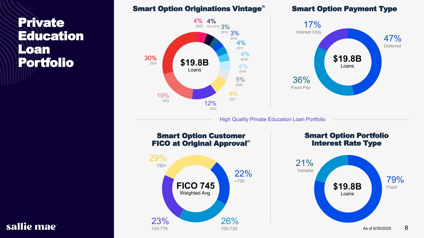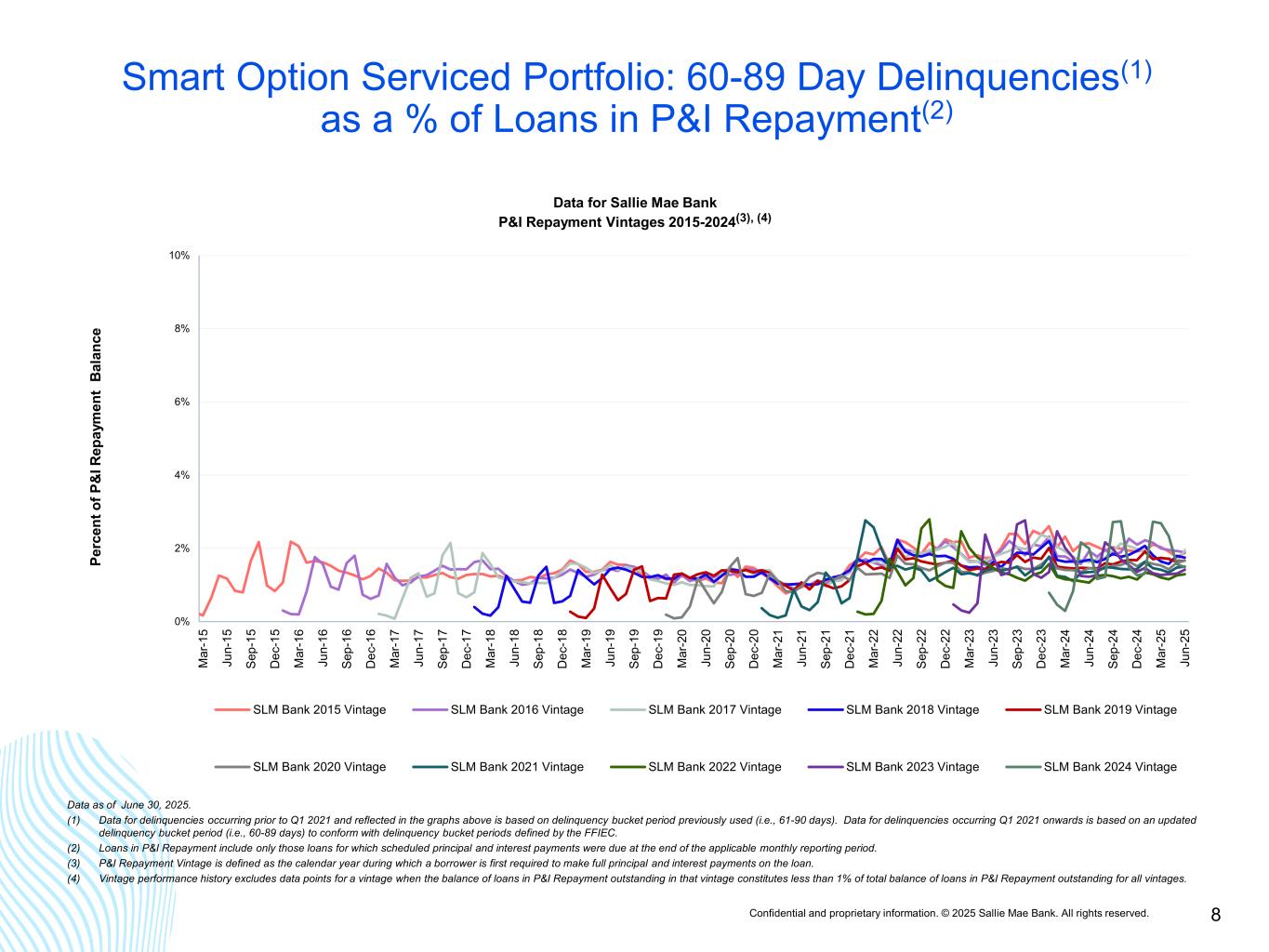 Confidential and proprietary information. © 2025 Sallie Mae Bank. All rights reserved. 7 Smart Option Serviced Portfolio: 60-89 Day Delinquencies(1) as a % of Loans in P&I Repayment(2) 0% 2% 4% 6% 8% 10% M ar -1 5 Ju n- 15 Se p- 15 D ec -1 5 M ar -1 6 Ju n- 16 Se p- 16 D ec -1 6 M ar -1 7 Ju n- 17 Se p- 17 D ec -1 7 M ar -1 8 Ju n- 18 Se p- 18 D ec -1 8 M ar -1 9 Ju n- 19 Se p- 19 D ec -1 9 M ar -2 0 Ju n- 20 Se p- 20 D ec -2 0 M ar -2 1 Ju n- 21 Se p- 21 D ec -2 1 M ar -2 2 Ju n- 22 Se p- 22 D ec -2 2 M ar -2 3 Ju n- 23 Se p- 23 D ec -2 3 M ar -2 4 Ju n- 24 Se p- 24 D ec -2 4 M ar -2 5 Ju n- 25 Pe rc en t o f P & I R ep ay m en t B al an ce Data for Sallie Mae Bank Aggregate of P&I Repayment Vintages 2015-2024(3), (4) Data as of June 30, 2025. (1) Data for delinquencies occurring prior to Q1 2021 and reflected in the graphs above is based on delinquency bucket period previously used (i.e., 61-90 days). Data for delinquencies occurring Q1 2021 onwards is based on an updated delinquency bucket period (i.e., 60-89 days) to conform with delinquency bucket periods defined by the FFIEC. (2) Loans in P&I Repayment include only those loans for which scheduled principal and interest payments were due at the end of the applicable monthly reporting period. (3) P&I Repayment Vintage is defined as the calendar year during which a borrower is first required to make full principal and interest payments on the loan. (4) Vintage performance history excludes data points for a vintage when the balance of loans in P&I Repayment outstanding in that vintage constitutes less than 1% of total balance of loans in P&I Repayment outstanding for all vintages.