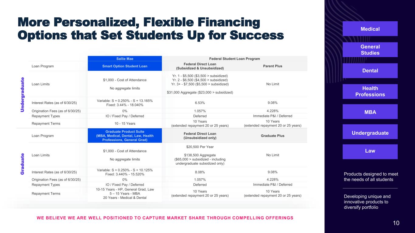 Confidential and proprietary information. © 2025 Sallie Mae Bank. All rights reserved. 9 Smart Option Serviced Portfolio: 90+ Day Delinquencies(1) as a % of Loans in P&I Repayment(2) continued 0% 2% 4% 6% 8% 10% M ar -1 5 Ju n- 15 Se p- 15 D ec -1 5 M ar -1 6 Ju n- 16 Se p- 16 D ec -1 6 M ar -1 7 Ju n- 17 Se p- 17 D ec -1 7 M ar -1 8 Ju n- 18 Se p- 18 D ec -1 8 M ar -1 9 Ju n- 19 Se p- 19 D ec -1 9 M ar -2 0 Ju n- 20 Se p- 20 D ec -2 0 M ar -2 1 Ju n- 21 Se p- 21 D ec -2 1 M ar -2 2 Ju n- 22 Se p- 22 D ec -2 2 M ar -2 3 Ju n- 23 Se p- 23 D ec -2 3 M ar -2 4 Ju n- 24 Se p- 24 D ec -2 4 M ar -2 5 Ju n- 25 Pe rc en t o f P & I R ep ay m en t B al an ce Data for Sallie Mae Bank Aggregate of P&I Repayment Vintages 2015-2024(3), (4) Data as of June 30, 2025. (1) Data for delinquencies occurring prior to Q1 2021 and reflected in the graphs above is based on delinquency bucket period previously used (i.e., 91 days and greater). Data for delinquencies occurring Q1 2021 onwards is based on an updated delinquency bucket period (i.e., 90 days and greater) to conform with delinquency bucket periods defined by the FFIEC. (2) Loans in P&I Repayment include only those loans for which scheduled principal and interest payments were due at the end of the applicable monthly reporting period. (3) P&I Repayment Vintage is defined as the calendar year during which a borrower is first required to make full principal and interest payments on the loan. (4) Vintage performance history excludes data points for a vintage when the balance of loans in P&I Repayment outstanding in that vintage constitutes less than 1% of total balance of loans in P&I Repayment outstanding for all vintages.