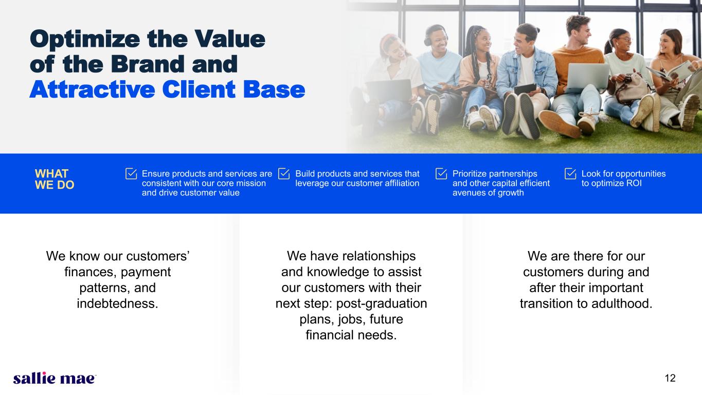 Confidential and proprietary information. © 2025 Sallie Mae Bank. All rights reserved. 11 Smart Option Serviced Portfolio: Forbearance as a % of Loans in P&I Repayment(1), (2) 0% 5% 10% 15% 20% 25% 30% 35% 40% 45% M ar -1 5 Ju n- 15 Se p- 15 D ec -1 5 M ar -1 6 Ju n- 16 Se p- 16 D ec -1 6 M ar -1 7 Ju n- 17 Se p- 17 D ec -1 7 M ar -1 8 Ju n- 18 Se p- 18 D ec -1 8 M ar -1 9 Ju n- 19 Se p- 19 D ec -1 9 M ar -2 0 Ju n- 20 Se p- 20 D ec -2 0 M ar -2 1 Ju n- 21 Se p- 21 D ec -2 1 M ar -2 2 Ju n- 22 Se p- 22 D ec -2 2 M ar -2 3 Ju n- 23 Se p- 23 D ec -2 3 M ar -2 4 Ju n- 24 Se p- 24 D ec -2 4 M ar -2 5 Ju n- 25 Pe rc en t o f P & I R ep ay m en t a nd F or be ar an ce B al an ce Data for Sallie Mae Bank Aggregate of P&I Repayment Vintages 2015-2024(3), (4) Data as of June 30, 2025 (1) Loans in P&I Repayment include only those loans for which scheduled principal and interest payments were due at the end of the applicable monthly reporting period. (2) Forbearance includes loans in an extended grace period and loans that have been granted forbearance due to hardship or other factors (other than delinquent loans in disaster forbearance); provided, however, that with respect to loans granted COVID-related disaster forbearance, forbearance includes activity of current as well as delinquent loans. Due to the nature and limited timeframe of disaster forbearance, delinquent loans granted disaster forbearance are maintained in their pre- grant delinquency status, and as such, are not reflected on this forbearance slide (other than loans granted COVID-related disaster forbearance); rather, they are reflected as applicable in the delinquency buckets on the preceding slides. (3) P&I Repayment Vintage is defined as the calendar year during which a borrower is first required to make full principal and interest payments on the loan. (4) Vintage performance history excludes data points for a vintage when the balance of loans in P&I Repayment outstanding in that vintage constitutes less than 1% of total balance of loans in P&I Repayment outstanding for all vintages.