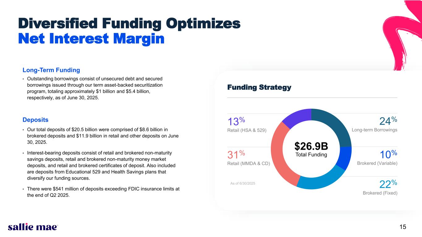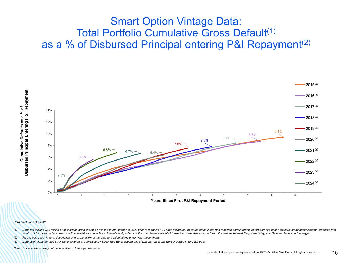 Confidential and proprietary information. © 2025 Sallie Mae Bank. All rights reserved. 14 Smart Option Serviced Portfolio: Annualized Gross Defaults(1) as a % of Loans in P&I Repayment(2) continued 0% 2% 4% 6% 8% 10% 12% 14% M ar -1 5 Ju n- 15 Se p- 15 D ec -1 5 M ar -1 6 Ju n- 16 Se p- 16 D ec -1 6 M ar -1 7 Ju n- 17 Se p- 17 D ec -1 7 M ar -1 8 Ju n- 18 Se p- 18 D ec -1 8 M ar -1 9 Ju n- 19 Se p- 19 D ec -1 9 M ar -2 0 Ju n- 20 Se p- 20 D ec -2 0 M ar -2 1 Ju n- 21 Se p- 21 D ec -2 1 M ar -2 2 Ju n- 22 Se p- 22 D ec -2 2 M ar -2 3 Ju n- 23 Se p- 23 D ec -2 3 M ar -2 4 Ju n- 24 Se p- 24 D ec -2 4 M ar -2 5 Ju n- 25 Pe rc en t o f P & I R ep ay m en t B al an ce Data for Sallie Mae Bank P&I Repayment Vintages 2015-2024(3), (4) SLM Bank 2015 Vintage SLM Bank 2016 Vintage SLM Bank 2017 Vintage SLM Bank 2018 Vintage SLM Bank 2019 Vintage SLM Bank 2020 Vintage SLM Bank 2021 Vintage SLM Bank 2022 Vintage SLM Bank 2023 Vintage SLM Bank 2024 Vintage Data as of June 30, 2025. (1) Does not include $13 million of delinquent loans charged off in the fourth quarter of 2022 prior to reaching 120 days of delinquency because those loans had received certain grants of forbearance under previous credit administration practices that would not be given under current credit administration practices. (2) Loans in P&I Repayment include only those loans for which scheduled principal and interest payments were due at the end of the applicable monthly reporting period. (3) P&I Repayment Vintage is defined as the calendar year during which a borrower is first required to make full principal and interest payments on the loan. (4) Vintage performance history excludes data points for a vintage when the balance of loans in P&I Repayment outstanding in that vintage constitutes less than 1% of total balance of loans in P&I Repayment outstanding for all vintages.