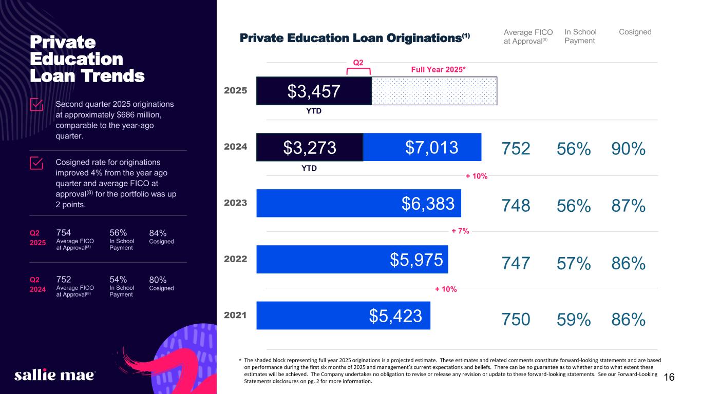 Confidential and proprietary information. © 2025 Sallie Mae Bank. All rights reserved. 15 Smart Option Vintage Data: Total Portfolio Cumulative Gross Default(1) as a % of Disbursed Principal entering P&I Repayment(2) 9.4% 8.7% 8.4% 7.8% 7.6% 6.4% 6.7% 6.8% 5.6% 2.5% 0% 2% 4% 6% 8% 10% 12% 14% 0 1 2 3 4 5 6 7 8 9 10 C um ul at iv e D ef au lts a s a % o f D is bu rs ed P rin ci pa l En te rin g P & I R ep ay m en t Years Since First P&I Repayment Period 2015⁽³⁾ 2016⁽³⁾ 2017⁽³⁾ 2018⁽³⁾ 2019⁽³⁾ 2020⁽³⁾ 2021⁽³⁾ 2022⁽³⁾ 2023⁽³⁾ 2024⁽³⁾ Data as of June 30, 2025. (1) Does not include $13 million of delinquent loans charged off in the fourth quarter of 2022 prior to reaching 120 days delinquent because those loans had received certain grants of forbearance under previous credit administration practices that would not be given under current credit administration practices. The relevant portions of the cumulative amount of those loans are also excluded from the various Interest Only, Fixed Pay, and Deferred tables on this page. (2) Please see page 41 for a description and explanation of the data and calculations underlying these charts. (3) Data as of June 30, 2025. All loans covered are serviced by Sallie Mae Bank, regardless of whether the loans were included in an ABS trust. Note: Historical trends may not be indicative of future performance.