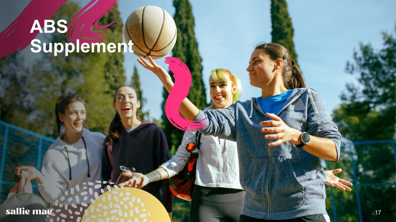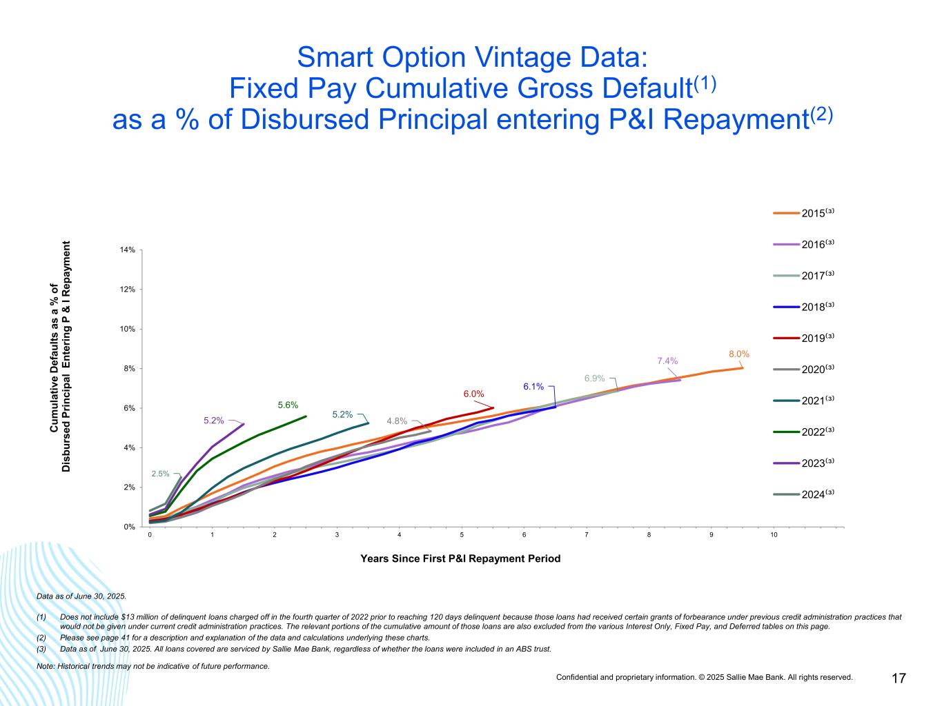 Confidential and proprietary information. © 2025 Sallie Mae Bank. All rights reserved. 16 Smart Option Vintage Data: Interest Only Cumulative Gross Default(1) as a % of Disbursed Principal entering P&I Repayment(2) 3.9% 3.3% 3.3% 3.1% 3.3% 3.0% 3.0% 3.1% 2.6% 1.6% 0% 2% 4% 6% 8% 10% 12% 14% 0 1 2 3 4 5 6 7 8 9 10 C um ul at iv e D ef au lts a s a % o f D is bu rs ed P rin ci pa l En te rin g P & I R ep ay m en t Years Since First P&I Repayment Period 2015⁽³⁾ 2016⁽³⁾ 2017⁽³⁾ 2018⁽³⁾ 2019⁽³⁾ 2020⁽³⁾ 2021⁽³⁾ 2022⁽³⁾ 2023⁽³⁾ 2024⁽³⁾ Data as of June 30, 2025. (1) Does not include $13 million of delinquent loans charged off in the fourth quarter of 2022 prior to reaching 120 days delinquent because those loans had received certain grants of forbearance under previous credit administration practices that would not be given under current credit administration practices. The relevant portions of the cumulative amount of those loans are also excluded from the various Interest Only, Fixed Pay, and Deferred tables on this page. (2) Please see page 41 for a description and explanation of the data and calculations underlying these charts. (3) Data as of June 30, 2025. All loans covered are serviced by Sallie Mae Bank, regardless of whether the loans were included in an ABS trust. Note: Historical trends may not be indicative of future performance.