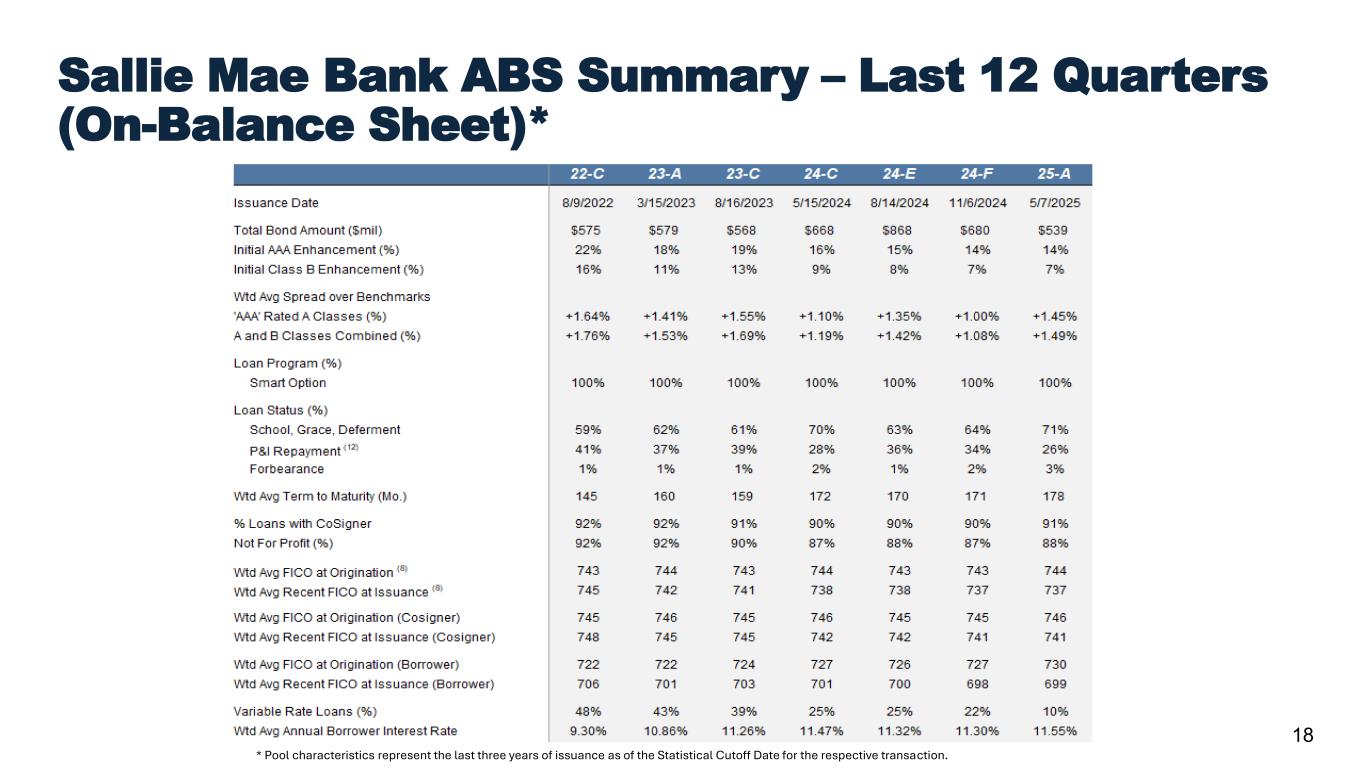 Confidential and proprietary information. © 2025 Sallie Mae Bank. All rights reserved. 17 Smart Option Vintage Data: Fixed Pay Cumulative Gross Default(1) as a % of Disbursed Principal entering P&I Repayment(2) 8.0% 7.4% 6.9% 6.1% 6.0% 4.8% 5.2% 5.6% 5.2% 2.5% 0% 2% 4% 6% 8% 10% 12% 14% 0 1 2 3 4 5 6 7 8 9 10 C um ul at iv e D ef au lts a s a % o f D is bu rs ed P rin ci pa l En te rin g P & I R ep ay m en t Years Since First P&I Repayment Period 2015⁽³⁾ 2016⁽³⁾ 2017⁽³⁾ 2018⁽³⁾ 2019⁽³⁾ 2020⁽³⁾ 2021⁽³⁾ 2022⁽³⁾ 2023⁽³⁾ 2024⁽³⁾ Data as of June 30, 2025. (1) Does not include $13 million of delinquent loans charged off in the fourth quarter of 2022 prior to reaching 120 days delinquent because those loans had received certain grants of forbearance under previous credit administration practices that would not be given under current credit administration practices. The relevant portions of the cumulative amount of those loans are also excluded from the various Interest Only, Fixed Pay, and Deferred tables on this page. (2) Please see page 41 for a description and explanation of the data and calculations underlying these charts. (3) Data as of June 30, 2025. All loans covered are serviced by Sallie Mae Bank, regardless of whether the loans were included in an ABS trust. Note: Historical trends may not be indicative of future performance.