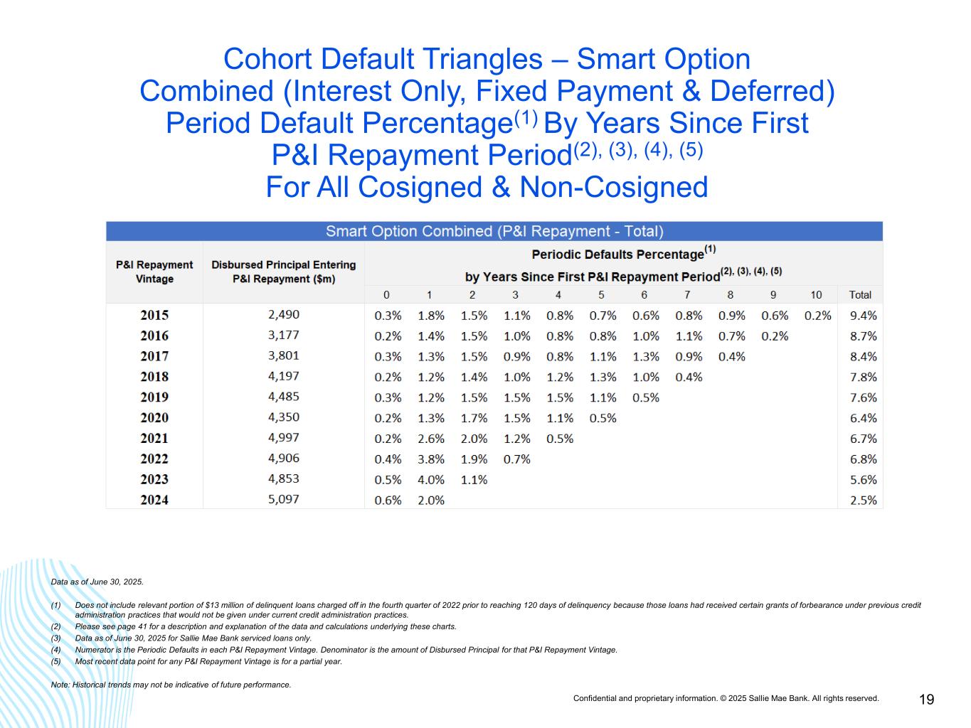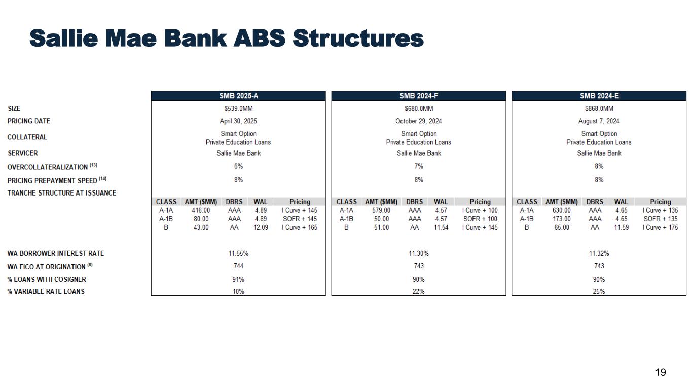 Confidential and proprietary information. © 2025 Sallie Mae Bank. All rights reserved. 18 Smart Option Vintage Data: Deferred Cumulative Gross Default(1) as a % of Disbursed Principal entering P&I Repayment(2) 13.2% 12.5% 12.4% 11.8% 11.2% 9.7% 10.0% 9.9% 7.6% 3.0% 0% 2% 4% 6% 8% 10% 12% 14% 0 1 2 3 4 5 6 7 8 9 10 C um ul at iv e D ef au lts a s a % o f D is bu rs ed P rin ci pa l En te rin g P & I R ep ay m en t Years Since First P&I Repayment Period 2015⁽³⁾ 2016⁽³⁾ 2017⁽³⁾ 2018⁽³⁾ 2019⁽³⁾ 2020⁽³⁾ 2021⁽³⁾ 2022⁽³⁾ 2023⁽³⁾ 2024⁽³⁾ Data as of June 30, 2025. (1) Does not include $13 million of delinquent loans charged off in the fourth quarter of 2022 prior to reaching 120 days delinquent because those loans had received certain grants of forbearance under previous credit administration practices that would not be given under current credit administration practices. The relevant portions of the cumulative amount of those loans are also excluded from the various Interest Only, Fixed Pay, and Deferred tables on this page. (2) Please see page 41 for a description and explanation of the data and calculations underlying these charts. (3) Data as of June 30, 2025. All loans covered are serviced by Sallie Mae Bank, regardless of whether the loans were included in an ABS trust. Note: Historical trends may not be indicative of future performance.