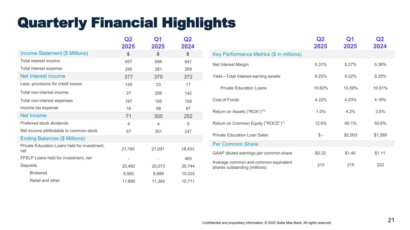 Confidential and proprietary information. © 2025 Sallie Mae Bank. All rights reserved. 20 Cohort Default Triangles – Smart Option Combined (Interest Only, Fixed Payment & Deferred) Period Default Percentage(1) By Years Since First P&I Repayment Period(2), (3), (4), (5) For All Cosigned Data as of June 30, 2025. (1) Does not include relevant portion of $13 million of delinquent loans charged off in the fourth quarter of 2022 prior to reaching 120 days of delinquency because those loans had received certain grants of forbearance under previous credit administration practices that would not be given under current credit administration practices. (2) Please see page 41 for a description and explanation of the data and calculations underlying these charts. (3) Data as of June 30, 2025 for Sallie Mae Bank serviced loans only. (4) Numerator is the Periodic Defaults in each P&I Repayment Vintage. Denominator is the amount of Disbursed Principal for that P&I Repayment Vintage. (5) Most recent data point for any P&I Repayment Vintage is for a partial year. Note: Historical trends may not be indicative of future performance.