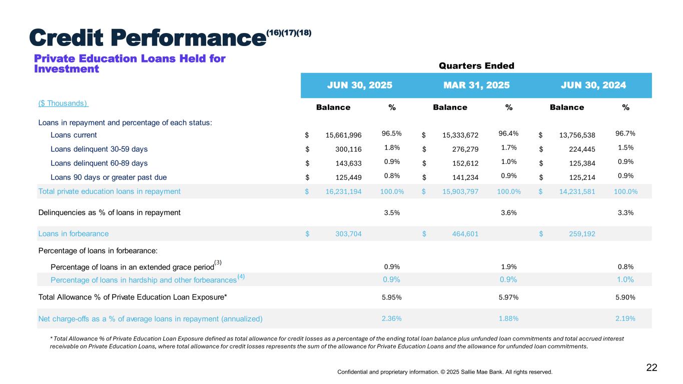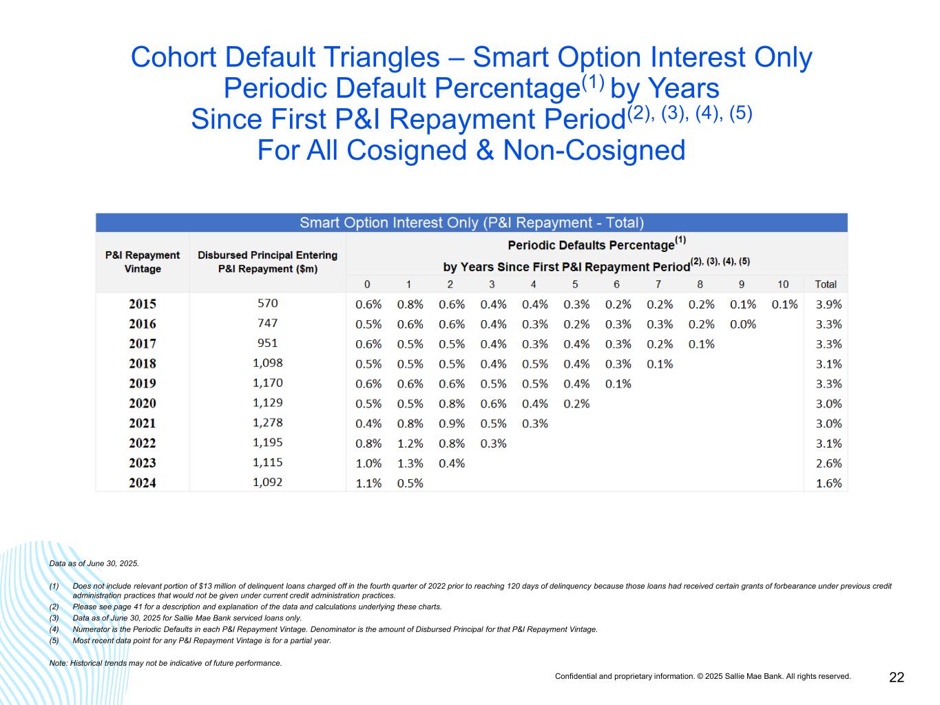 Confidential and proprietary information. © 2025 Sallie Mae Bank. All rights reserved. 21 Cohort Default Triangles – Smart Option Combined (Interest Only, Fixed Payment & Deferred) Period Default Percentage(1) By Years Since First P&I Repayment Period(2), (3), (4), (5) For All Non-Cosigned Data as of June 30, 2025. (1) Does not include relevant portion of $13 million of delinquent loans charged off in the fourth quarter of 2022 prior to reaching 120 days of delinquency because those loans had received certain grants of forbearance under previous credit administration practices that would not be given under current credit administration practices. (2) Please see page 41 for a description and explanation of the data and calculations underlying these charts. (3) Data as of June 30, 2025 for Sallie Mae Bank serviced loans only. (4) Numerator is the Periodic Defaults in each P&I Repayment Vintage. Denominator is the amount of Disbursed Principal for that P&I Repayment Vintage. (5) Most recent data point for any P&I Repayment Vintage is for a partial year. Note: Historical trends may not be indicative of future performance.