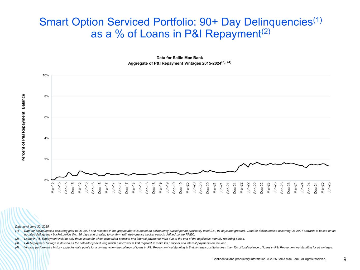 Confidential and proprietary information. © 2025 Sallie Mae Bank. All rights reserved. 8 Smart Option Serviced Portfolio: 60-89 Day Delinquencies(1) as a % of Loans in P&I Repayment(2) Continued 0% 2% 4% 6% 8% 10% M ar -1 5 Ju n- 15 Se p- 15 D ec -1 5 M ar -1 6 Ju n- 16 Se p- 16 D ec -1 6 M ar -1 7 Ju n- 17 Se p- 17 D ec -1 7 M ar -1 8 Ju n- 18 Se p- 18 D ec -1 8 M ar -1 9 Ju n- 19 Se p- 19 D ec -1 9 M ar -2 0 Ju n- 20 Se p- 20 D ec -2 0 M ar -2 1 Ju n- 21 Se p- 21 D ec -2 1 M ar -2 2 Ju n- 22 Se p- 22 D ec -2 2 M ar -2 3 Ju n- 23 Se p- 23 D ec -2 3 M ar -2 4 Ju n- 24 Se p- 24 D ec -2 4 M ar -2 5 Ju n- 25 Pe rc en t o f P & I R ep ay m en t B al an ce Data for Sallie Mae Bank P&I Repayment Vintages 2015-2024(3), (4) SLM Bank 2015 Vintage SLM Bank 2016 Vintage SLM Bank 2017 Vintage SLM Bank 2018 Vintage SLM Bank 2019 Vintage SLM Bank 2020 Vintage SLM Bank 2021 Vintage SLM Bank 2022 Vintage SLM Bank 2023 Vintage SLM Bank 2024 Vintage Data as of June 30, 2025. (1) Data for delinquencies occurring prior to Q1 2021 and reflected in the graphs above is based on delinquency bucket period previously used (i.e., 61-90 days). Data for delinquencies occurring Q1 2021 onwards is based on an updated delinquency bucket period (i.e., 60-89 days) to conform with delinquency bucket periods defined by the FFIEC. (2) Loans in P&I Repayment include only those loans for which scheduled principal and interest payments were due at the end of the applicable monthly reporting period. (3) P&I Repayment Vintage is defined as the calendar year during which a borrower is first required to make full principal and interest payments on the loan. (4) Vintage performance history excludes data points for a vintage when the balance of loans in P&I Repayment outstanding in that vintage constitutes less than 1% of total balance of loans in P&I Repayment outstanding for all vintages.