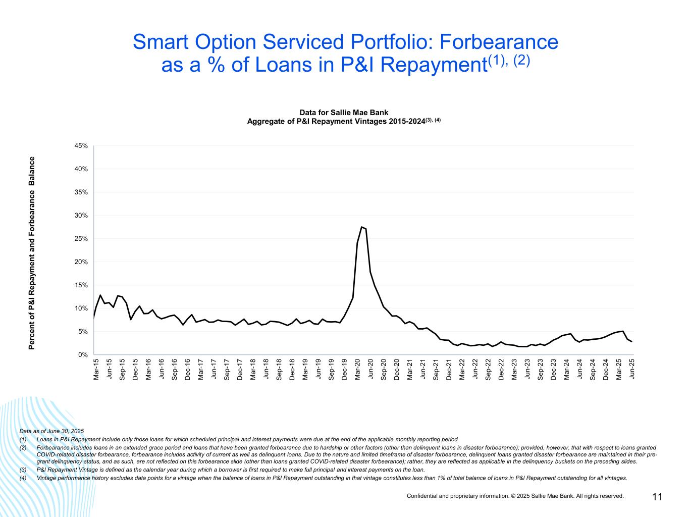 Confidential and proprietary information. © 2025 Sallie Mae Bank. All rights reserved. 10 Smart Option Serviced Portfolio: 90+ Day Delinquencies(1) as a % of Loans in P&I Repayment(2) 0% 2% 4% 6% 8% 10% M ar -1 5 Ju n- 15 Se p- 15 D ec -1 5 M ar -1 6 Ju n- 16 Se p- 16 D ec -1 6 M ar -1 7 Ju n- 17 Se p- 17 D ec -1 7 M ar -1 8 Ju n- 18 Se p- 18 D ec -1 8 M ar -1 9 Ju n- 19 Se p- 19 D ec -1 9 M ar -2 0 Ju n- 20 Se p- 20 D ec -2 0 M ar -2 1 Ju n- 21 Se p- 21 D ec -2 1 M ar -2 2 Ju n- 22 Se p- 22 D ec -2 2 M ar -2 3 Ju n- 23 Se p- 23 D ec -2 3 M ar -2 4 Ju n- 24 Se p- 24 D ec -2 4 M ar -2 5 Ju n- 25 Pe rc en t o f P & I R ep ay m en t B al an ce Data for Sallie Mae Bank P&I Repayment Vintages 2015-2024(3), (4) SLM Bank 2015 Vintage SLM Bank 2016 Vintage SLM Bank 2017 Vintage SLM Bank 2018 Vintage SLM Bank 2019 Vintage SLM Bank 2020 Vintage SLM Bank 2021 Vintage SLM Bank 2022 Vintage SLM Bank 2023 Vintage SLM Bank 2024 Vintage Data as of June 30, 2025. (1) Data for delinquencies occurring prior to Q1 2021 and reflected in the graphs above is based on delinquency bucket period previously used (i.e., 91 days and greater). Data for delinquencies occurring Q1 2021 onwards is based on an updated delinquency bucket period (i.e., 90 days and greater) to conform with delinquency bucket periods defined by the FFIEC. (2) Loans in P&I Repayment include only those loans for which scheduled principal and interest payments were due at the end of the applicable monthly reporting period. (3) P&I Repayment Vintage is defined as the calendar year during which a borrower is first required to make full principal and interest payments on the loan. (4) Vintage performance history excludes data points for a vintage when the balance of loans in P&I Repayment outstanding in that vintage constitutes less than 1% of total balance of loans in P&I Repayment outstanding for all vintages.