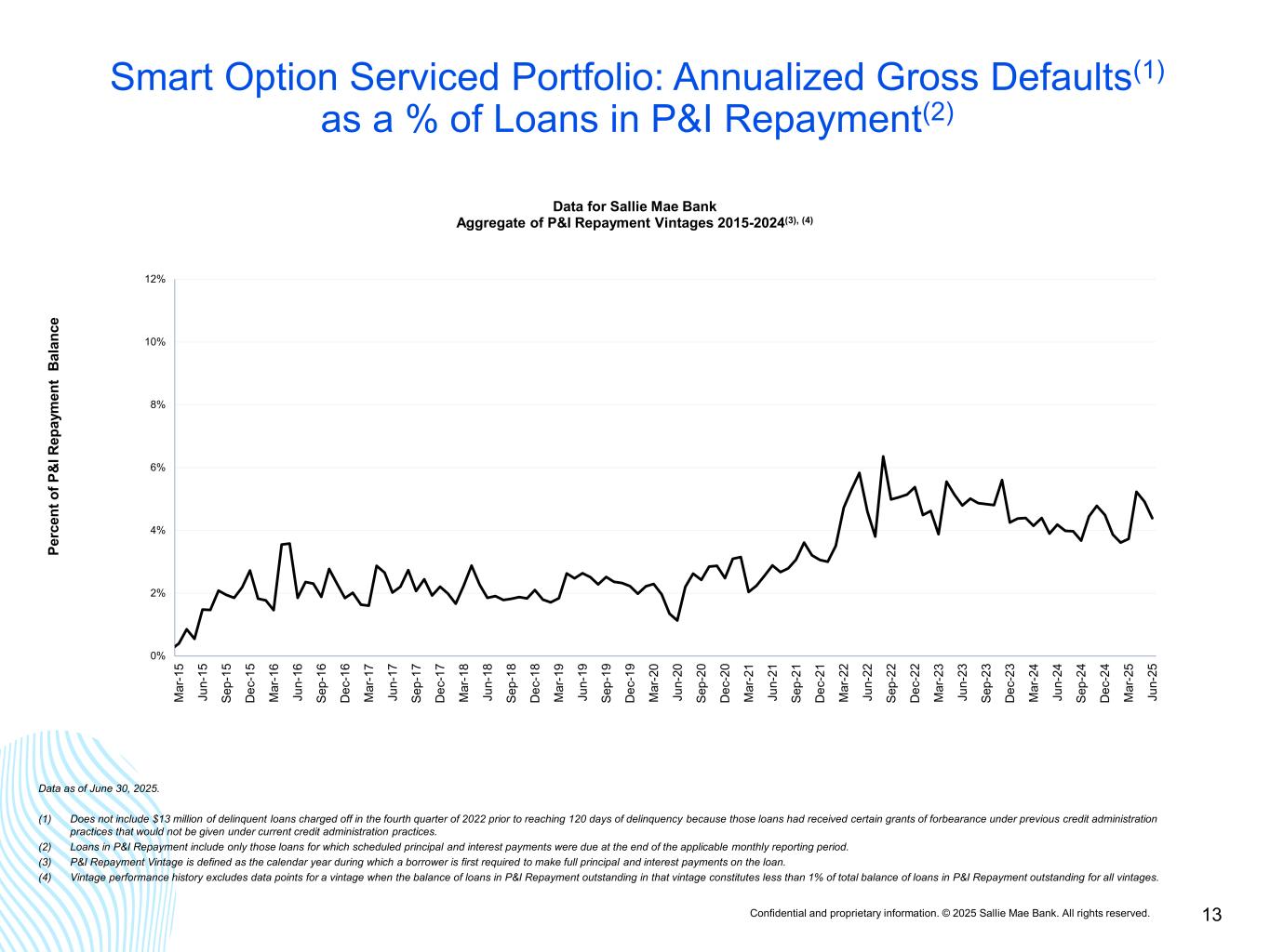 Confidential and proprietary information. © 2025 Sallie Mae Bank. All rights reserved. 12 Smart Option Serviced Portfolio: Forbearance as a % of Loans in P&I Repayment(1), (2) continued 0% 5% 10% 15% 20% 25% 30% 35% 40% 45% M ar -1 5 Ju n- 15 Se p- 15 D ec -1 5 M ar -1 6 Ju n- 16 Se p- 16 D ec -1 6 M ar -1 7 Ju n- 17 Se p- 17 D ec -1 7 M ar -1 8 Ju n- 18 Se p- 18 D ec -1 8 M ar -1 9 Ju n- 19 Se p- 19 D ec -1 9 M ar -2 0 Ju n- 20 Se p- 20 D ec -2 0 M ar -2 1 Ju n- 21 Se p- 21 D ec -2 1 M ar -2 2 Ju n- 22 Se p- 22 D ec -2 2 M ar -2 3 Ju n- 23 Se p- 23 D ec -2 3 M ar -2 4 Ju n- 24 Se p- 24 D ec -2 4 M ar -2 5 Ju n- 25 Pe rc en t o f P & I R ep ay m en t a nd F or be ar an ce B al an ce Data for Sallie Mae Bank P&I Repayment Vintages 2015-2024(3), (4) SLM Bank 2015 Vintage SLM Bank 2016 Vintage SLM Bank 2017 Vintage SLM Bank 2018 Vintage SLM Bank 2019 Vintage SLM Bank 2020 Vintage SLM Bank 2021 Vintage SLM Bank 2022 Vintage SLM Bank 2023 Vintage SLM Bank 2024 Vintage Data as of June 30, 2025 (1) Loans in P&I Repayment include only those loans for which scheduled principal and interest payments were due at the end of the applicable monthly reporting period. (2) Forbearance includes loans in an extended grace period and loans that have been granted forbearance due to hardship or other factors (other than delinquent loans in disaster forbearance); provided, however, that with respect to loans granted COVID-related disaster forbearance, forbearance includes activity of current as well as delinquent loans. Due to the nature and limited timeframe of disaster forbearance, delinquent loans granted disaster forbearance are maintained in their pre-grant delinquency status, and as such, are not reflected on this forbearance slide (other than loans granted COVID-related disaster forbearance); rather, they are reflected as applicable in the delinquency buckets on the preceding slides. (3) P&I Repayment Vintage is defined as the calendar year during which a borrower is first required to make full principal and interest payments on the loan. (4) Vintage performance history excludes data points for a vintage when the balance of loans in P&I Repayment outstanding in that vintage constitutes less than 1% of total balance of loans in P&I Repayment outstanding for all vintages.
