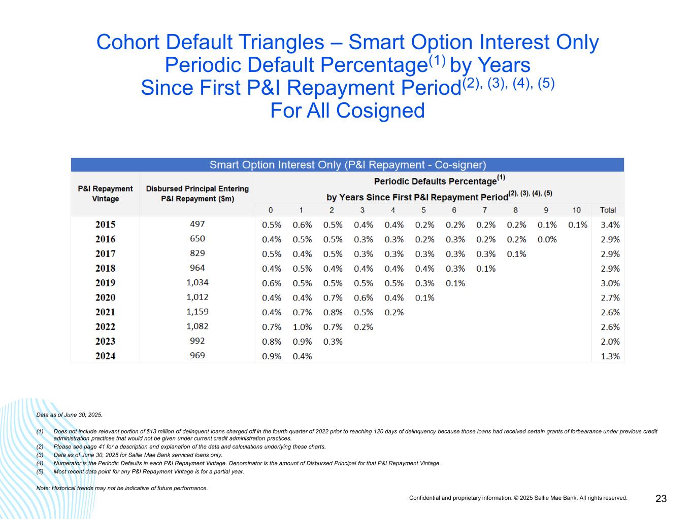 Confidential and proprietary information. © 2025 Sallie Mae Bank. All rights reserved. 22 Cohort Default Triangles – Smart Option Interest Only Periodic Default Percentage(1) by Years Since First P&I Repayment Period(2), (3), (4), (5) For All Cosigned & Non-Cosigned Data as of June 30, 2025. (1) Does not include relevant portion of $13 million of delinquent loans charged off in the fourth quarter of 2022 prior to reaching 120 days of delinquency because those loans had received certain grants of forbearance under previous credit administration practices that would not be given under current credit administration practices. (2) Please see page 41 for a description and explanation of the data and calculations underlying these charts. (3) Data as of June 30, 2025 for Sallie Mae Bank serviced loans only. (4) Numerator is the Periodic Defaults in each P&I Repayment Vintage. Denominator is the amount of Disbursed Principal for that P&I Repayment Vintage. (5) Most recent data point for any P&I Repayment Vintage is for a partial year. Note: Historical trends may not be indicative of future performance.