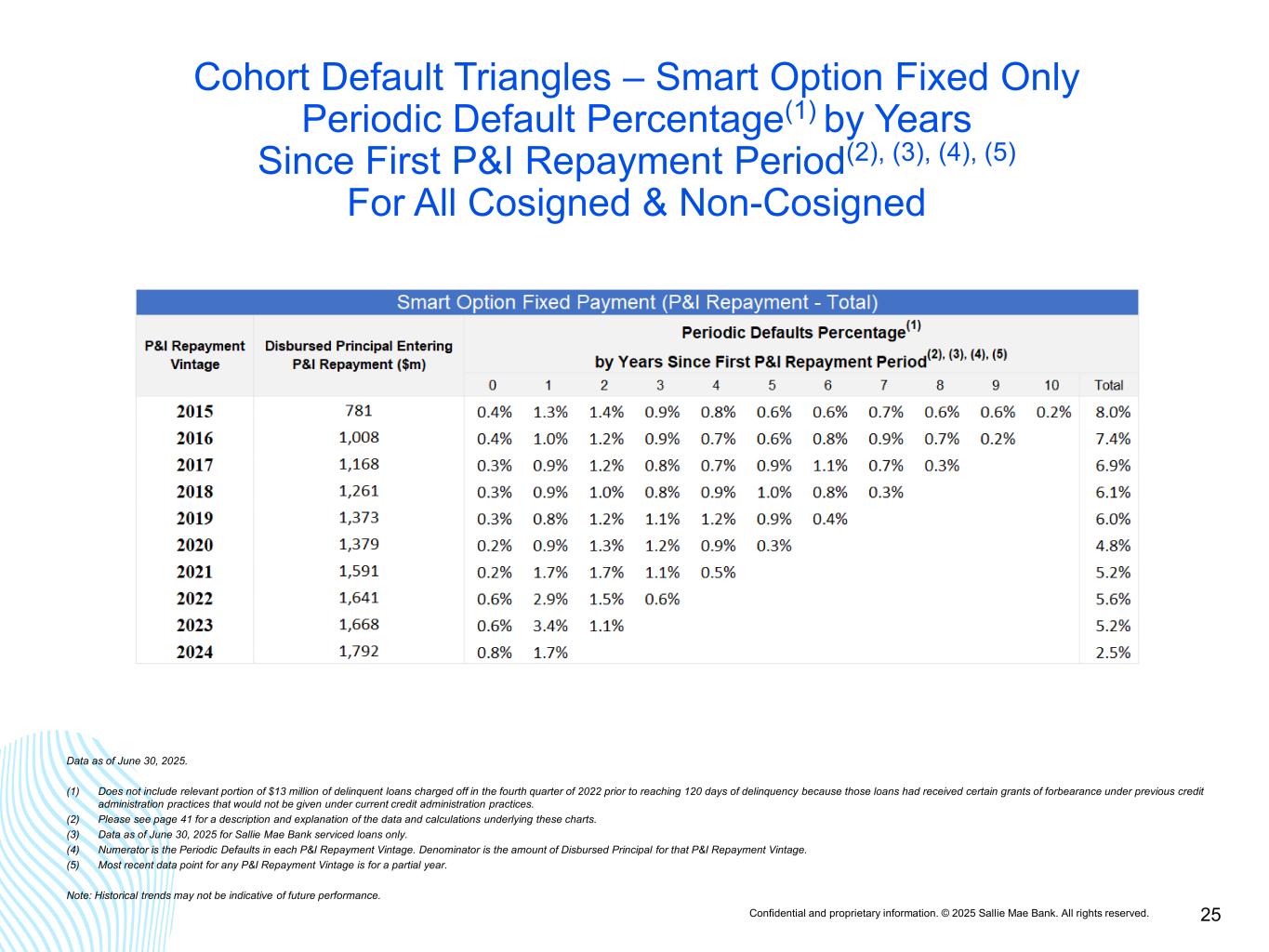 Confidential and proprietary information. © 2025 Sallie Mae Bank. All rights reserved. 24 Cohort Default Triangles – Smart Option Interest Only Periodic Default Percentage(1) by Years Since First P&I Repayment Period(2), (3), (4), (5) For All Non-Cosigned Data as of June 30, 2025. (1) Does not include relevant portion of $13 million of delinquent loans charged off in the fourth quarter of 2022 prior to reaching 120 days of delinquency because those loans had received certain grants of forbearance under previous credit administration practices that would not be given under current credit administration practices. (2) Please see page 41 for a description and explanation of the data and calculations underlying these charts. (3) Data as of June 30, 2025 for Sallie Mae Bank serviced loans only. (4) Numerator is the Periodic Defaults in each P&I Repayment Vintage. Denominator is the amount of Disbursed Principal for that P&I Repayment Vintage. (5) Most recent data point for any P&I Repayment Vintage is for a partial year. Note: Historical trends may not be indicative of future performance.