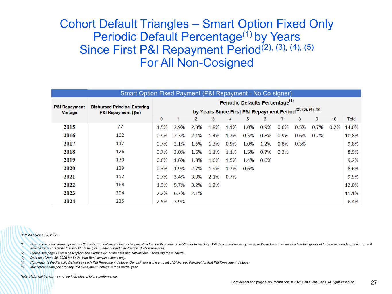 Confidential and proprietary information. © 2025 Sallie Mae Bank. All rights reserved. 26 Cohort Default Triangles – Smart Option Fixed Only Periodic Default Percentage(1) by Years Since First P&I Repayment Period(2), (3), (4), (5) For All Cosigned Data as of June 30, 2025. (1) Does not include relevant portion of $13 million of delinquent loans charged off in the fourth quarter of 2022 prior to reaching 120 days of delinquency because those loans had received certain grants of forbearance under previous credit administration practices that would not be given under current credit administration practices. (2) Please see page 41 for a description and explanation of the data and calculations underlying these charts. (3) Data as of June 30, 2025 for Sallie Mae Bank serviced loans only. (4) Numerator is the Periodic Defaults in each P&I Repayment Vintage. Denominator is the amount of Disbursed Principal for that P&I Repayment Vintage. (5) Most recent data point for any P&I Repayment Vintage is for a partial year. Note: Historical trends may not be indicative of future performance.