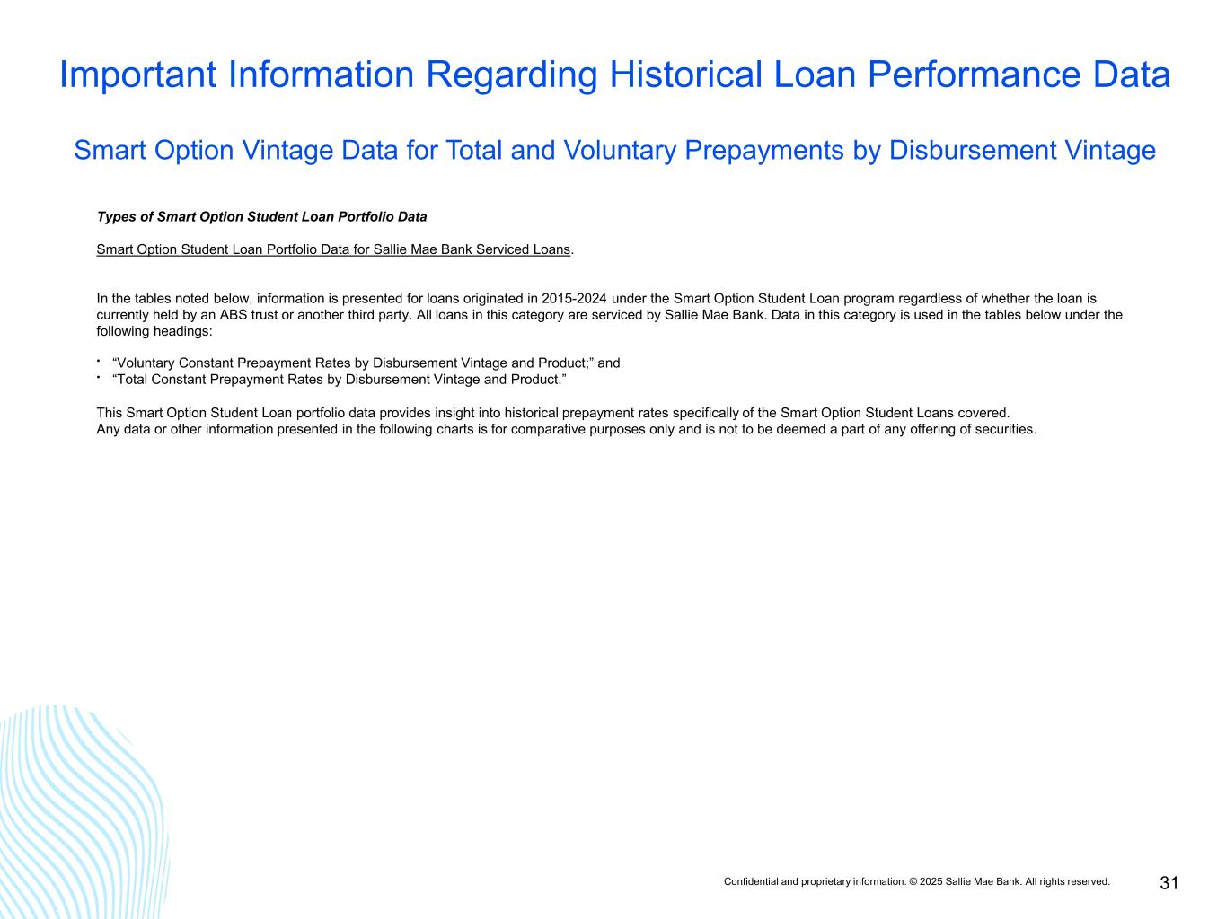 Confidential and proprietary information. © 2025 Sallie Mae Bank. All rights reserved. 31 Important Information Regarding Historical Loan Performance Data Smart Option Vintage Data for Total and Voluntary Prepayments by Disbursement Vintage Types of Smart Option Student Loan Portfolio Data Smart Option Student Loan Portfolio Data for Sallie Mae Bank Serviced Loans. In the tables noted below, information is presented for loans originated in 2015-2024 under the Smart Option Student Loan program regardless of whether the loan is currently held by an ABS trust or another third party. All loans in this category are serviced by Sallie Mae Bank. Data in this category is used in the tables below under the following headings: • “Voluntary Constant Prepayment Rates by Disbursement Vintage and Product;” and • “Total Constant Prepayment Rates by Disbursement Vintage and Product.” This Smart Option Student Loan portfolio data provides insight into historical prepayment rates specifically of the Smart Option Student Loans covered. Any data or other information presented in the following charts is for comparative purposes only and is not to be deemed a part of any offering of securities.