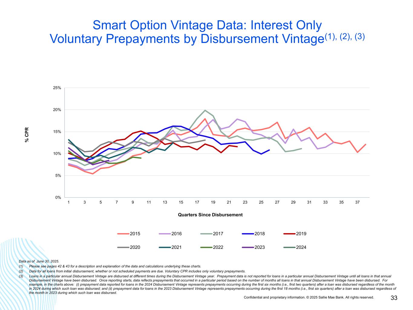 Confidential and proprietary information. © 2025 Sallie Mae Bank. All rights reserved. 32 Smart Option Vintage Data: All Products Voluntary Prepayments by Disbursement Vintage(1), (2), (3) 0% 5% 10% 15% 20% 25% 1 3 5 7 9 11 13 15 17 19 21 23 25 27 29 31 33 35 37 % C PR Quarters Since Disbursement 2015 2016 2017 2018 2019 2020 2021 2022 2023 2024 Data as of June 30, 2025. (1) Please see pages 42 & 43 for a description and explanation of the data and calculations underlying these charts. (2) Data for all loans from initial disbursement, whether or not scheduled payments are due. Voluntary CPR includes only voluntary prepayments. (3) Loans in a particular annual Disbursement Vintage are disbursed at different times during the Disbursement Vintage year. Prepayment data is not reported for loans in a particular annual Disbursement Vintage until all loans in that annual Disbursement Vintage have been disbursed. Once reporting starts, data reflects prepayments that occurred in a particular period based on the number of months all loans in that annual Disbursement Vintage have been disbursed. For example, in the charts above: (i) prepayment data reported for loans in the 2024 Disbursement Vintage represents prepayments occurring during the first six months (i.e., first two quarters) after a loan was disbursed regardless of the month in 2024 during which such loan was disbursed; and (ii) prepayment data for loans in the 2023 Disbursement Vintage represents prepayments occurring during the first 18 months (i.e., first six quarters) after a loan was disbursed regardless of the month in 2023 during which such loan was disbursed.