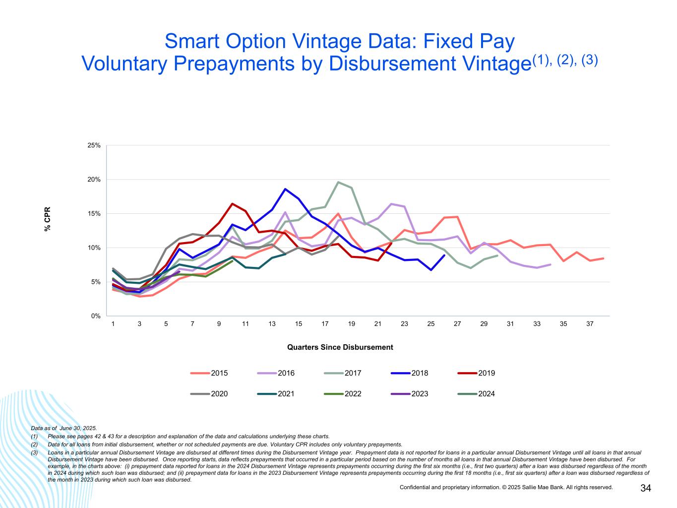Confidential and proprietary information. © 2025 Sallie Mae Bank. All rights reserved. 33 Smart Option Vintage Data: Interest Only Voluntary Prepayments by Disbursement Vintage(1), (2), (3) 0% 5% 10% 15% 20% 25% 1 3 5 7 9 11 13 15 17 19 21 23 25 27 29 31 33 35 37 % C PR Quarters Since Disbursement 2015 2016 2017 2018 2019 2020 2021 2022 2023 2024 Data as of June 30, 2025. (1) Please see pages 42 & 43 for a description and explanation of the data and calculations underlying these charts. (2) Data for all loans from initial disbursement, whether or not scheduled payments are due. Voluntary CPR includes only voluntary prepayments. (3) Loans in a particular annual Disbursement Vintage are disbursed at different times during the Disbursement Vintage year. Prepayment data is not reported for loans in a particular annual Disbursement Vintage until all loans in that annual Disbursement Vintage have been disbursed. Once reporting starts, data reflects prepayments that occurred in a particular period based on the number of months all loans in that annual Disbursement Vintage have been disbursed. For example, in the charts above: (i) prepayment data reported for loans in the 2024 Disbursement Vintage represents prepayments occurring during the first six months (i.e., first two quarters) after a loan was disbursed regardless of the month in 2024 during which such loan was disbursed; and (ii) prepayment data for loans in the 2023 Disbursement Vintage represents prepayments occurring during the first 18 months (i.e., first six quarters) after a loan was disbursed regardless of the month in 2023 during which such loan was disbursed.