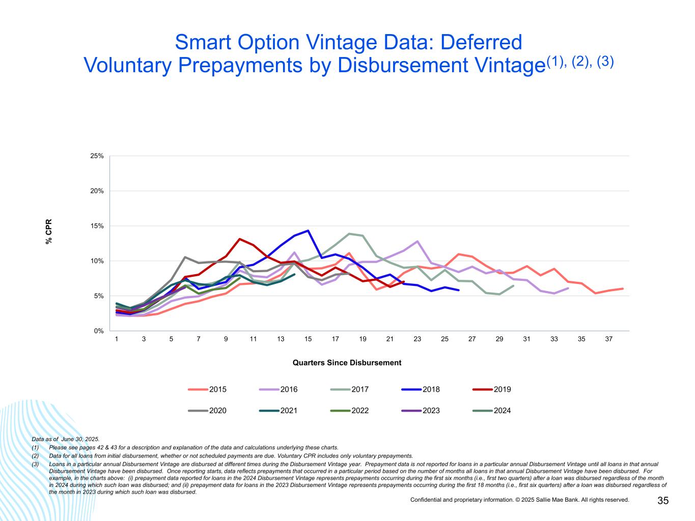 Confidential and proprietary information. © 2025 Sallie Mae Bank. All rights reserved. 34 Smart Option Vintage Data: Fixed Pay Voluntary Prepayments by Disbursement Vintage(1), (2), (3) 0% 5% 10% 15% 20% 25% 1 3 5 7 9 11 13 15 17 19 21 23 25 27 29 31 33 35 37 % C PR Quarters Since Disbursement 2015 2016 2017 2018 2019 2020 2021 2022 2023 2024 Data as of June 30, 2025. (1) Please see pages 42 & 43 for a description and explanation of the data and calculations underlying these charts. (2) Data for all loans from initial disbursement, whether or not scheduled payments are due. Voluntary CPR includes only voluntary prepayments. (3) Loans in a particular annual Disbursement Vintage are disbursed at different times during the Disbursement Vintage year. Prepayment data is not reported for loans in a particular annual Disbursement Vintage until all loans in that annual Disbursement Vintage have been disbursed. Once reporting starts, data reflects prepayments that occurred in a particular period based on the number of months all loans in that annual Disbursement Vintage have been disbursed. For example, in the charts above: (i) prepayment data reported for loans in the 2024 Disbursement Vintage represents prepayments occurring during the first six months (i.e., first two quarters) after a loan was disbursed regardless of the month in 2024 during which such loan was disbursed; and (ii) prepayment data for loans in the 2023 Disbursement Vintage represents prepayments occurring during the first 18 months (i.e., first six quarters) after a loan was disbursed regardless of the month in 2023 during which such loan was disbursed.