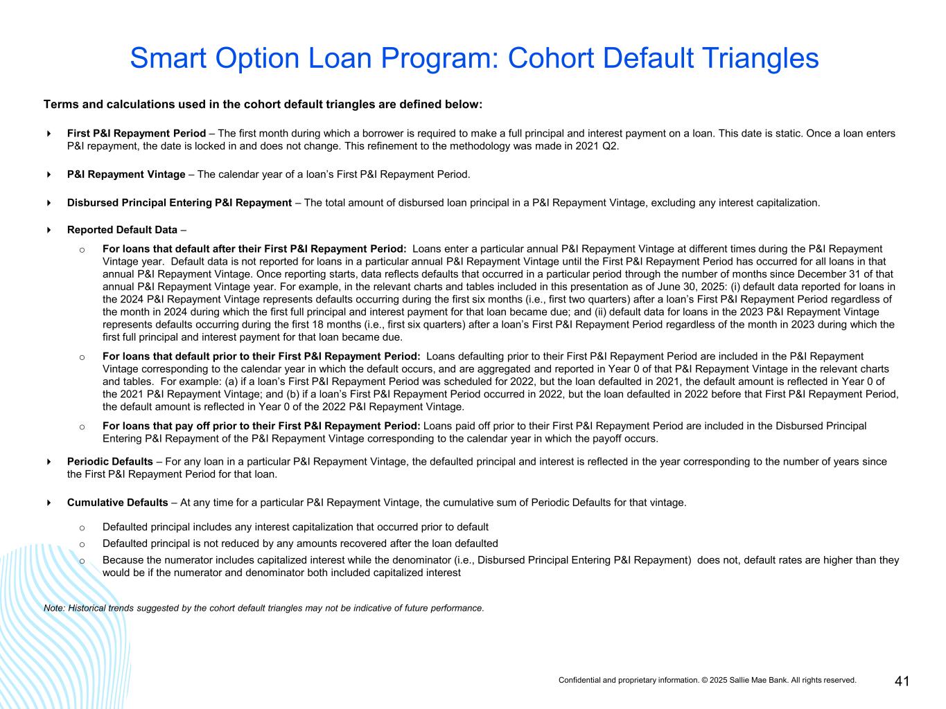 Confidential and proprietary information. © 2025 Sallie Mae Bank. All rights reserved. 41 Smart Option Loan Program: Cohort Default Triangles Terms and calculations used in the cohort default triangles are defined below: First P&I Repayment Period – The first month during which a borrower is required to make a full principal and interest payment on a loan. This date is static. Once a loan enters P&I repayment, the date is locked in and does not change. This refinement to the methodology was made in 2021 Q2. P&I Repayment Vintage – The calendar year of a loan’s First P&I Repayment Period. Disbursed Principal Entering P&I Repayment – The total amount of disbursed loan principal in a P&I Repayment Vintage, excluding any interest capitalization. Reported Default Data – o For loans that default after their First P&I Repayment Period: Loans enter a particular annual P&I Repayment Vintage at different times during the P&I Repayment Vintage year. Default data is not reported for loans in a particular annual P&I Repayment Vintage until the First P&I Repayment Period has occurred for all loans in that annual P&I Repayment Vintage. Once reporting starts, data reflects defaults that occurred in a particular period through the number of months since December 31 of that annual P&I Repayment Vintage year. For example, in the relevant charts and tables included in this presentation as of June 30, 2025: (i) default data reported for loans in the 2024 P&I Repayment Vintage represents defaults occurring during the first six months (i.e., first two quarters) after a loan’s First P&I Repayment Period regardless of the month in 2024 during which the first full principal and interest payment for that loan became due; and (ii) default data for loans in the 2023 P&I Repayment Vintage represents defaults occurring during the first 18 months (i.e., first six quarters) after a loan’s First P&I Repayment Period regardless of the month in 2023 during which the first full principal and interest payment for that loan became due. o For loans that default prior to their First P&I Repayment Period: Loans defaulting prior to their First P&I Repayment Period are included in the P&I Repayment Vintage corresponding to the calendar year in which the default occurs, and are aggregated and reported in Year 0 of that P&I Repayment Vintage in the relevant charts and tables. For example: (a) if a loan’s First P&I Repayment Period was scheduled for 2022, but the loan defaulted in 2021, the default amount is reflected in Year 0 of the 2021 P&I Repayment Vintage; and (b) if a loan’s First P&I Repayment Period occurred in 2022, but the loan defaulted in 2022 before that First P&I Repayment Period, the default amount is reflected in Year 0 of the 2022 P&I Repayment Vintage. o For loans that pay off prior to their First P&I Repayment Period: Loans paid off prior to their First P&I Repayment Period are included in the Disbursed Principal Entering P&I Repayment of the P&I Repayment Vintage corresponding to the calendar year in which the payoff occurs. Periodic Defaults – For any loan in a particular P&I Repayment Vintage, the defaulted principal and interest is reflected in the year corresponding to the number of years since the First P&I Repayment Period for that loan. Cumulative Defaults – At any time for a particular P&I Repayment Vintage, the cumulative sum of Periodic Defaults for that vintage. o Defaulted principal includes any interest capitalization that occurred prior to default o Defaulted principal is not reduced by any amounts recovered after the loan defaulted o Because the numerator includes capitalized interest while the denominator (i.e., Disbursed Principal Entering P&I Repayment) does not, default rates are higher than they would be if the numerator and denominator both included capitalized interest Note: Historical trends suggested by the cohort default triangles may not be indicative of future performance.