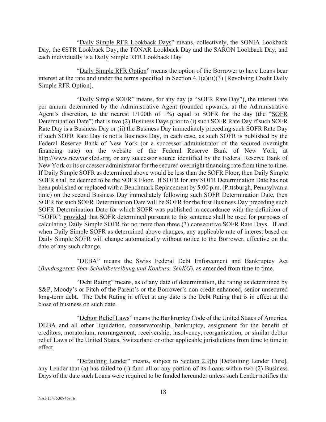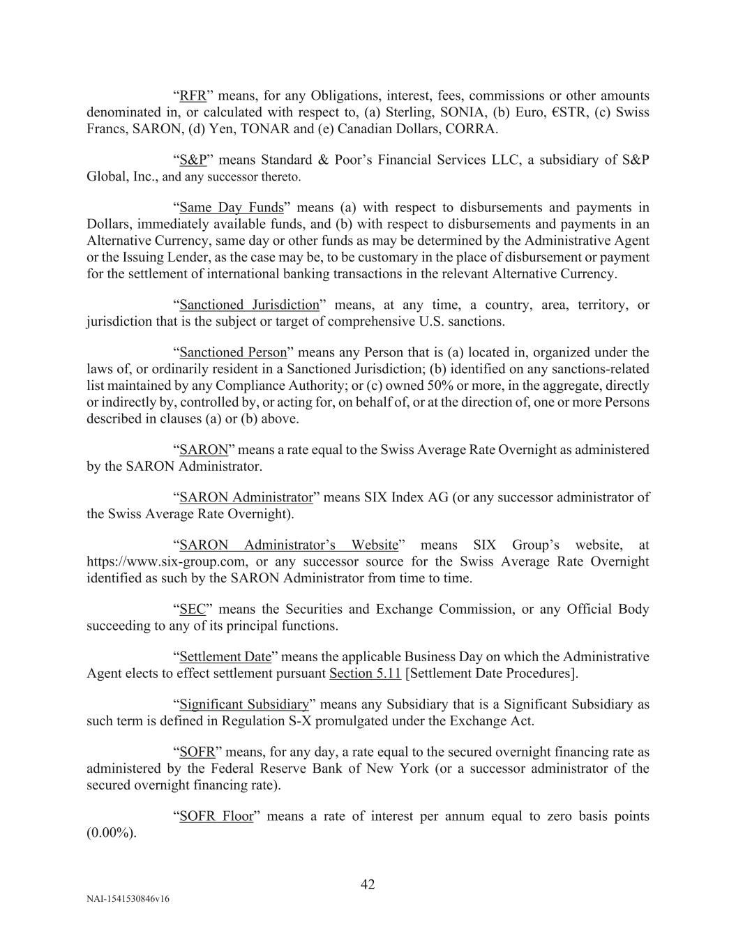 NAI-1541530846v16 17 Day is a Business Day, such Daily RFR Day or (B) if such Daily RFR Day is not a Business Day, the Business Day immediately preceding such Daily RFR Day, in each case, as such SARON is published by the SARON Administrator on the SARON Administrator’s Website; provided, that if by 5:00 pm (local time for the applicable Daily Simple RFR) on the second (2nd) Business Day immediately following any Daily Simple RFR Lookback Day, the RFR in respect of such Daily Simple RFR Lookback Day has not been published on the applicable RFR Administrator’s Website and a Benchmark Replacement Date with respect to the applicable Daily Simple RFR has not occurred, then the RFR for such Daily Simple RFR Lookback Day will be the RFR as published in respect of the first preceding Business Day for which such RFR was published on the Daily RFR Administrator’s Website; provided further that any RFR determined pursuant to this sentence shall be utilized for purposes of calculation of Daily Simple RFR for no more than three (3) consecutive Daily RFR Days; provided further that if the Daily Simple RFR as determined above would be less than the Floor, such rate shall be deemed to be the Floor for purposes of this Agreement. The Daily Simple RFR for each outstanding Daily RFR Loan shall be adjusted automatically as of the effective date of any change in the applicable RFR without notice to the Borrower. Determination by Administrative Agent of the Daily Simple RFR shall be deemed conclusive absent manifest error. “Daily RFR Adjustment” means with respect to Daily RFR Loans, the applicable adjustment set forth in the table below: RFR Daily RFR Adjustment €STR 0.0456% SONIA 0.0326% SARON -0.0571% TONAR -0.02923% “Daily RFR Administrator” means the SONIA Administrator, the €STR Administrator, the TONAR Administrator or the SARON Administrator, as applicable. “Daily RFR Business Day” means as applicable, for any Obligations, interest, fees, commissions or other amounts denominated in, or calculated with respect to (i) Euro, a TARGET Day, (ii) Sterling, a day on which banks are open for general business in London, (iii) Swiss Francs, a day on which banks are open for the settlement of payments and foreign exchange transactions in Zurich and (iv) Yen, a day on which banks are open for general business in Japan. “Daily RFR Day” has the meaning specified in the definition of “Daily Simple RFR”. “Daily RFR Loan” means a Loan that bears interest at a rate based on a Daily Simple RFR.