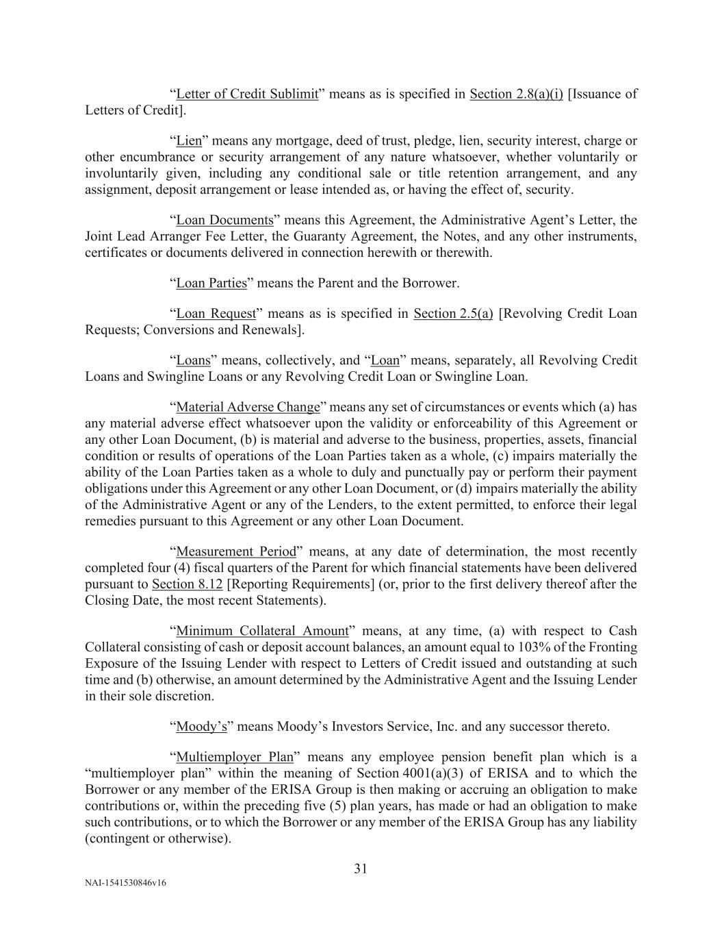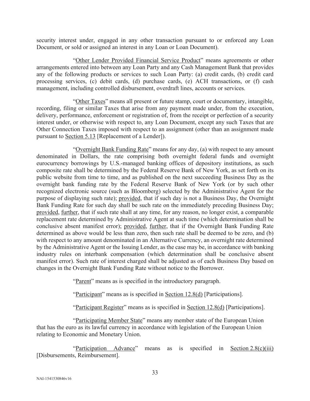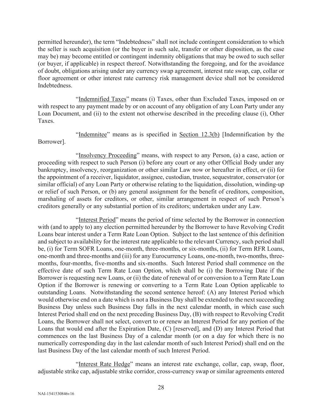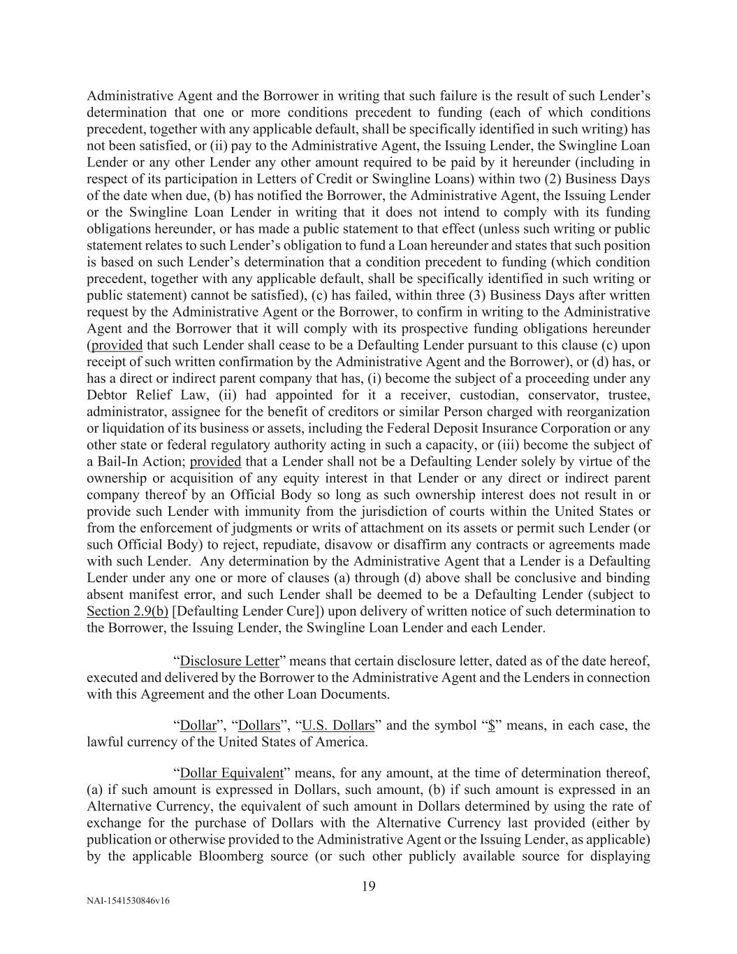 NAI-1541530846v16 5 (iv) above is not applicable and there is a split in Debt Rating by more than two Pricing Levels, then the Pricing Level that is one Pricing Level below the highest of the three Pricing Levels shall apply, (vii) each change in the spread resulting from a publicly announced change in such Debt Rating after the Closing Date shall be effective during the period commencing on the date of the public announcement thereof and ending on the date immediately preceding the effective date of the next such change (irrespective of when notice of such change shall have been furnished by the Borrower to the Administrative Agent pursuant to Section 8.13(e) [Debt Rating] or otherwise) and (viii) if the rating system of any such Rating Agency changes in any material respect, or if any such Rating Agency shall cease to be in the business of rating corporate debt obligations and no other Rating Agency has in effect a Debt Rating, the Borrower and the Lenders shall negotiate in good faith to amend this Agreement to reflect such changed rating system or the unavailability of Debt Rating from such Rating Agency or shall select a replacement Rating Agency and, pending the effectiveness of any such amendment or replacement, for purposes of determining the spread, the Debt Rating of the affected Rating Agency shall be deemed to be the Debt Rating of such Rating Agency most recently in effect prior to such change or cessation. “Applicable Time” means, with respect to any Loans and payments in any Alternative Currency, the local time in the place of settlement for such Alternative Currency as may be determined by the Administrative Agent or the Issuing Lender, as the case may be, to be necessary for timely settlement on the relevant date in accordance with normal banking procedures in the place of payment. “Approved Fund” means any Fund that is administered or managed by (a) a Lender, (b) an Affiliate of a Lender or (c) an entity or an Affiliate of an entity that administers or manages a Lender. “Asset Disposition” means the sale, transfer, license, lease or other disposition of any property by any Loan Party or any Subsidiary thereof, including any issuance of Equity Interests by any Subsidiary of any Loan Party to any Person that is not a Loan Party or any Subsidiary thereof. The term “Asset Disposition” shall not include (a) the sale of inventory in the ordinary course of business, (b) the transfer of assets to the Borrower or the Parent pursuant to any other transaction permitted pursuant to Section 9.3 [Liquidations, Mergers, Consolidations, Dispositions, Etc.], (c) the write-off, discount, sale or other disposition of defaulted or past-due receivables and similar obligations in the ordinary course of business and not undertaken as part of an accounts receivable financing transaction, (d) the disposition of any Swap, (e) dispositions of investments in cash and cash equivalents, (f) the transfer by any Loan Party of its assets to any other Loan Party, (g) the transfer by any Subsidiary of its assets to any Loan Party (provided that in connection with any transfer described in this clause (g), such Loan Party shall not pay more than an amount equal to the fair market value of such assets as determined in good faith at the time of such transfer) and (h) the transfer by any Subsidiary of its assets to any other Subsidiary. “Assignment and Assumption Agreement” means an assignment and assumption entered into by a Lender and an Eligible Assignee (with the consent of any party whose consent is required by Section 12.8 [Successors and Assigns]), and accepted by the Administrative Agent, in substantially the form of Exhibit A or any other form approved by the Administrative Agent. “Australian Dollars” means the lawful currency of Australia.