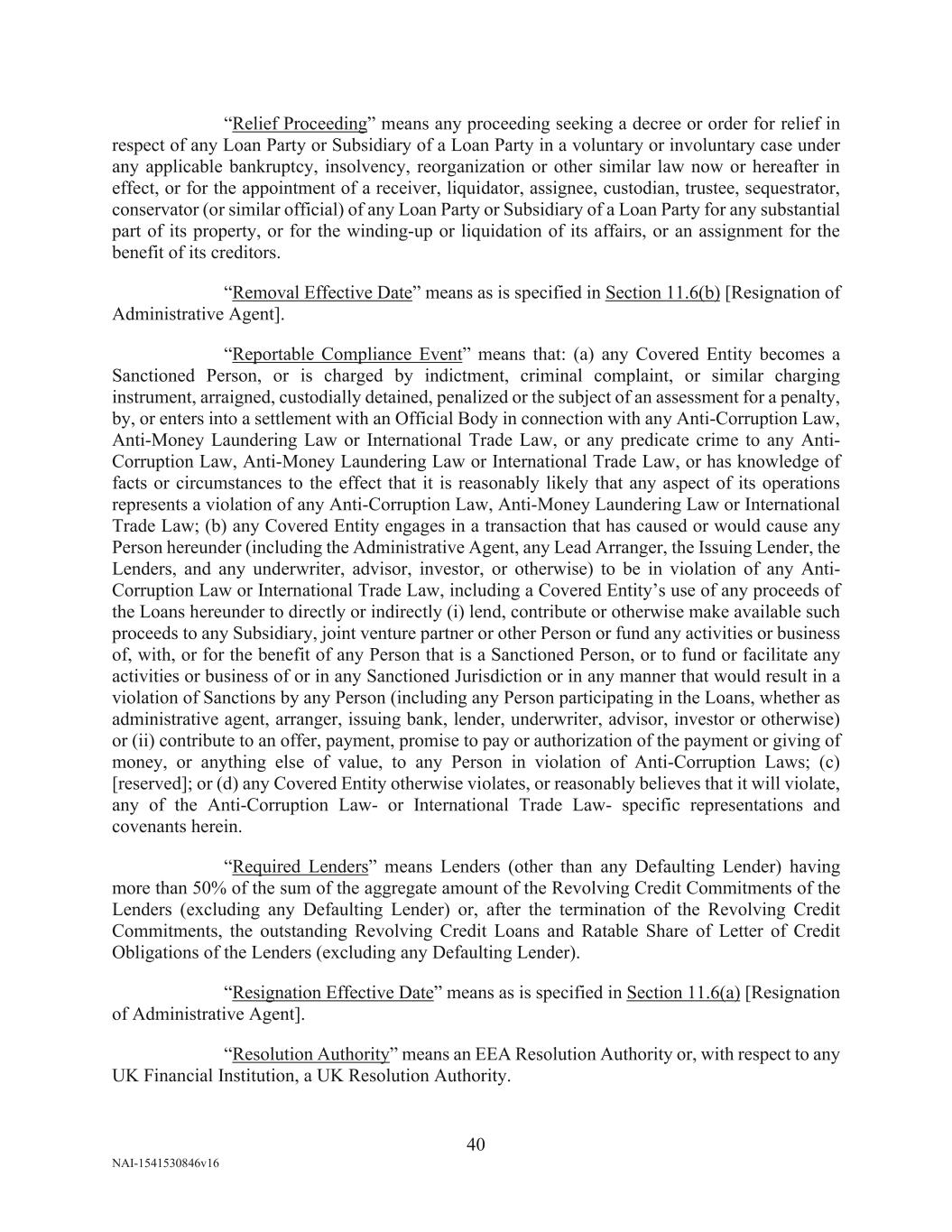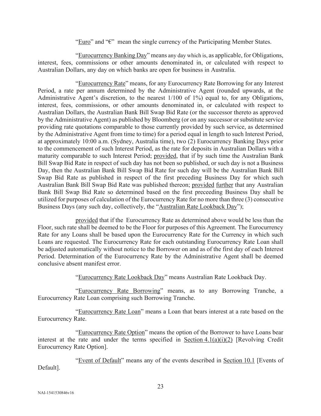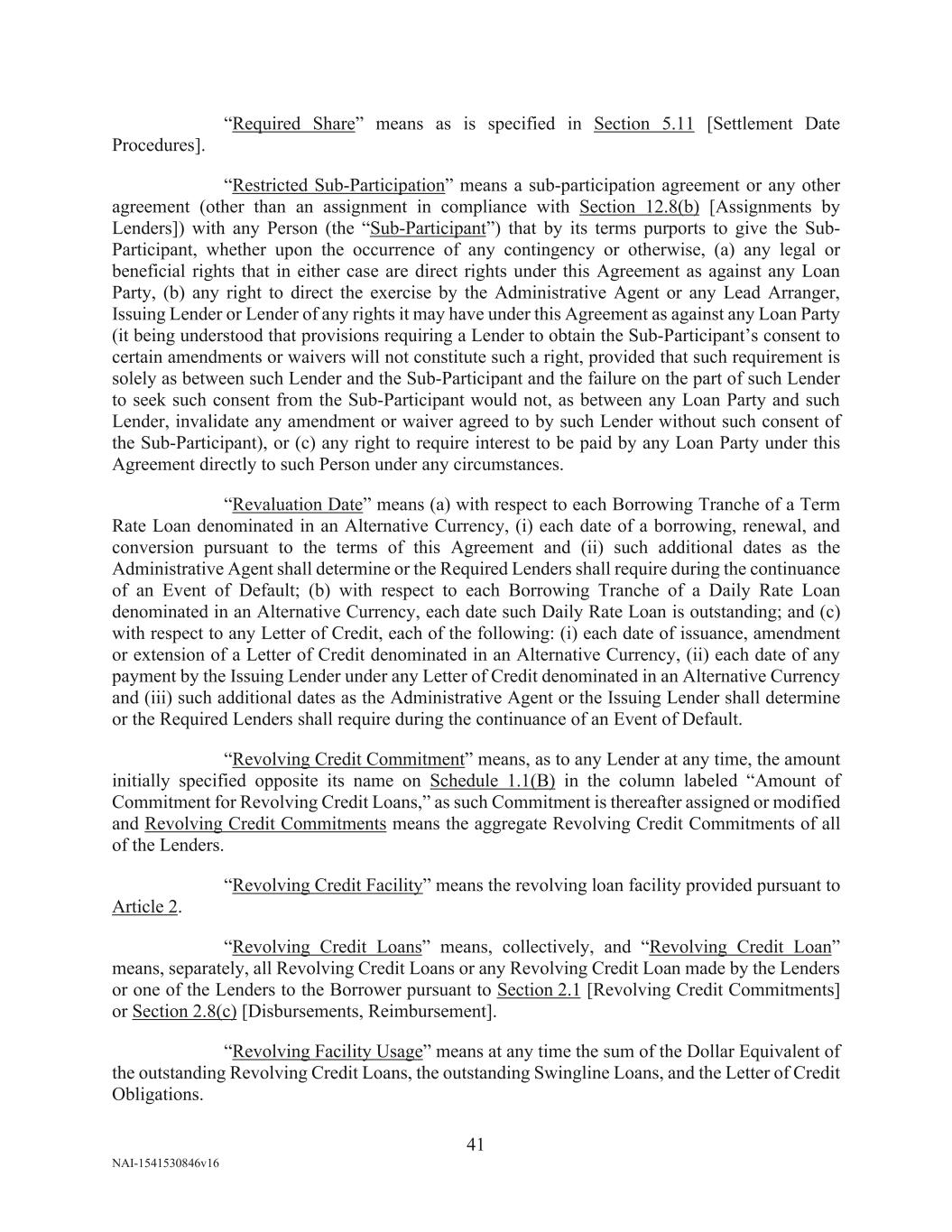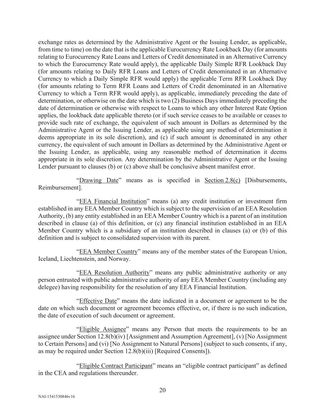 NAI-1541530846v16 2 “Administrative Questionnaire” means an administrative questionnaire in a form supplied by the Administrative Agent. “Affected Financial Institution” means (a) any EEA Financial Institution or (b) any UK Financial Institution. “Affiliate” means, with respect to a specified Person, another Person that directly or indirectly through one or more intermediaries, Controls or is Controlled by or is under common Control with the Person specified. “Agent Parties” means as is specified in Section 12.5(d)(ii). “Agreement” means this Credit Agreement, as the same may be amended, supplemented, modified or restated from time to time, including all schedules and exhibits. “Alternative Currency” means Euros, Sterling, Yen, Swiss Francs, Canadian Dollars, Australian Dollars and any other currency approved in writing by each Lender, in each case as long as there is a published Daily Simple RFR, Term RFR or Eurocurrency Rate, as applicable, or a Benchmark Replacement effected pursuant to Section 4.4 [Rate Unascertainable; Increased Costs; Deposits Not Available; Illegality; Benchmark Replacement Setting] with respect thereto. “Alternative Currency Equivalent” means, at any time, with respect to any amount denominated in Dollars, the equivalent amount thereof in the applicable Alternative Currency as determined by the Administrative Agent or the Issuing Lender, as the case may be, in its sole discretion by reference to the applicable Bloomberg page (or such other publicly available service for displaying exchange rates as determined by the Administrative Agent from time to time), to be the exchange rate for the purchase of such Alternative Currency with Dollars on the date that is (i) with respect to Daily RFR Loans and Letters of Credit to which a Daily Simple RFR would apply, the applicable Daily Simple RFR Lookback Day, (ii) with respect to Eurocurrency Rate Loans and Letters of Credit to which a Eurocurrency Rate would apply, the applicable Eurocurrency Rate Lookback Day, and (iii) with respect to Term RFR Loans and Letters of Credit to which a Term RFR would apply, the applicable Term RFR Lookback Day, and (iv) otherwise, on the date which is two (2) Business Days immediately preceding the date of determination, or otherwise with respect to Loans to which any other Interest Rate Option applies, the lookback date applicable thereto, in each case, prior to the date as of which the foreign exchange computation is made; provided, however, that if no such rate is available, the “Alternative Currency Equivalent” shall be determined by the Administrative Agent or the Issuing Lender, as the case may be, using any reasonable method of determination it deems appropriate in its sole discretion (and such determination shall be conclusive absent manifest error). “Anti-Corruption Laws” means (a) the U.S. Foreign Corrupt Practices Act of 1977, as amended; (b) the U.K. Bribery Act 2010, as amended; and (c) any other applicable Law relating to anti-bribery or anti-corruption in any jurisdiction in which any Loan Party is located or doing business. “Anti-Money Laundering Laws” means (a) the Bank Secrecy Act and the Uniting and Strengthening America by Providing Appropriate Tools Required to Intercept and Obstruct