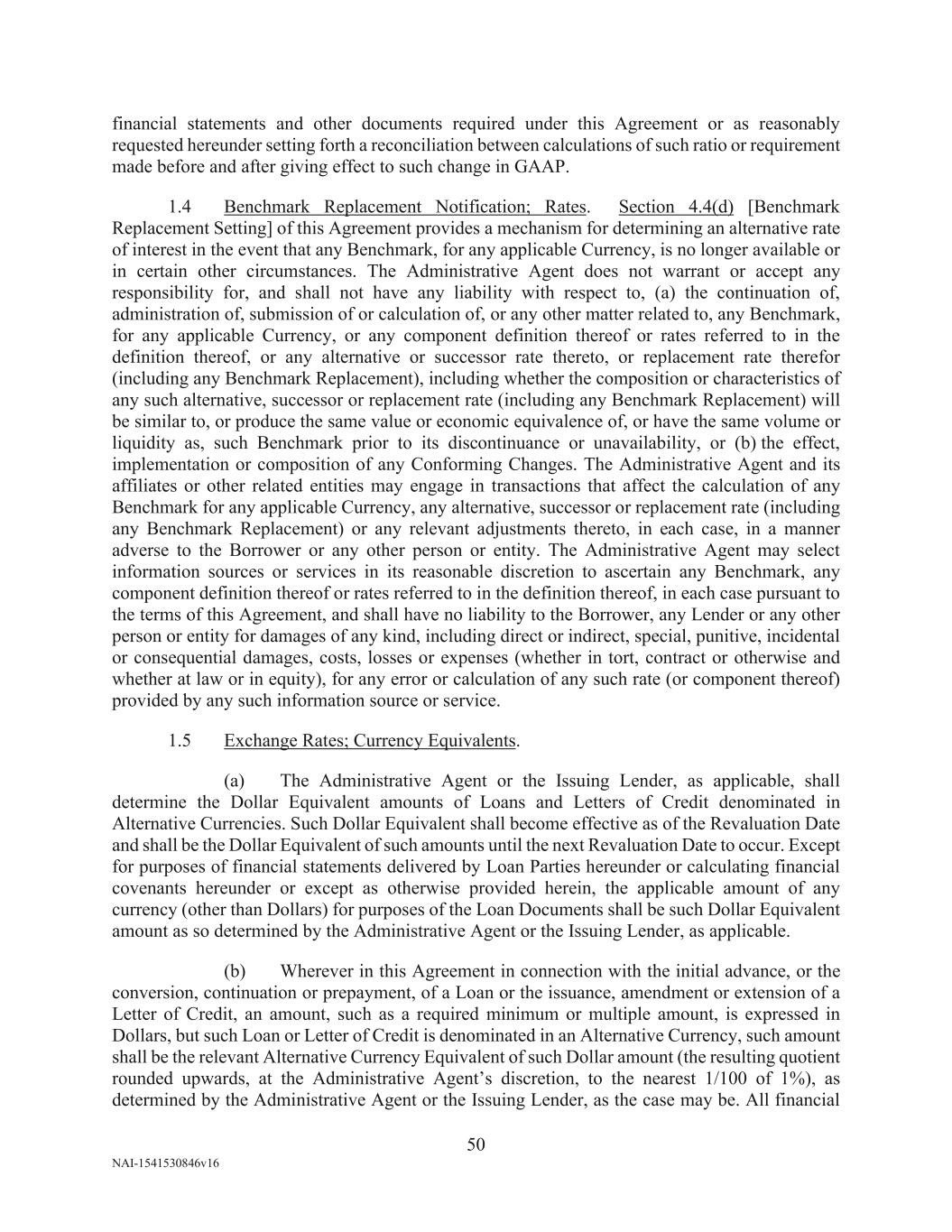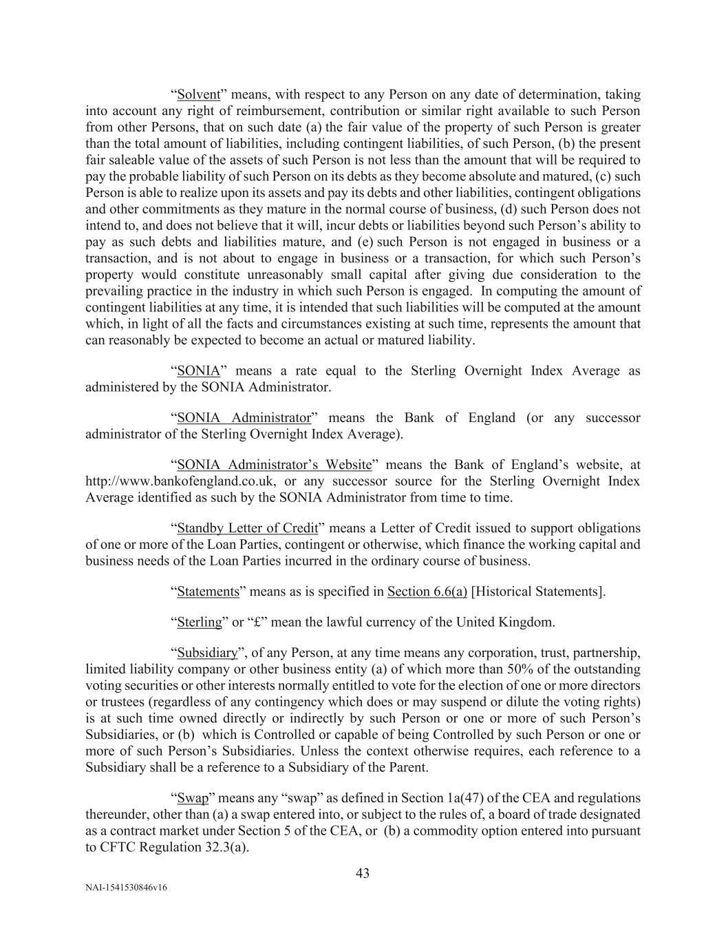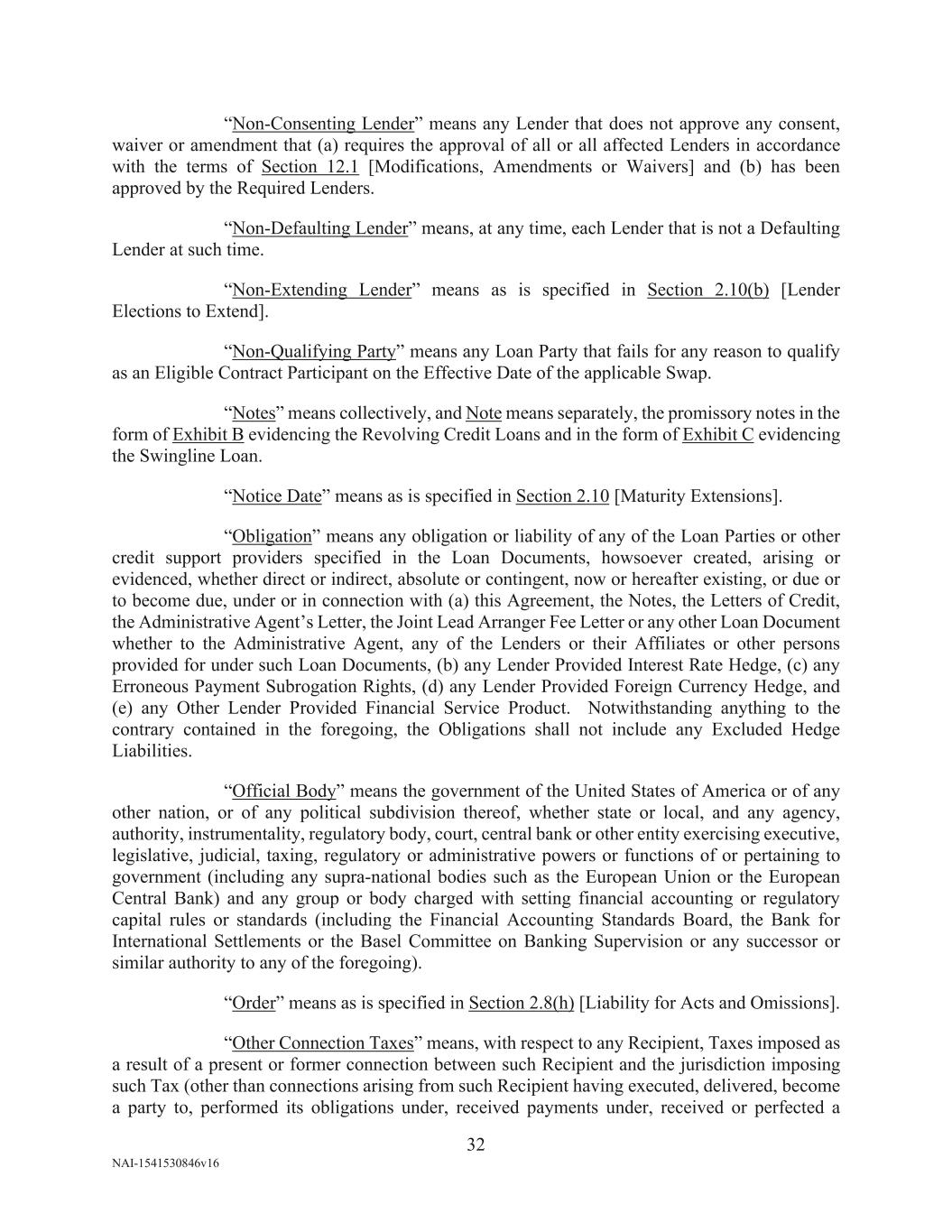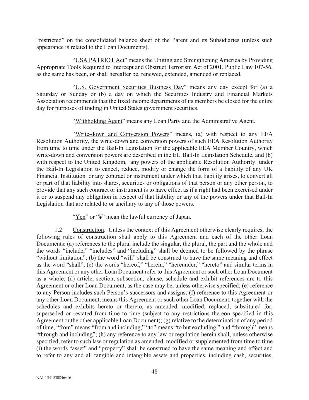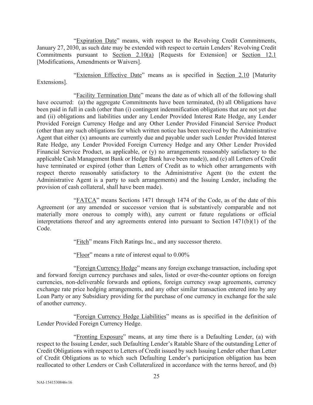 NAI-1541530846v16 2 “Administrative Questionnaire” means an administrative questionnaire in a form supplied by the Administrative Agent. “Affected Financial Institution” means (a) any EEA Financial Institution or (b) any UK Financial Institution. “Affiliate” means, with respect to a specified Person, another Person that directly or indirectly through one or more intermediaries, Controls or is Controlled by or is under common Control with the Person specified. “Agent Parties” means as is specified in Section 12.5(d)(ii). “Agreement” means this Credit Agreement, as the same may be amended, supplemented, modified or restated from time to time, including all schedules and exhibits. “Alternative Currency” means Euros, Sterling, Yen, Swiss Francs, Canadian Dollars, Australian Dollars and any other currency approved in writing by each Lender, in each case as long as there is a published Daily Simple RFR, Term RFR or Eurocurrency Rate, as applicable, or a Benchmark Replacement effected pursuant to Section 4.4 [Rate Unascertainable; Increased Costs; Deposits Not Available; Illegality; Benchmark Replacement Setting] with respect thereto. “Alternative Currency Equivalent” means, at any time, with respect to any amount denominated in Dollars, the equivalent amount thereof in the applicable Alternative Currency as determined by the Administrative Agent or the Issuing Lender, as the case may be, in its sole discretion by reference to the applicable Bloomberg page (or such other publicly available service for displaying exchange rates as determined by the Administrative Agent from time to time), to be the exchange rate for the purchase of such Alternative Currency with Dollars on the date that is (i) with respect to Daily RFR Loans and Letters of Credit to which a Daily Simple RFR would apply, the applicable Daily Simple RFR Lookback Day, (ii) with respect to Eurocurrency Rate Loans and Letters of Credit to which a Eurocurrency Rate would apply, the applicable Eurocurrency Rate Lookback Day, and (iii) with respect to Term RFR Loans and Letters of Credit to which a Term RFR would apply, the applicable Term RFR Lookback Day, and (iv) otherwise, on the date which is two (2) Business Days immediately preceding the date of determination, or otherwise with respect to Loans to which any other Interest Rate Option applies, the lookback date applicable thereto, in each case, prior to the date as of which the foreign exchange computation is made; provided, however, that if no such rate is available, the “Alternative Currency Equivalent” shall be determined by the Administrative Agent or the Issuing Lender, as the case may be, using any reasonable method of determination it deems appropriate in its sole discretion (and such determination shall be conclusive absent manifest error). “Anti-Corruption Laws” means (a) the U.S. Foreign Corrupt Practices Act of 1977, as amended; (b) the U.K. Bribery Act 2010, as amended; and (c) any other applicable Law relating to anti-bribery or anti-corruption in any jurisdiction in which any Loan Party is located or doing business. “Anti-Money Laundering Laws” means (a) the Bank Secrecy Act and the Uniting and Strengthening America by Providing Appropriate Tools Required to Intercept and Obstruct