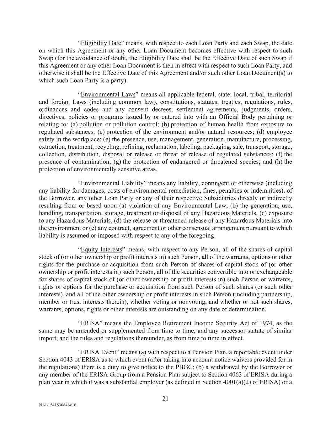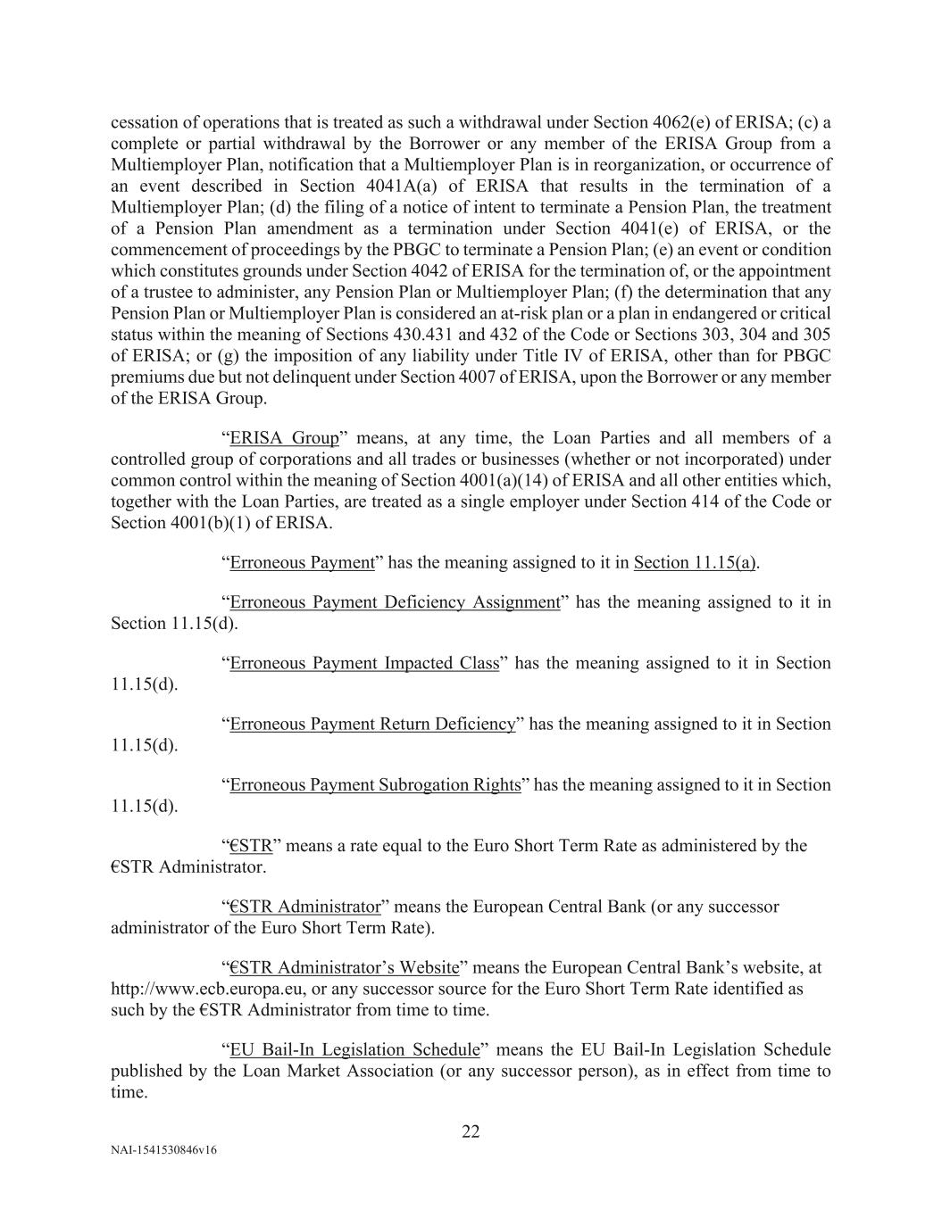 NAI-1541530846v16 8 “Benchmark Replacement Date” means a date and time determined by the Administrative Agent, which date shall be no later than the earliest to occur of the following events with respect to the then-current Benchmark for any Currency: (1) in the case of clause (1) or (2) of the definition of “Benchmark Transition Event,” the later of (A) the date of the public statement or publication of information referenced therein and (B) the date on which the administrator of such Benchmark (or the published component used in the calculation thereof) permanently or indefinitely ceases to provide such Benchmark (or such component thereof) or, if such Benchmark is a term rate or is based on a term rate, all Available Tenors of such Benchmark (or such component thereof); or (2) in the case of clause (3) of the definition of “Benchmark Transition Event,” the date determined by the Administrative Agent, which date shall promptly follow the date of the public statement or publication of information referenced therein; For the avoidance of doubt, if such Benchmark is a term rate or is based on a term rate, the “Benchmark Replacement Date” will be deemed to have occurred in the case of clause (1) or (2) with respect to any Benchmark upon the occurrence of the applicable event or events set forth therein with respect to all then-current Available Tenors of such Benchmark (or the published component used in the calculation thereof). “Benchmark Transition Event” means the occurrence of one or more of the following events with respect to the then-current Benchmark for any Currency: (1) a public statement or publication of information by or on behalf of the administrator of such Benchmark (or the published component used in the calculation thereof) announcing that such administrator has ceased or will cease to provide such Benchmark (or such component thereof) or, if such Benchmark is a term rate or is based on a term rate, all Available Tenors of such Benchmark (or such component thereof), permanently or indefinitely, provided that, at the time of such statement or publication, there is no successor administrator that will continue to provide any Available Tenor of such Benchmark (or such component thereof); (2) a public statement or publication of information by an Official Body having jurisdiction over the Administrative Agent, the regulatory supervisor for the administrator of such Benchmark (or the published component used in the calculation thereof), the Federal Reserve Board, the Federal Reserve Bank of New York, the central bank for the Currency applicable to such Benchmark, an insolvency official with jurisdiction over the administrator for such Benchmark (or such component), a resolution authority with jurisdiction over the administrator for such Benchmark (or such component) or a court or an entity with similar insolvency or resolution authority over the administrator for such Benchmark (or such component), which states that the administrator of such Benchmark (or such component) has ceased or will cease to provide such Benchmark (or such component thereof) or, if such Benchmark is a term rate or is based on a term rate, all Available Tenors of such Benchmark (or such component thereof) permanently or indefinitely, provided that, at the time of such statement or publication, there is no successor administrator that will continue to provide such Benchmark (or such component thereof) or, if such Benchmark is a term rate or is based on a term rate, any Available Tenor of such Benchmark (or such component thereof); or
