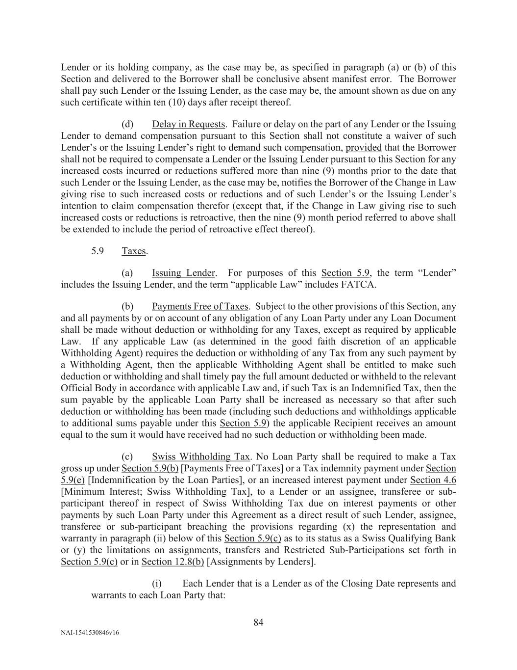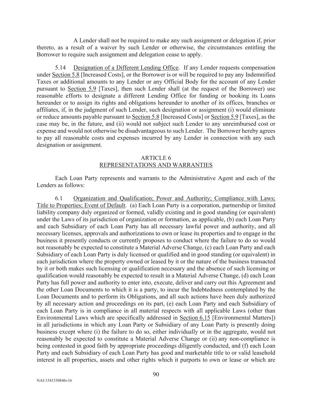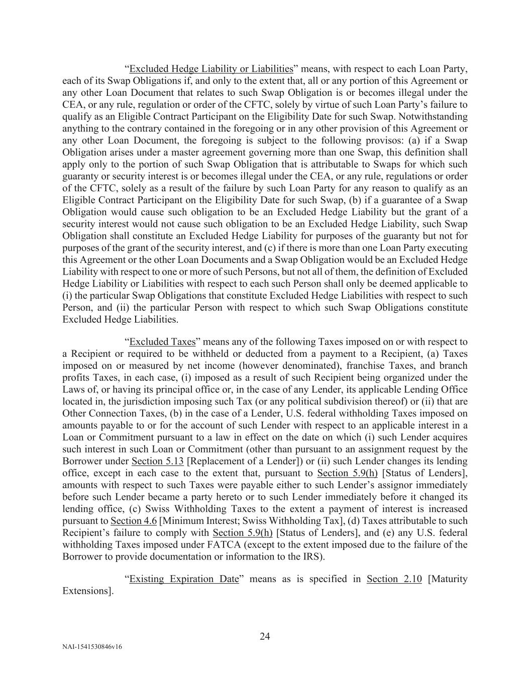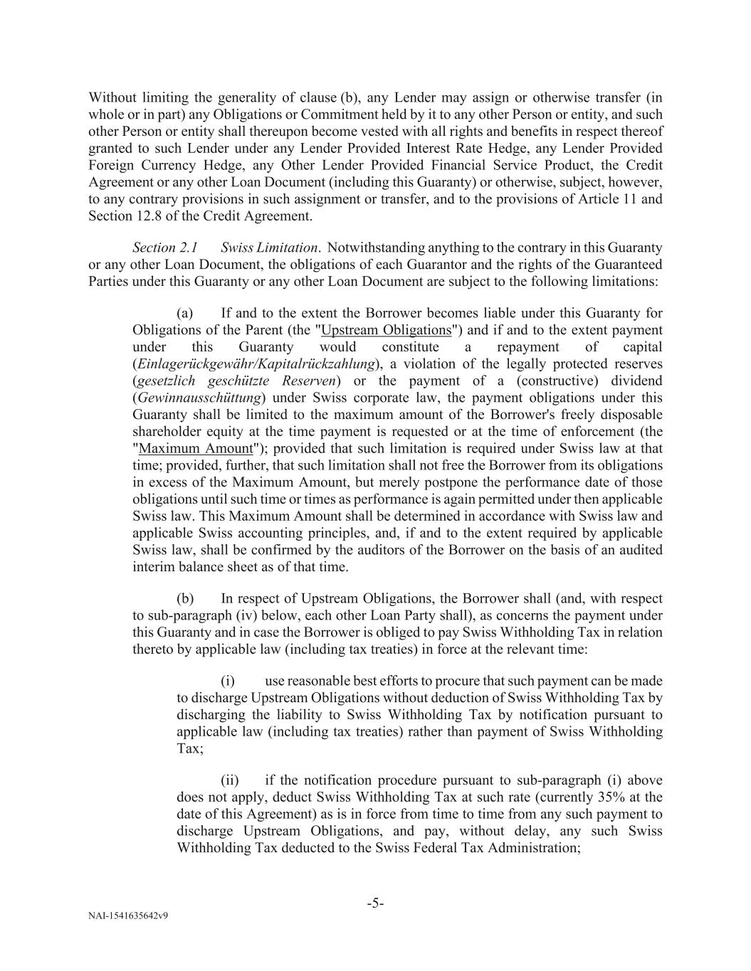 NAI-1541530846v16 TABLE OF CONTENTS (continued) Page 5.1 Payments .............................................................................................................. 78 5.2 Voluntary Prepayments. ....................................................................................... 79 5.3 Mandatory Prepayments ...................................................................................... 80 5.4 Pro Rata Treatment of Lenders ............................................................................ 80 5.5 Sharing of Payments by Lenders ......................................................................... 81 5.6 Administrative Agent’s Clawback. ...................................................................... 81 5.7 Interest Payment Dates ........................................................................................ 82 5.8 Increased Costs. ................................................................................................... 82 5.9 Taxes. ................................................................................................................... 84 5.10 Indemnity. ............................................................................................................ 87 5.11 Settlement Date Procedures ................................................................................. 87 5.12 Cash Collateral ..................................................................................................... 88 5.13 Replacement of a Lender ..................................................................................... 89 5.14 Designation of a Different Lending Office .......................................................... 90 ARTICLE 6 REPRESENTATIONS AND WARRANTIES .................................................. 90 6.1 Organization and Qualification; Power and Authority; Compliance with Laws; Title to Properties; Event of Default ......................................................... 90 6.2 Borrower; Subsidiaries and Owners; Investment Companies ............................. 91 6.3 Validity and Binding Effect ................................................................................. 91 6.4 No Conflict; Material Contractual Obligations; Consents ................................... 91 6.5 Material Litigation ............................................................................................... 92 6.6 Financial Statements. ........................................................................................... 92 6.7 Accuracy of Financial Statements ....................................................................... 92 6.8 Margin Stock ........................................................................................................ 93 6.9 Full Disclosure ..................................................................................................... 93 6.10 Taxes .................................................................................................................... 93 6.11 Compliance with Swiss Ten Non-Bank Rule and Swiss Twenty Non-Bank Rule ...................................................................................................................... 94 6.12 [Reserved] ............................................................................................................ 94 6.13 Insurance .............................................................................................................. 94 6.14 ERISA Compliance. ............................................................................................. 94