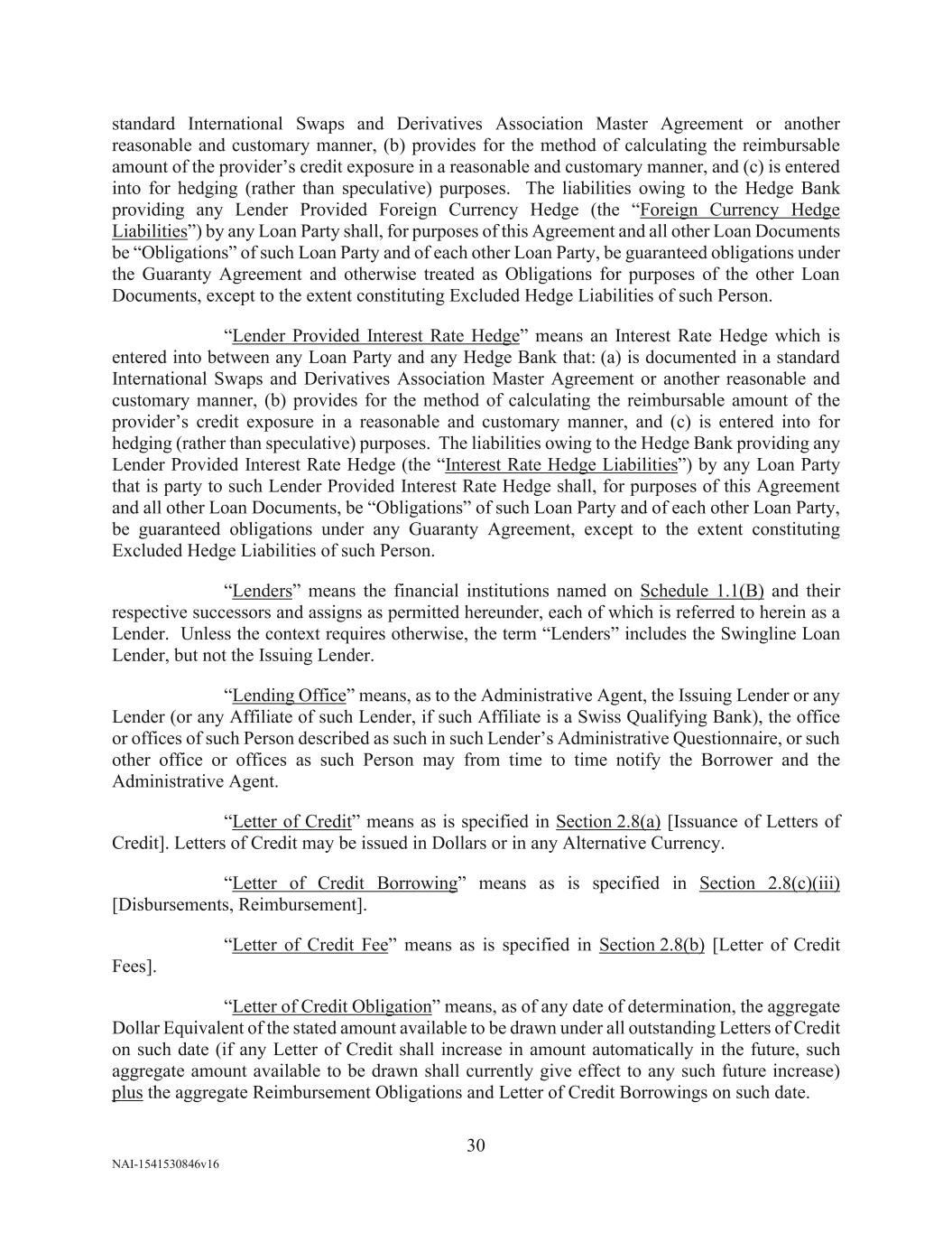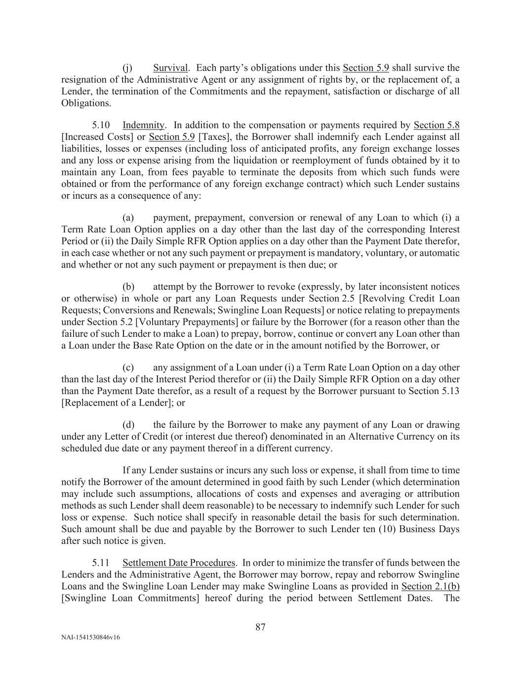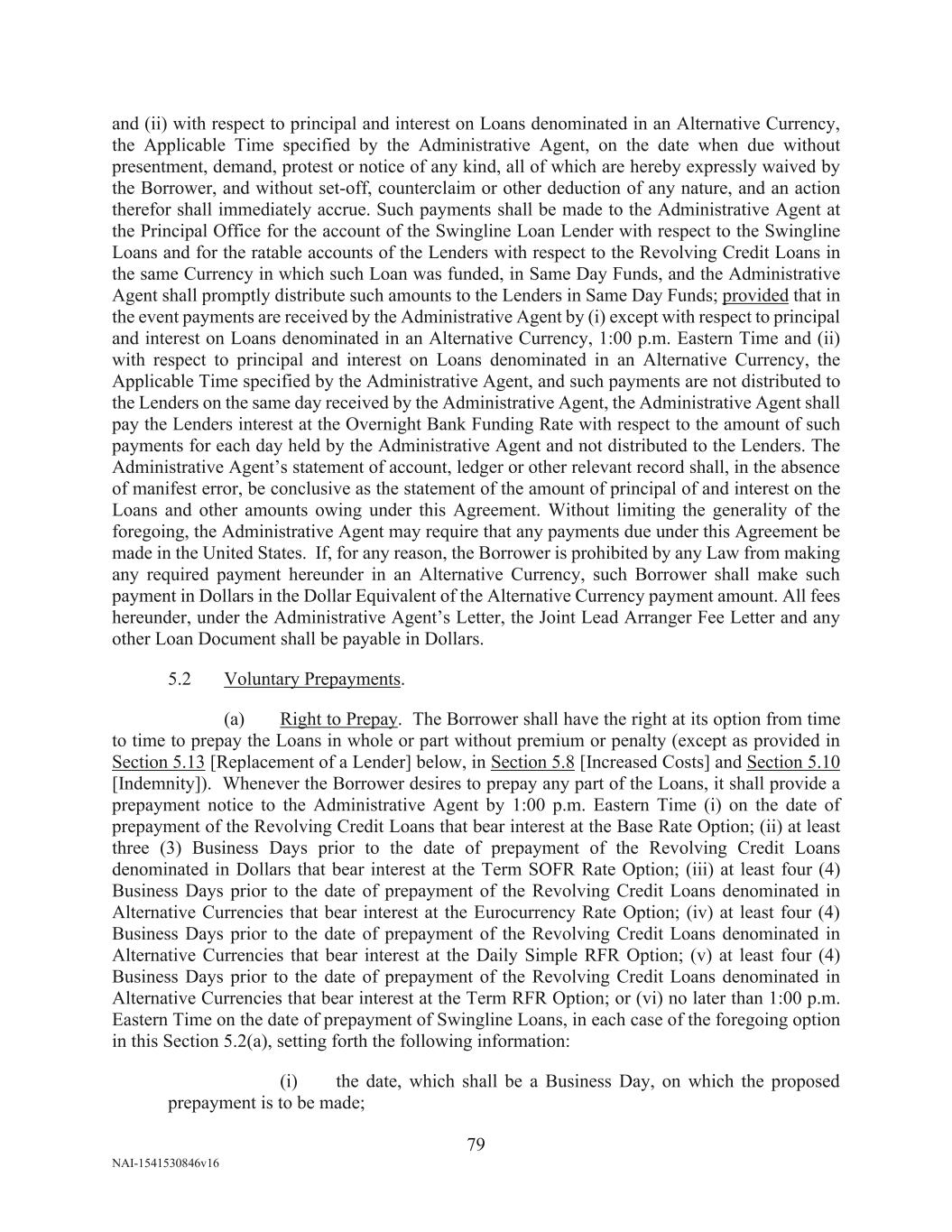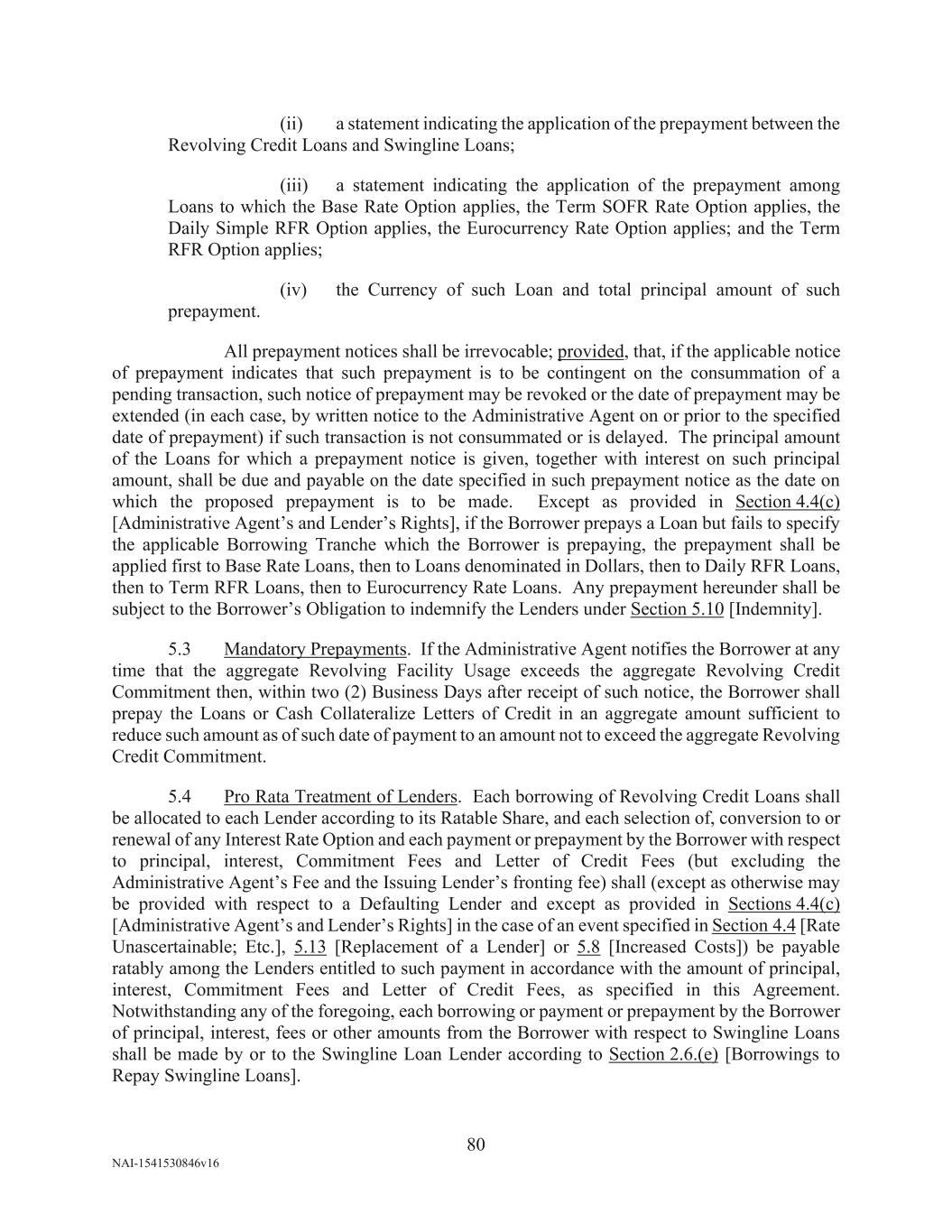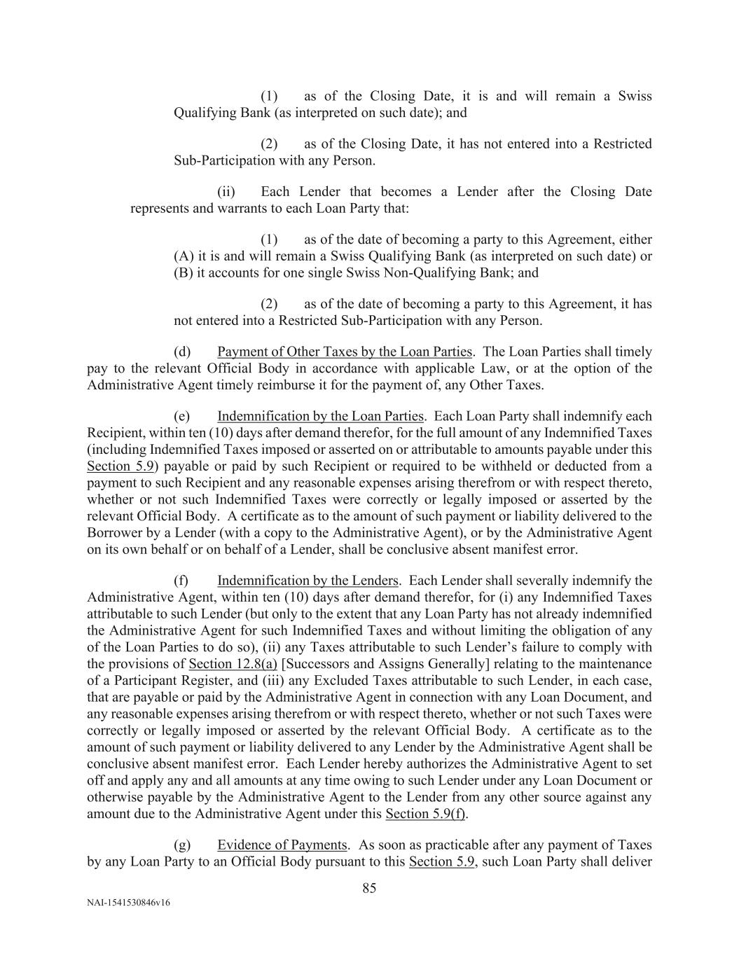 NAI-1541530846v16 TABLE OF CONTENTS (continued) Page 5.1 Payments .............................................................................................................. 78 5.2 Voluntary Prepayments. ....................................................................................... 79 5.3 Mandatory Prepayments ...................................................................................... 80 5.4 Pro Rata Treatment of Lenders ............................................................................ 80 5.5 Sharing of Payments by Lenders ......................................................................... 81 5.6 Administrative Agent’s Clawback. ...................................................................... 81 5.7 Interest Payment Dates ........................................................................................ 82 5.8 Increased Costs. ................................................................................................... 82 5.9 Taxes. ................................................................................................................... 84 5.10 Indemnity. ............................................................................................................ 87 5.11 Settlement Date Procedures ................................................................................. 87 5.12 Cash Collateral ..................................................................................................... 88 5.13 Replacement of a Lender ..................................................................................... 89 5.14 Designation of a Different Lending Office .......................................................... 90 ARTICLE 6 REPRESENTATIONS AND WARRANTIES .................................................. 90 6.1 Organization and Qualification; Power and Authority; Compliance with Laws; Title to Properties; Event of Default ......................................................... 90 6.2 Borrower; Subsidiaries and Owners; Investment Companies ............................. 91 6.3 Validity and Binding Effect ................................................................................. 91 6.4 No Conflict; Material Contractual Obligations; Consents ................................... 91 6.5 Material Litigation ............................................................................................... 92 6.6 Financial Statements. ........................................................................................... 92 6.7 Accuracy of Financial Statements ....................................................................... 92 6.8 Margin Stock ........................................................................................................ 93 6.9 Full Disclosure ..................................................................................................... 93 6.10 Taxes .................................................................................................................... 93 6.11 Compliance with Swiss Ten Non-Bank Rule and Swiss Twenty Non-Bank Rule ...................................................................................................................... 94 6.12 [Reserved] ............................................................................................................ 94 6.13 Insurance .............................................................................................................. 94 6.14 ERISA Compliance. ............................................................................................. 94