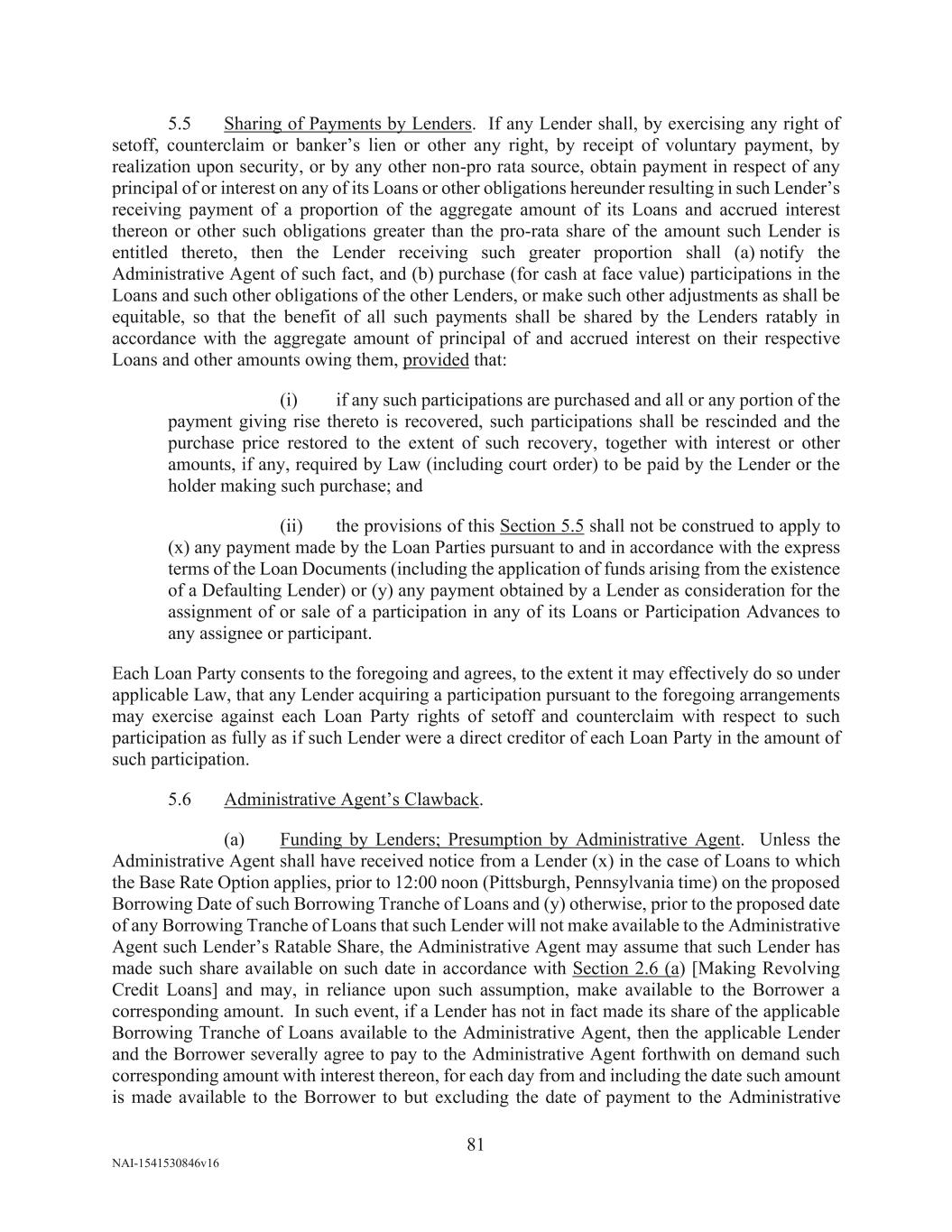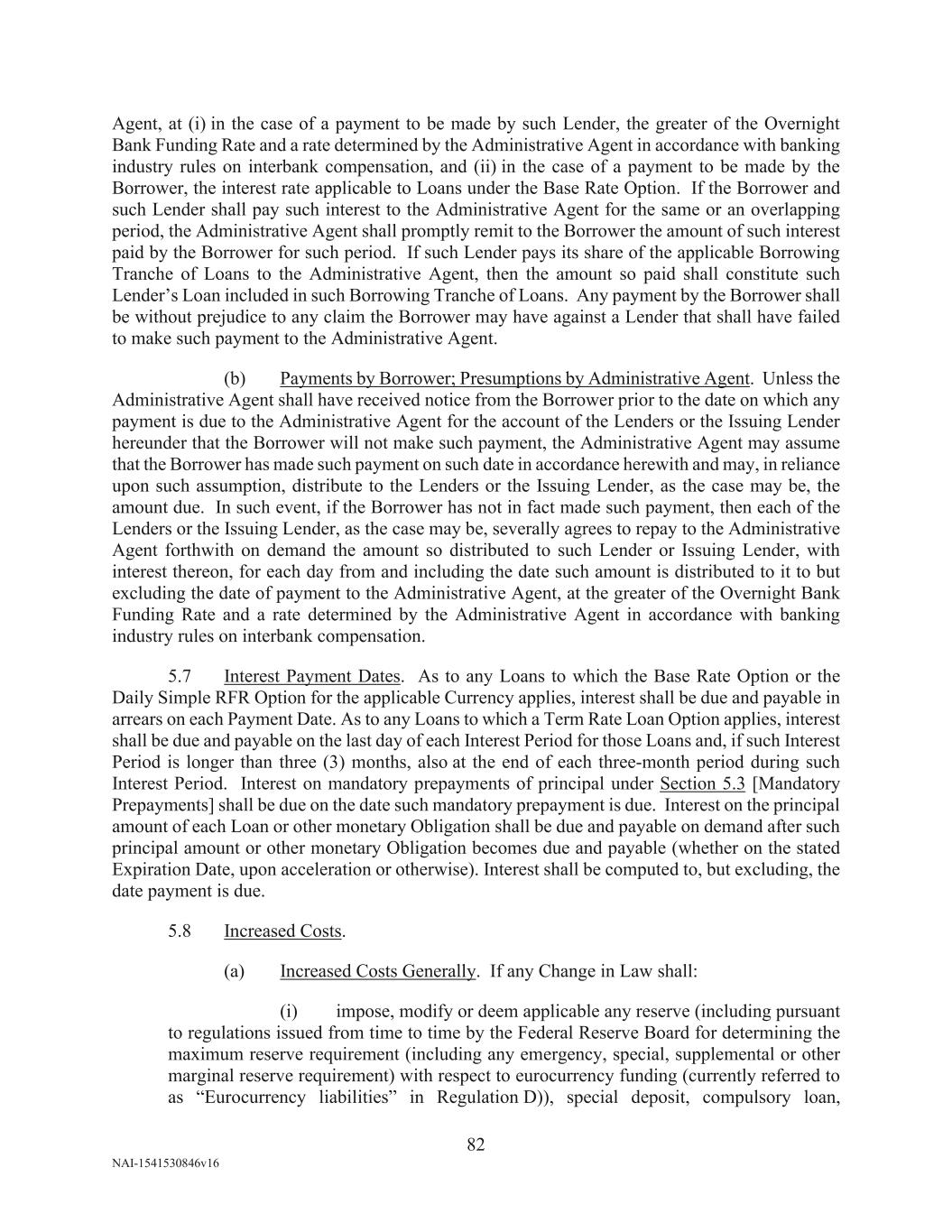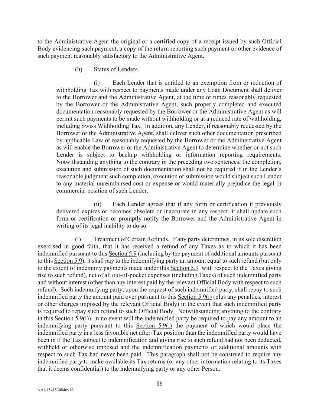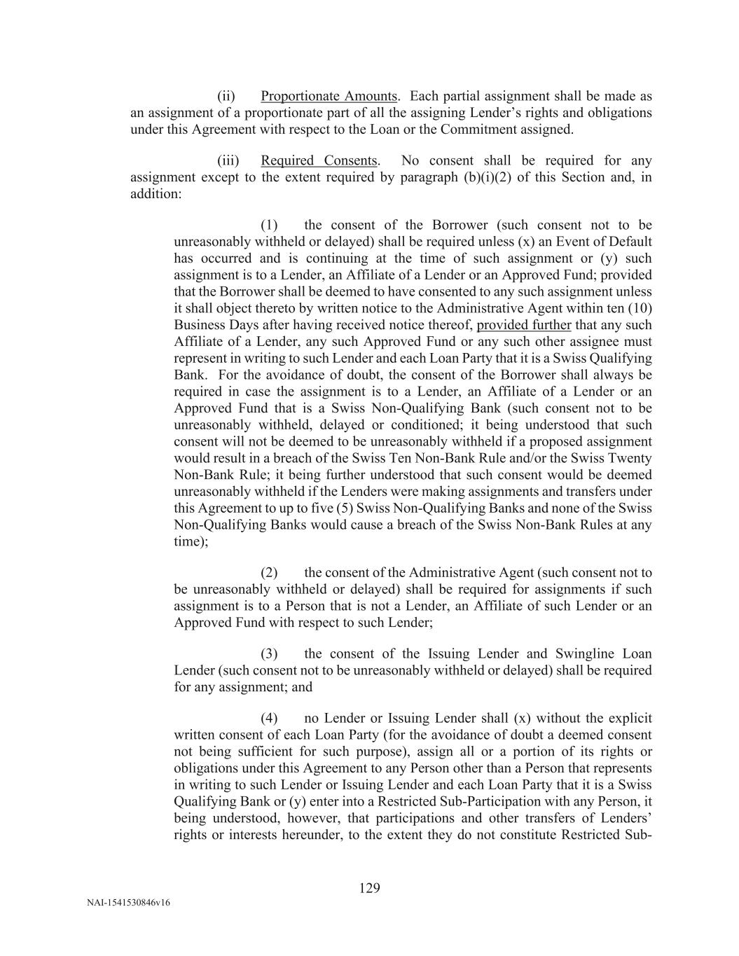 NAI-1541530846v16 TABLE OF CONTENTS (continued) Page 5.1 Payments .............................................................................................................. 78 5.2 Voluntary Prepayments. ....................................................................................... 79 5.3 Mandatory Prepayments ...................................................................................... 80 5.4 Pro Rata Treatment of Lenders ............................................................................ 80 5.5 Sharing of Payments by Lenders ......................................................................... 81 5.6 Administrative Agent’s Clawback. ...................................................................... 81 5.7 Interest Payment Dates ........................................................................................ 82 5.8 Increased Costs. ................................................................................................... 82 5.9 Taxes. ................................................................................................................... 84 5.10 Indemnity. ............................................................................................................ 87 5.11 Settlement Date Procedures ................................................................................. 87 5.12 Cash Collateral ..................................................................................................... 88 5.13 Replacement of a Lender ..................................................................................... 89 5.14 Designation of a Different Lending Office .......................................................... 90 ARTICLE 6 REPRESENTATIONS AND WARRANTIES .................................................. 90 6.1 Organization and Qualification; Power and Authority; Compliance with Laws; Title to Properties; Event of Default ......................................................... 90 6.2 Borrower; Subsidiaries and Owners; Investment Companies ............................. 91 6.3 Validity and Binding Effect ................................................................................. 91 6.4 No Conflict; Material Contractual Obligations; Consents ................................... 91 6.5 Material Litigation ............................................................................................... 92 6.6 Financial Statements. ........................................................................................... 92 6.7 Accuracy of Financial Statements ....................................................................... 92 6.8 Margin Stock ........................................................................................................ 93 6.9 Full Disclosure ..................................................................................................... 93 6.10 Taxes .................................................................................................................... 93 6.11 Compliance with Swiss Ten Non-Bank Rule and Swiss Twenty Non-Bank Rule ...................................................................................................................... 94 6.12 [Reserved] ............................................................................................................ 94 6.13 Insurance .............................................................................................................. 94 6.14 ERISA Compliance. ............................................................................................. 94