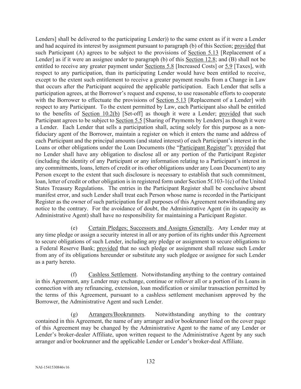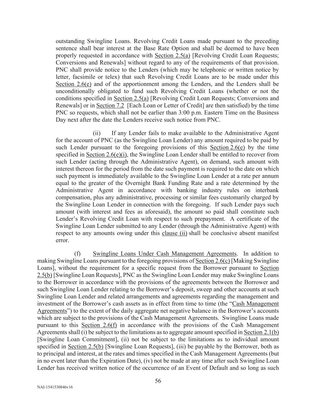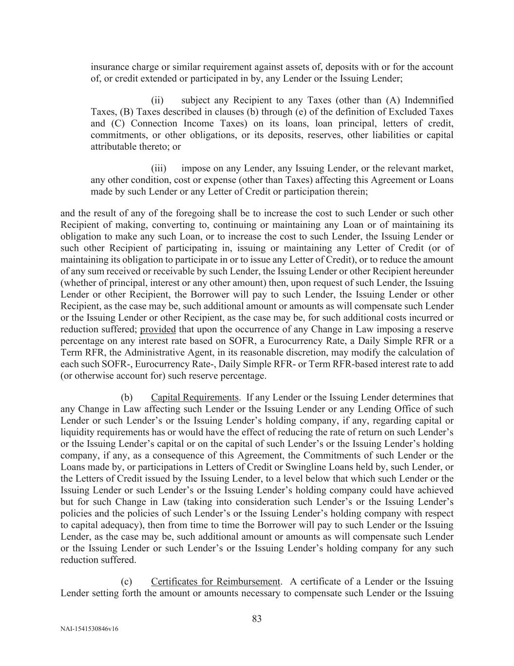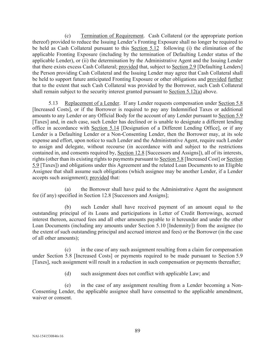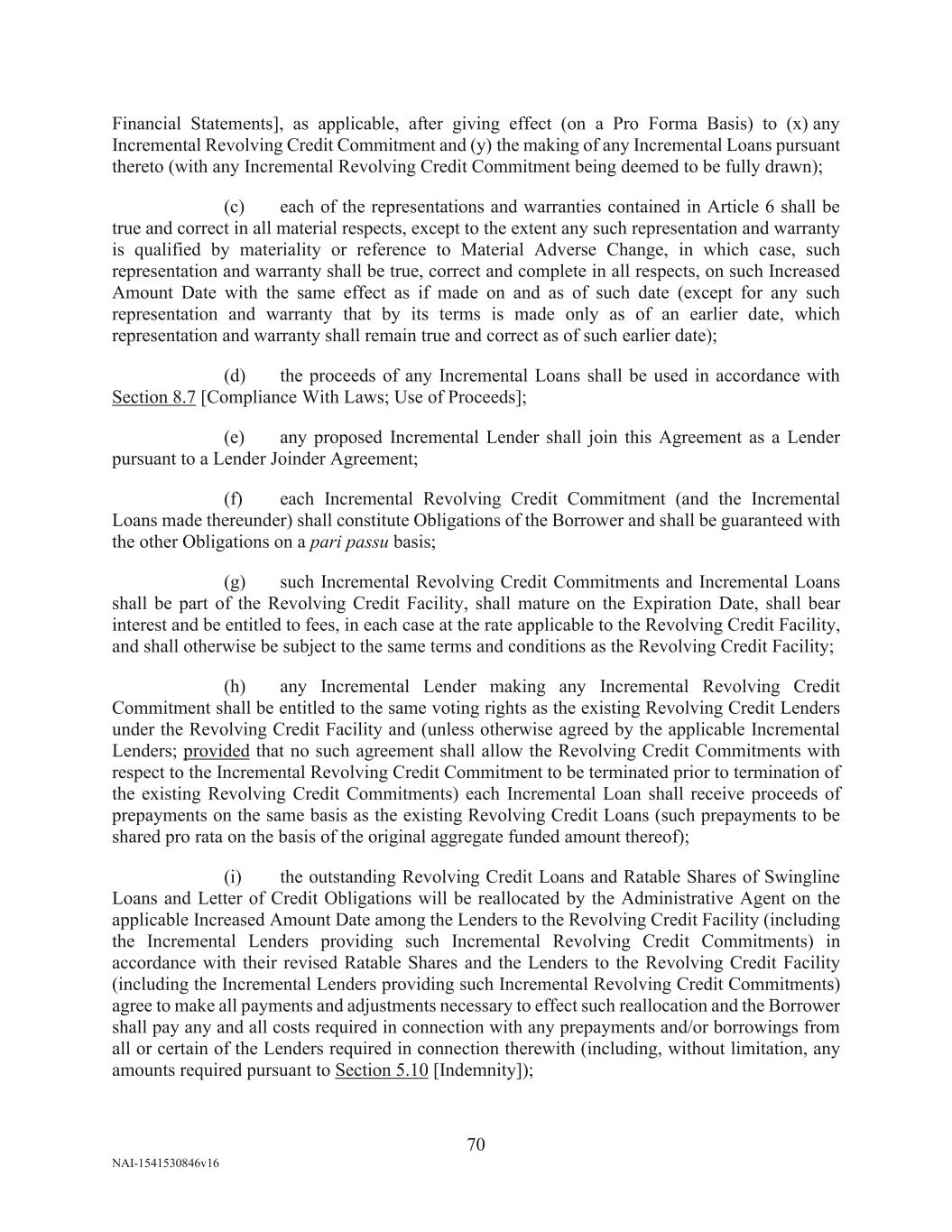 NAI-1541530846v16 TABLE OF CONTENTS (continued) Page 5.1 Payments .............................................................................................................. 78 5.2 Voluntary Prepayments. ....................................................................................... 79 5.3 Mandatory Prepayments ...................................................................................... 80 5.4 Pro Rata Treatment of Lenders ............................................................................ 80 5.5 Sharing of Payments by Lenders ......................................................................... 81 5.6 Administrative Agent’s Clawback. ...................................................................... 81 5.7 Interest Payment Dates ........................................................................................ 82 5.8 Increased Costs. ................................................................................................... 82 5.9 Taxes. ................................................................................................................... 84 5.10 Indemnity. ............................................................................................................ 87 5.11 Settlement Date Procedures ................................................................................. 87 5.12 Cash Collateral ..................................................................................................... 88 5.13 Replacement of a Lender ..................................................................................... 89 5.14 Designation of a Different Lending Office .......................................................... 90 ARTICLE 6 REPRESENTATIONS AND WARRANTIES .................................................. 90 6.1 Organization and Qualification; Power and Authority; Compliance with Laws; Title to Properties; Event of Default ......................................................... 90 6.2 Borrower; Subsidiaries and Owners; Investment Companies ............................. 91 6.3 Validity and Binding Effect ................................................................................. 91 6.4 No Conflict; Material Contractual Obligations; Consents ................................... 91 6.5 Material Litigation ............................................................................................... 92 6.6 Financial Statements. ........................................................................................... 92 6.7 Accuracy of Financial Statements ....................................................................... 92 6.8 Margin Stock ........................................................................................................ 93 6.9 Full Disclosure ..................................................................................................... 93 6.10 Taxes .................................................................................................................... 93 6.11 Compliance with Swiss Ten Non-Bank Rule and Swiss Twenty Non-Bank Rule ...................................................................................................................... 94 6.12 [Reserved] ............................................................................................................ 94 6.13 Insurance .............................................................................................................. 94 6.14 ERISA Compliance. ............................................................................................. 94