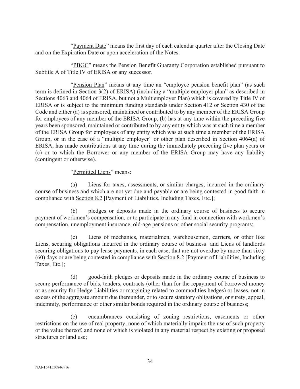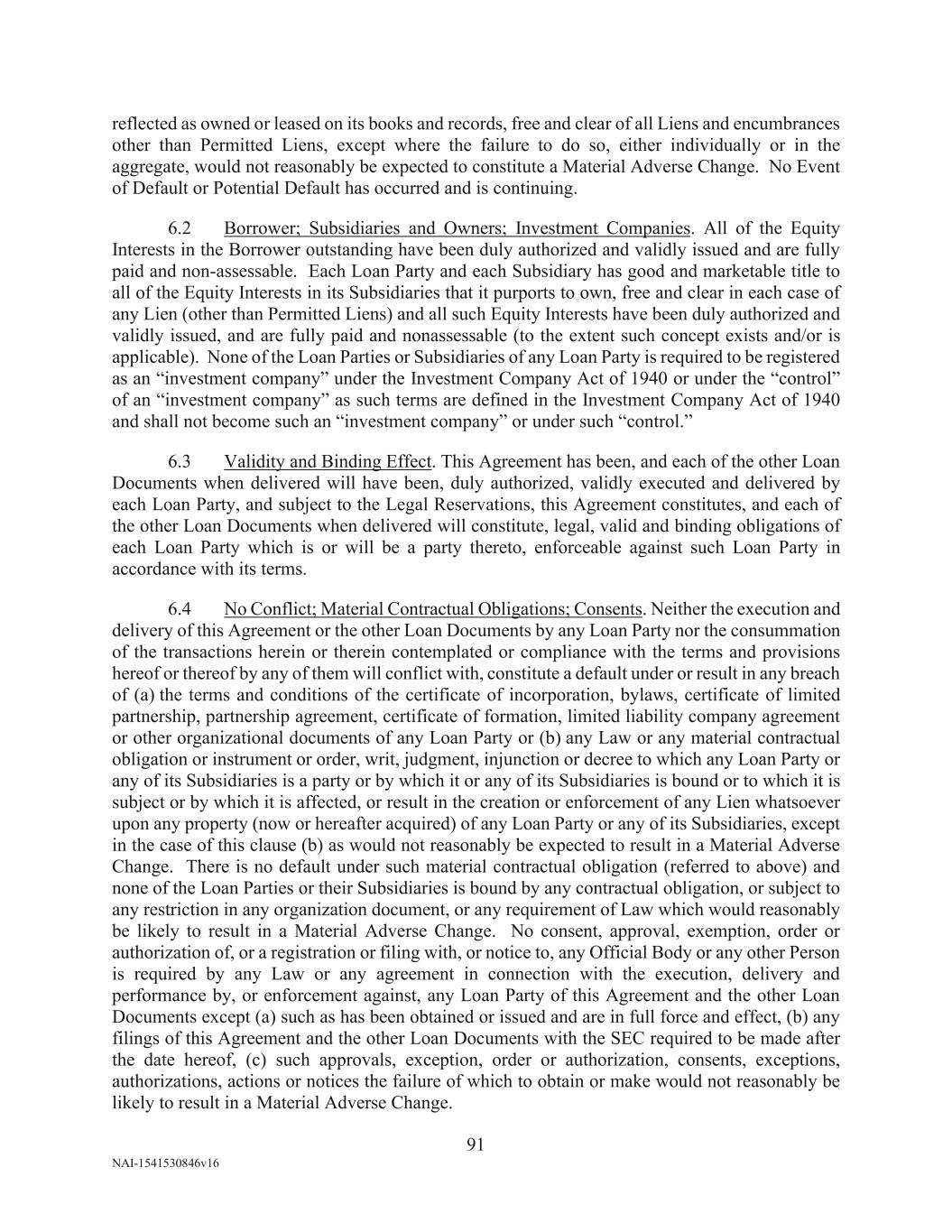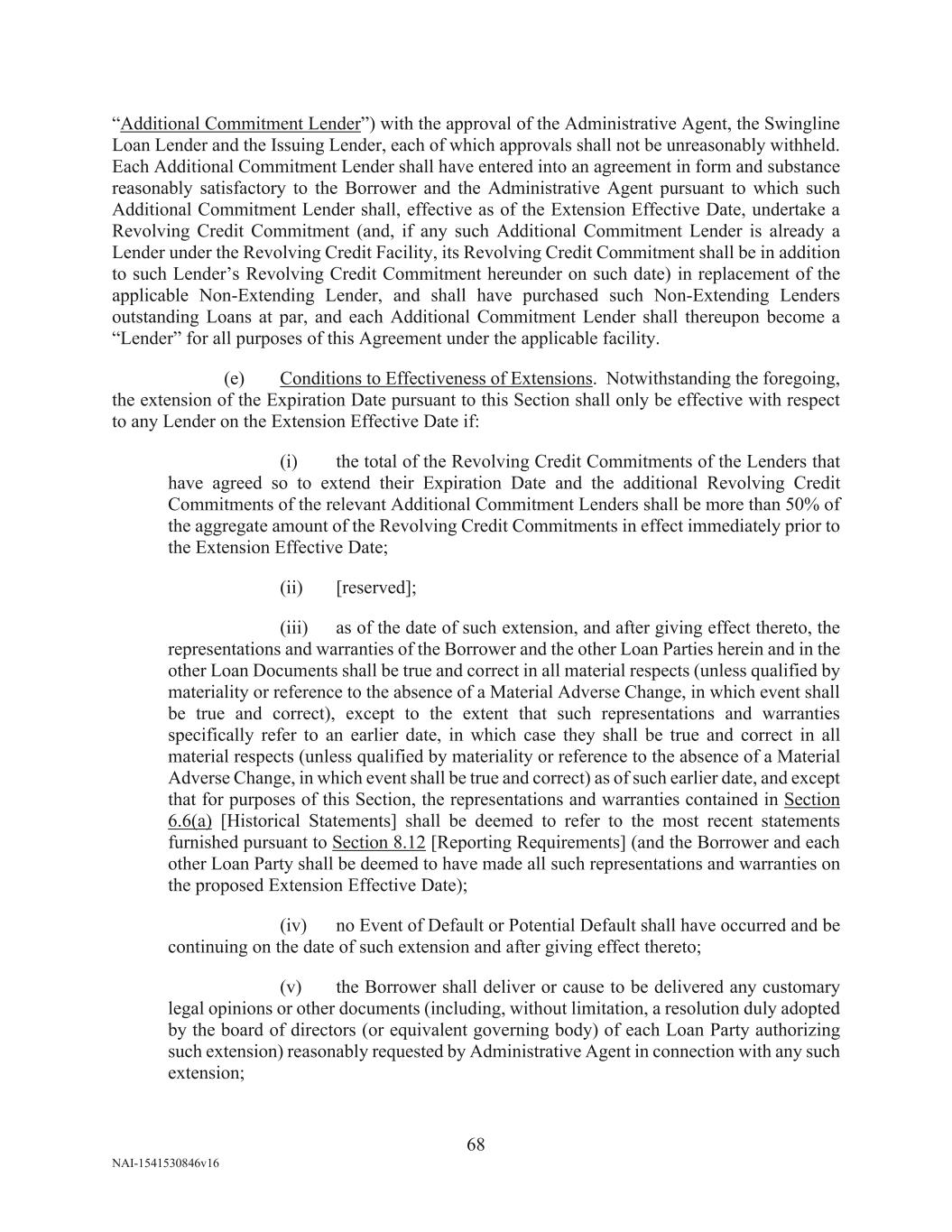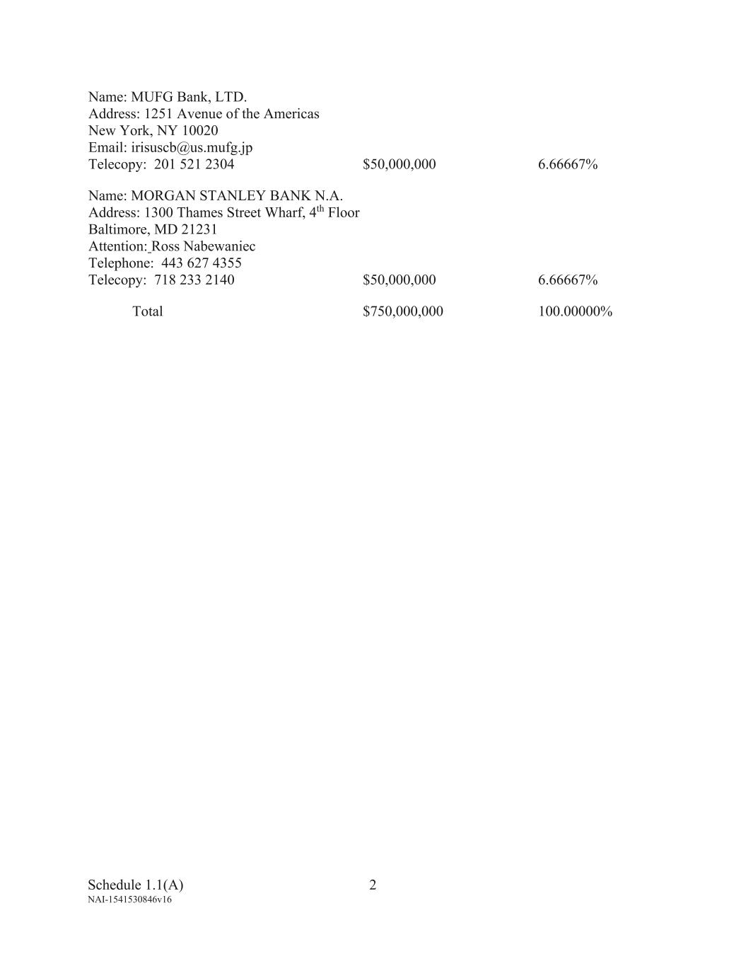 NAI-1541530846v16 TABLE OF CONTENTS (continued) Page 5.1 Payments .............................................................................................................. 78 5.2 Voluntary Prepayments. ....................................................................................... 79 5.3 Mandatory Prepayments ...................................................................................... 80 5.4 Pro Rata Treatment of Lenders ............................................................................ 80 5.5 Sharing of Payments by Lenders ......................................................................... 81 5.6 Administrative Agent’s Clawback. ...................................................................... 81 5.7 Interest Payment Dates ........................................................................................ 82 5.8 Increased Costs. ................................................................................................... 82 5.9 Taxes. ................................................................................................................... 84 5.10 Indemnity. ............................................................................................................ 87 5.11 Settlement Date Procedures ................................................................................. 87 5.12 Cash Collateral ..................................................................................................... 88 5.13 Replacement of a Lender ..................................................................................... 89 5.14 Designation of a Different Lending Office .......................................................... 90 ARTICLE 6 REPRESENTATIONS AND WARRANTIES .................................................. 90 6.1 Organization and Qualification; Power and Authority; Compliance with Laws; Title to Properties; Event of Default ......................................................... 90 6.2 Borrower; Subsidiaries and Owners; Investment Companies ............................. 91 6.3 Validity and Binding Effect ................................................................................. 91 6.4 No Conflict; Material Contractual Obligations; Consents ................................... 91 6.5 Material Litigation ............................................................................................... 92 6.6 Financial Statements. ........................................................................................... 92 6.7 Accuracy of Financial Statements ....................................................................... 92 6.8 Margin Stock ........................................................................................................ 93 6.9 Full Disclosure ..................................................................................................... 93 6.10 Taxes .................................................................................................................... 93 6.11 Compliance with Swiss Ten Non-Bank Rule and Swiss Twenty Non-Bank Rule ...................................................................................................................... 94 6.12 [Reserved] ............................................................................................................ 94 6.13 Insurance .............................................................................................................. 94 6.14 ERISA Compliance. ............................................................................................. 94