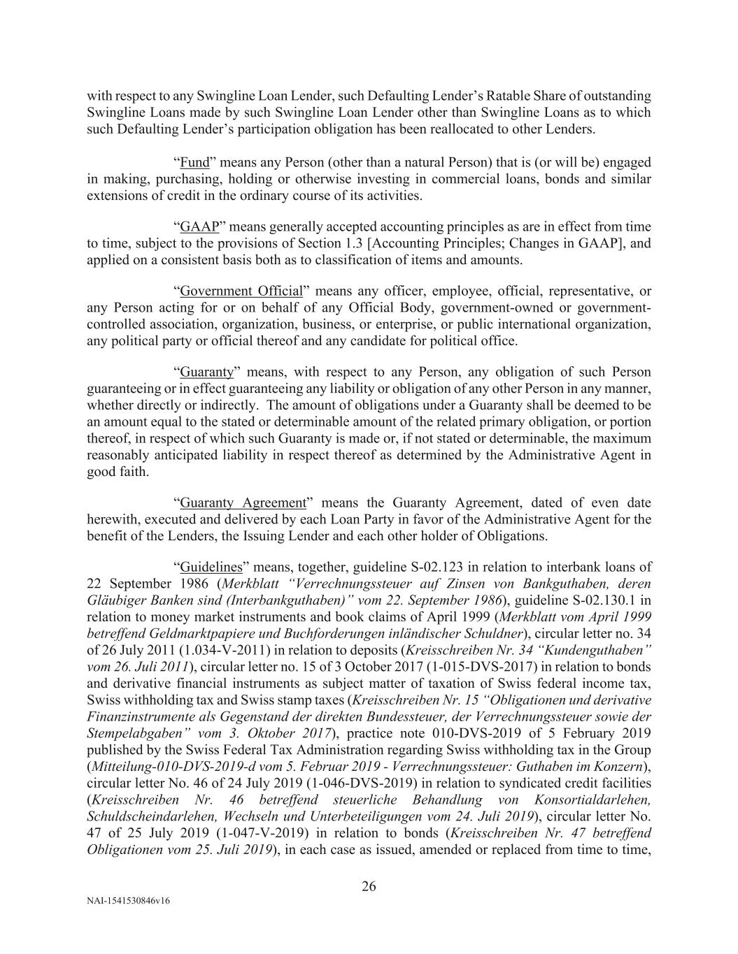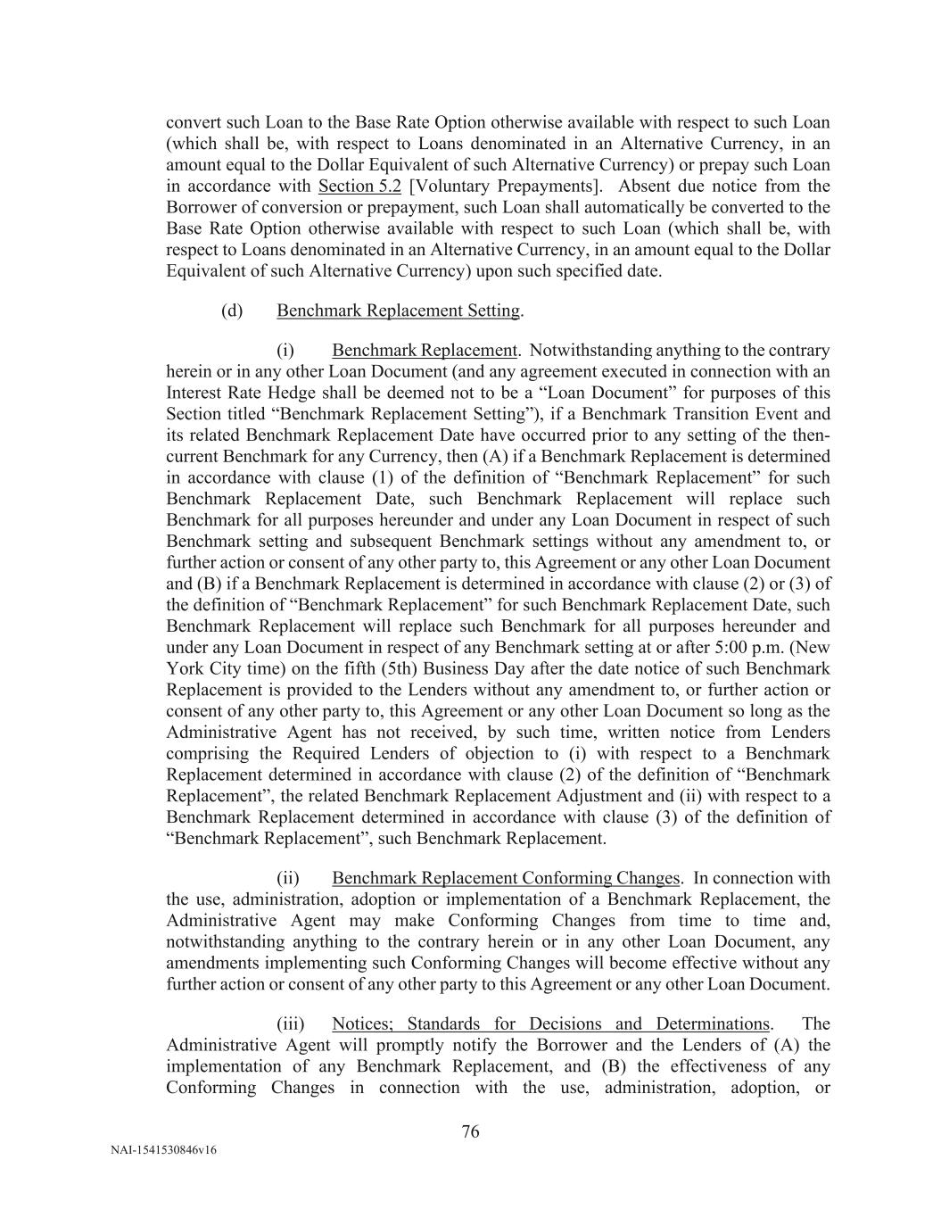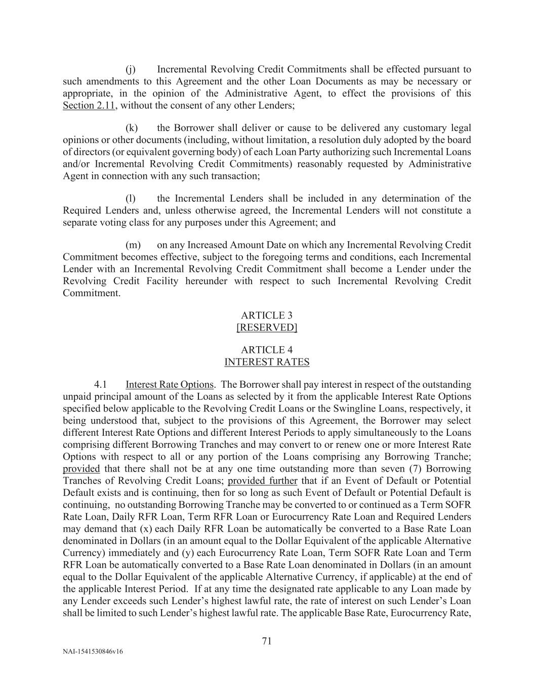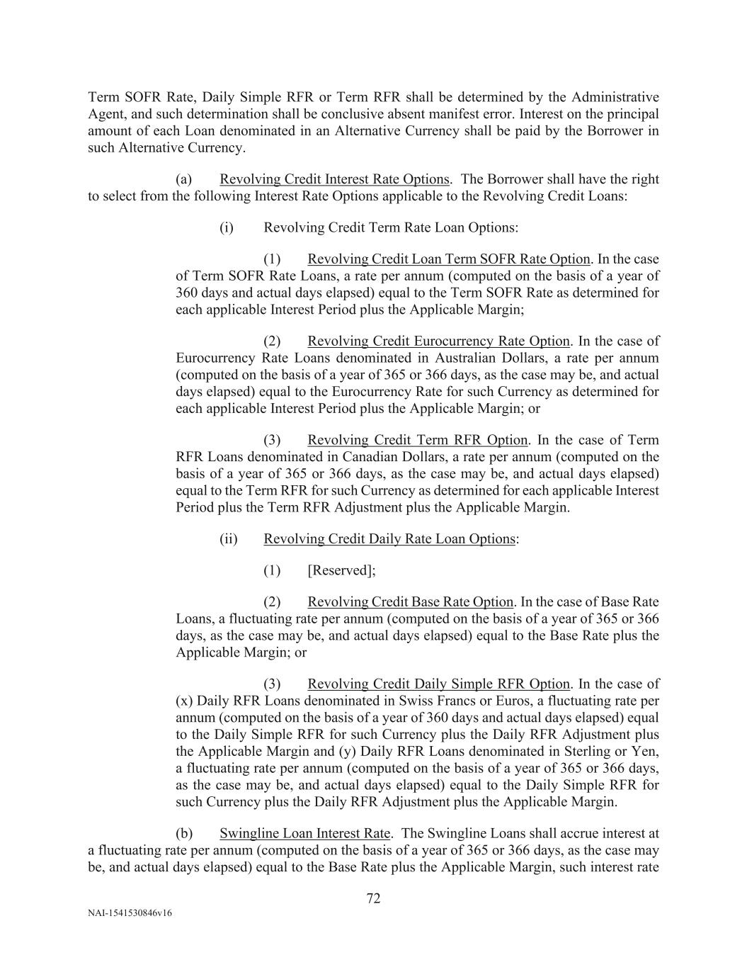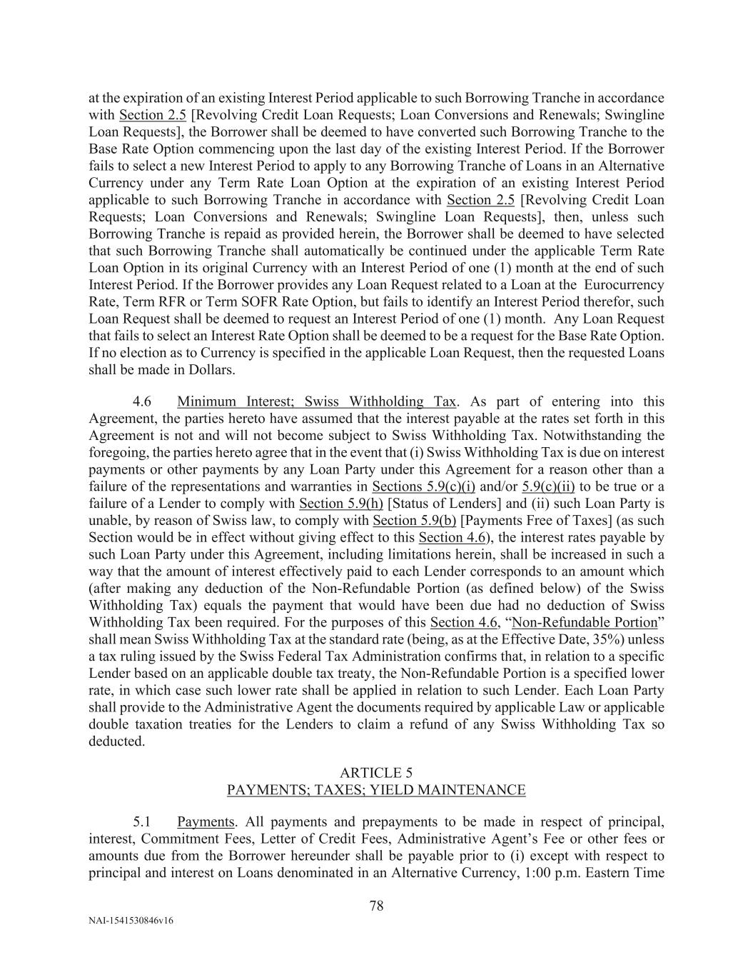 NAI-1541530846v16 TABLE OF CONTENTS (continued) Page ARTICLE 1 CERTAIN DEFINITIONS ................................................................................... 1 1.1 Certain Definitions ................................................................................................. 1 1.2 Construction ......................................................................................................... 48 1.3 Accounting Principles; Changes in GAAP; Times and Dates for Performance ......................................................................................................... 49 1.4 Benchmark Replacement Notification; Rates ...................................................... 50 1.5 Exchange Rates; Currency Equivalents. .............................................................. 50 ARTICLE 2 REVOLVING CREDIT AND SWINGLINE LOAN FACILITIES ............... 51 2.1 Revolving Credit Commitments. ......................................................................... 51 2.2 Nature of Lenders’ Obligations with Respect to Revolving Credit Loans .......... 51 2.3 Commitment Fees ................................................................................................ 52 2.4 Termination or Reduction of Revolving Credit Commitments ........................... 52 2.5 Revolving Credit Loan Requests; Loan Conversions and Renewals; Swingline Loan Requests. .................................................................................... 53 2.6 Making Revolving Credit Loans and Swingline Loans; Presumptions by the Administrative Agent; Repayment of Revolving Credit Loans; Borrowings to Repay Swingline Loans. .............................................................. 54 2.7 Notes .................................................................................................................... 57 2.8 Letter of Credit Subfacility. ................................................................................. 57 2.9 Defaulting Lenders............................................................................................... 64 2.10 Maturity Extensions. ............................................................................................ 67 2.11 Incremental Loans. ............................................................................................... 69 ARTICLE 3 [RESERVED] ....................................................................................................... 71 ARTICLE 4 INTEREST RATES ............................................................................................. 71 4.1 Interest Rate Options............................................................................................ 71 4.2 Conforming Changes Relating to the Term SOFR Rate, Eurocurrency Rate, Daily Simple RFR or Term RFR ................................................................ 73 4.3 Interest After Default ........................................................................................... 73 4.4 Rate Unascertainable; Increased Costs; Deposits Not Available; Illegality; Benchmark Replacement Setting. ........................................................................ 73 4.5 Selection of Interest Rate Options ....................................................................... 77 4.6 Minimum Interest; Swiss Withholding Tax ......................................................... 78 ARTICLE 5 PAYMENTS; TAXES; YIELD MAINTENANCE .......................................... 78
