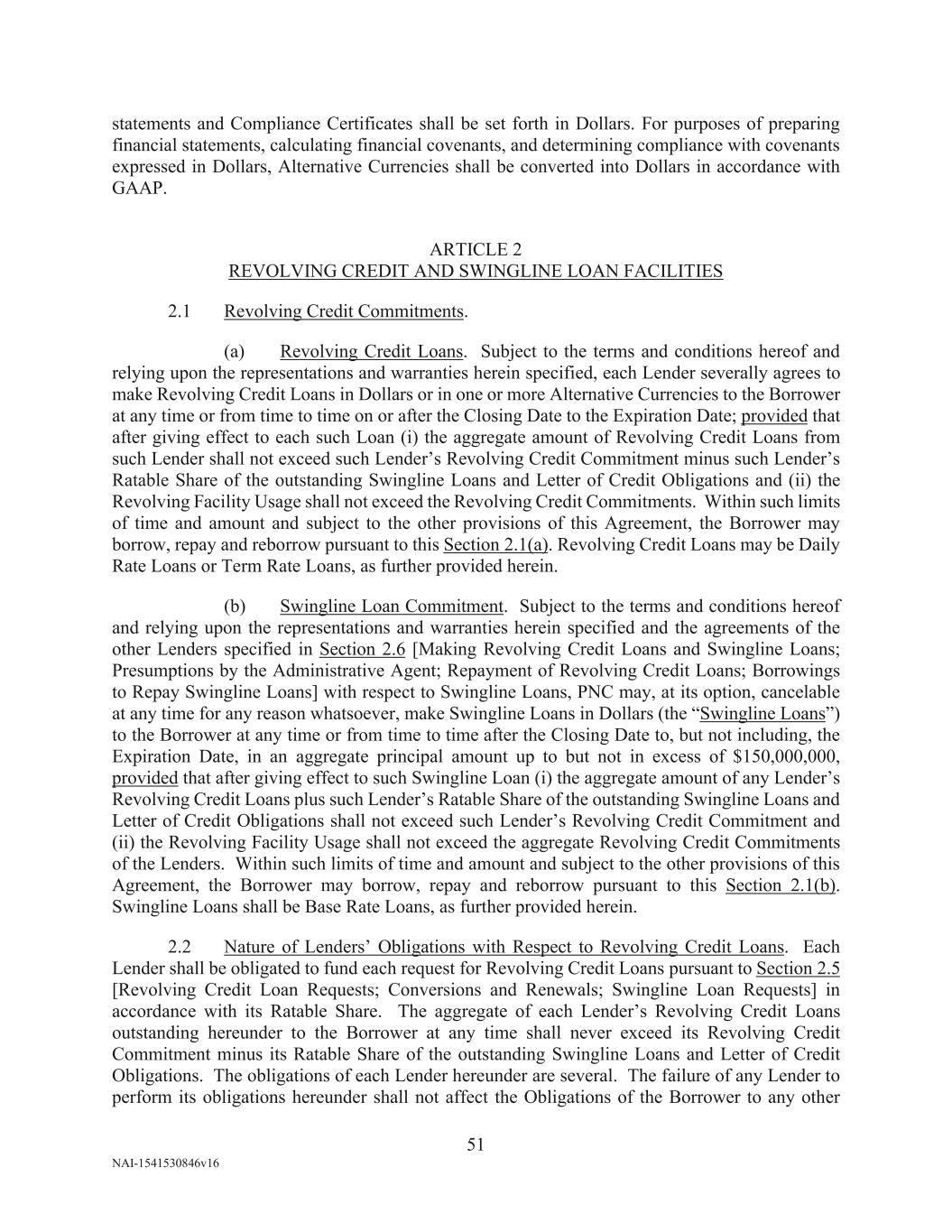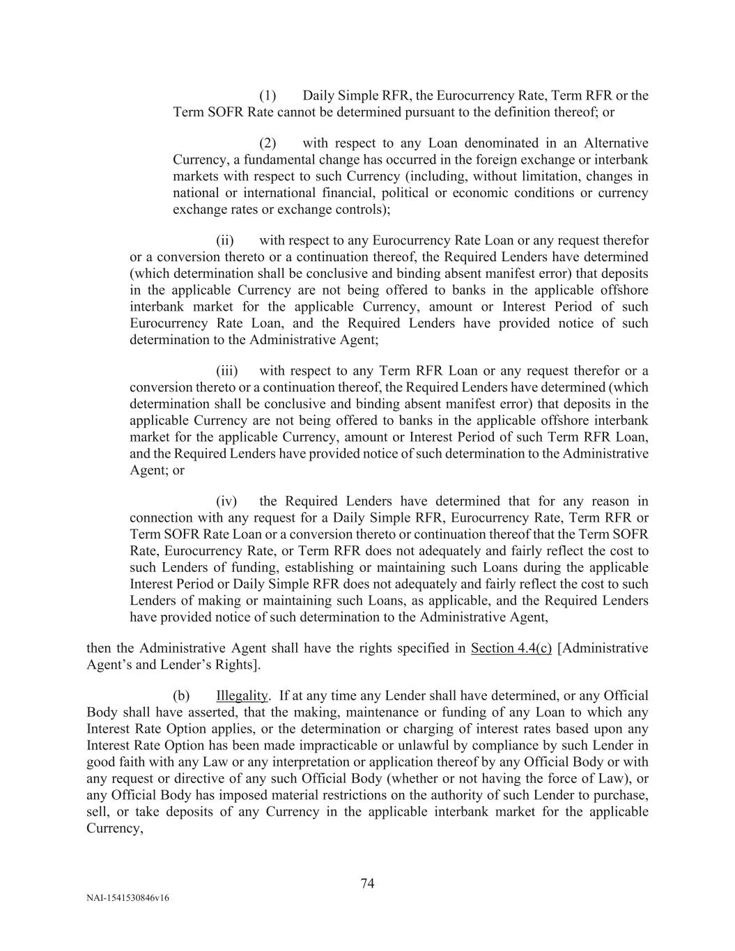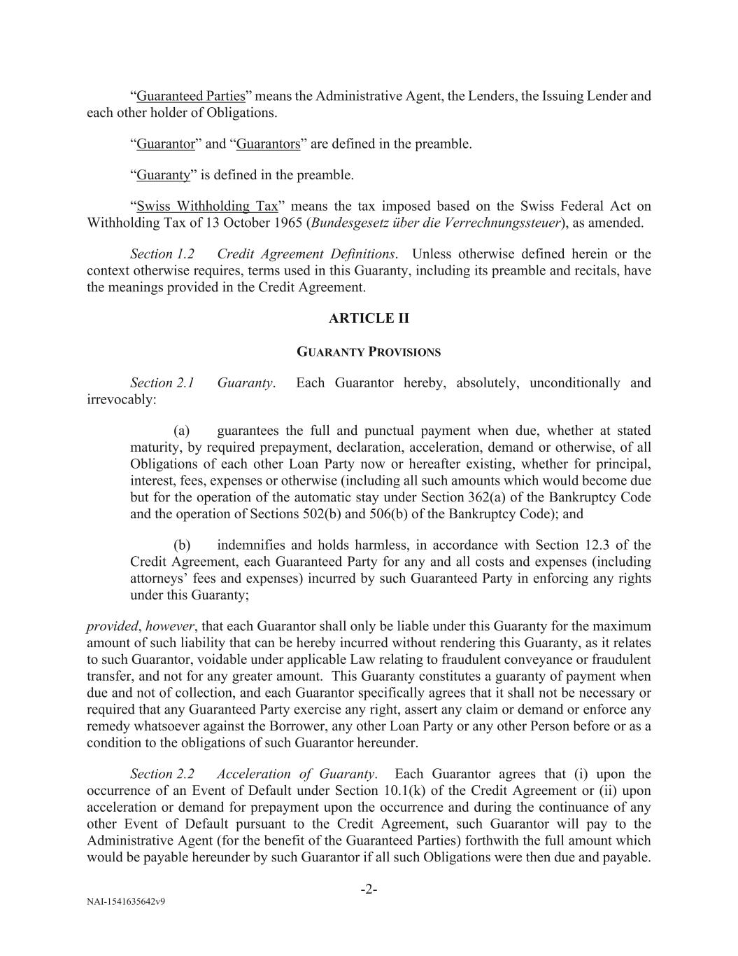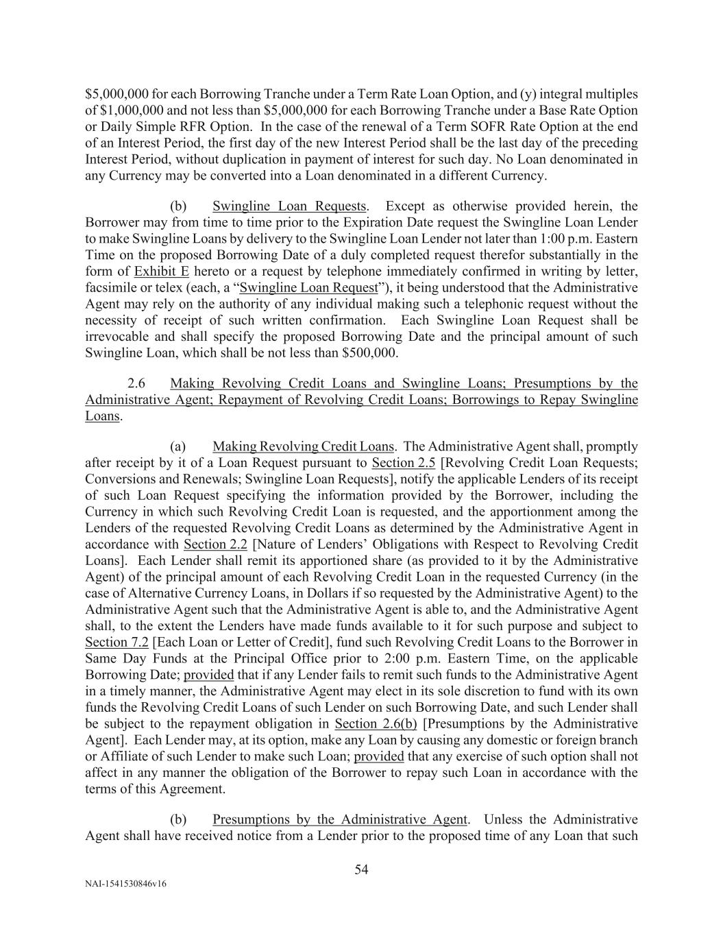 NAI-1541530846v16 TABLE OF CONTENTS (continued) Page ARTICLE 1 CERTAIN DEFINITIONS ................................................................................... 1 1.1 Certain Definitions ................................................................................................. 1 1.2 Construction ......................................................................................................... 48 1.3 Accounting Principles; Changes in GAAP; Times and Dates for Performance ......................................................................................................... 49 1.4 Benchmark Replacement Notification; Rates ...................................................... 50 1.5 Exchange Rates; Currency Equivalents. .............................................................. 50 ARTICLE 2 REVOLVING CREDIT AND SWINGLINE LOAN FACILITIES ............... 51 2.1 Revolving Credit Commitments. ......................................................................... 51 2.2 Nature of Lenders’ Obligations with Respect to Revolving Credit Loans .......... 51 2.3 Commitment Fees ................................................................................................ 52 2.4 Termination or Reduction of Revolving Credit Commitments ........................... 52 2.5 Revolving Credit Loan Requests; Loan Conversions and Renewals; Swingline Loan Requests. .................................................................................... 53 2.6 Making Revolving Credit Loans and Swingline Loans; Presumptions by the Administrative Agent; Repayment of Revolving Credit Loans; Borrowings to Repay Swingline Loans. .............................................................. 54 2.7 Notes .................................................................................................................... 57 2.8 Letter of Credit Subfacility. ................................................................................. 57 2.9 Defaulting Lenders............................................................................................... 64 2.10 Maturity Extensions. ............................................................................................ 67 2.11 Incremental Loans. ............................................................................................... 69 ARTICLE 3 [RESERVED] ....................................................................................................... 71 ARTICLE 4 INTEREST RATES ............................................................................................. 71 4.1 Interest Rate Options............................................................................................ 71 4.2 Conforming Changes Relating to the Term SOFR Rate, Eurocurrency Rate, Daily Simple RFR or Term RFR ................................................................ 73 4.3 Interest After Default ........................................................................................... 73 4.4 Rate Unascertainable; Increased Costs; Deposits Not Available; Illegality; Benchmark Replacement Setting. ........................................................................ 73 4.5 Selection of Interest Rate Options ....................................................................... 77 4.6 Minimum Interest; Swiss Withholding Tax ......................................................... 78 ARTICLE 5 PAYMENTS; TAXES; YIELD MAINTENANCE .......................................... 78
