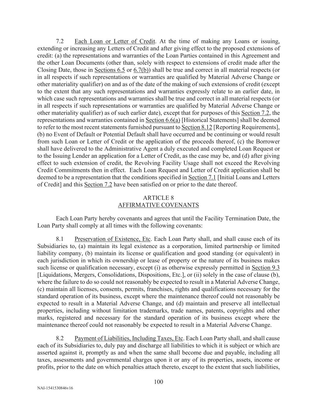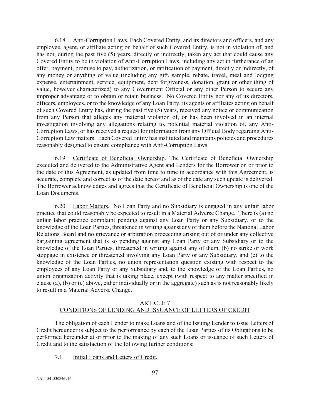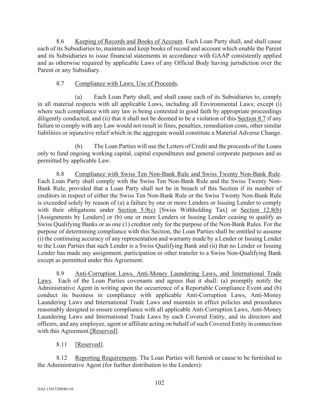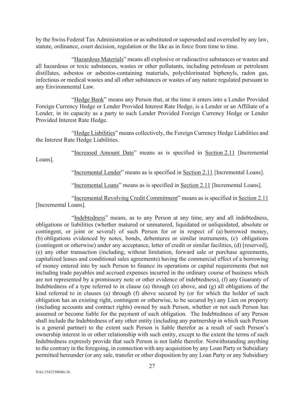 NAI-1541530846v16 TABLE OF CONTENTS (continued) Page 6.15 Environmental Matters......................................................................................... 95 6.16 Solvency ............................................................................................................... 96 6.17 Sanctions and International Trade Laws .............................................................. 96 6.18 Anti-Corruption Laws .......................................................................................... 97 6.19 Certificate of Beneficial Ownership .................................................................... 97 6.20 Labor Matters ....................................................................................................... 97 ARTICLE 7 CONDITIONS OF LENDING AND ISSUANCE OF LETTERS OF CREDIT ...................................................................................................................................... 97 7.1 Initial Loans and Letters of Credit. ...................................................................... 97 7.2 Each Loan or Letter of Credit ............................................................................ 100 ARTICLE 8 AFFIRMATIVE COVENANTS ...................................................................... 100 8.1 Preservation of Existence, Etc. .......................................................................... 100 8.2 Payment of Liabilities, Including Taxes, Etc. .................................................... 100 8.3 Maintenance of Insurance .................................................................................. 101 8.4 Maintenance of Properties and Leases ............................................................... 101 8.5 Inspection Rights ............................................................................................... 101 8.6 Keeping of Records and Books of Account ....................................................... 102 8.7 Compliance with Laws; Use of Proceeds. ......................................................... 102 8.8 Compliance with Swiss Ten Non-Bank Rule and Swiss Twenty Non-Bank Rule .................................................................................................................... 102 8.9 Anti-Corruption Laws, Anti-Money Laundering Laws, and International Trade Laws......................................................................................................... 102 8.10 [Reserved]. ......................................................................................................... 102 8.11 [Reserved]. ......................................................................................................... 102 8.12 Reporting Requirements .................................................................................... 102 8.13 Certificates; Notices; Additional Information ................................................... 103 8.14 Certificate of Beneficial Ownership and Other Additional Information ........... 104 ARTICLE 9 NEGATIVE COVENANTS .............................................................................. 105 9.1 Subsidiary Indebtedness..................................................................................... 105 9.2 Liens ................................................................................................................... 106 9.3 Liquidations, Mergers, Consolidations, Dispositions, Etc ................................. 106 9.4 Maximum Consolidated Net Leverage Ratio .................................................... 107