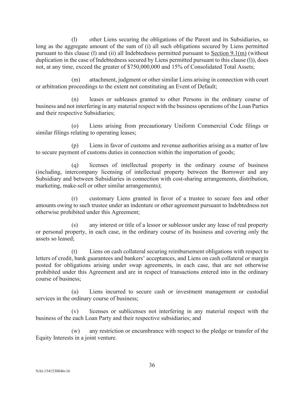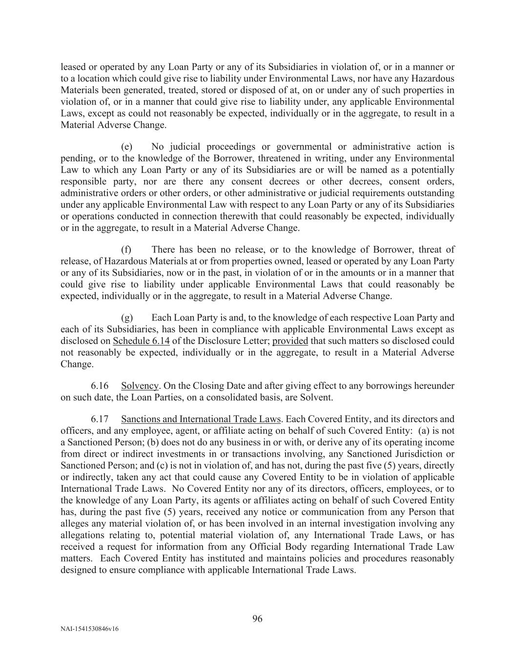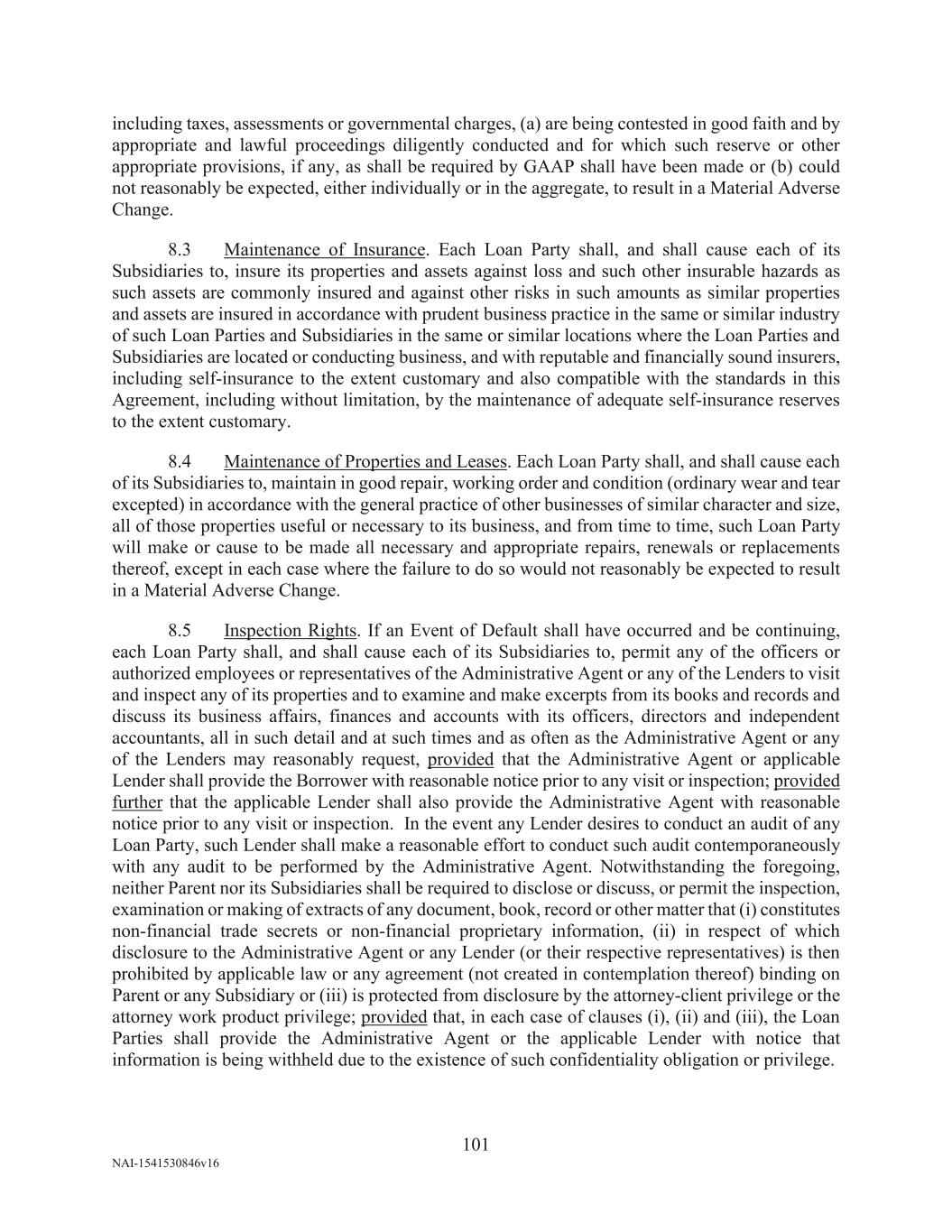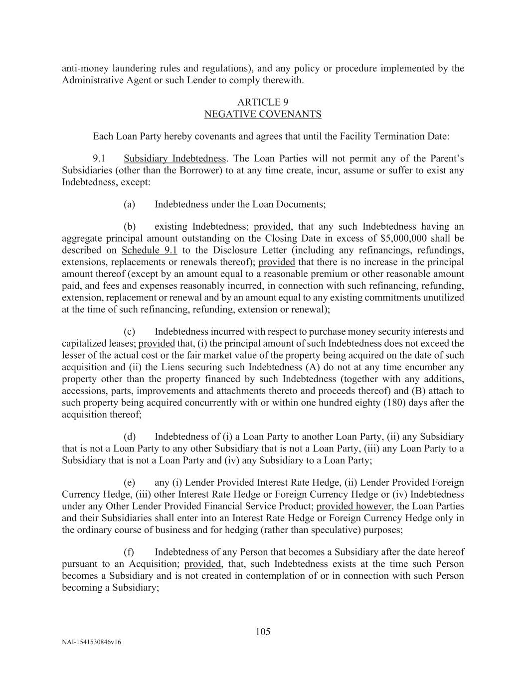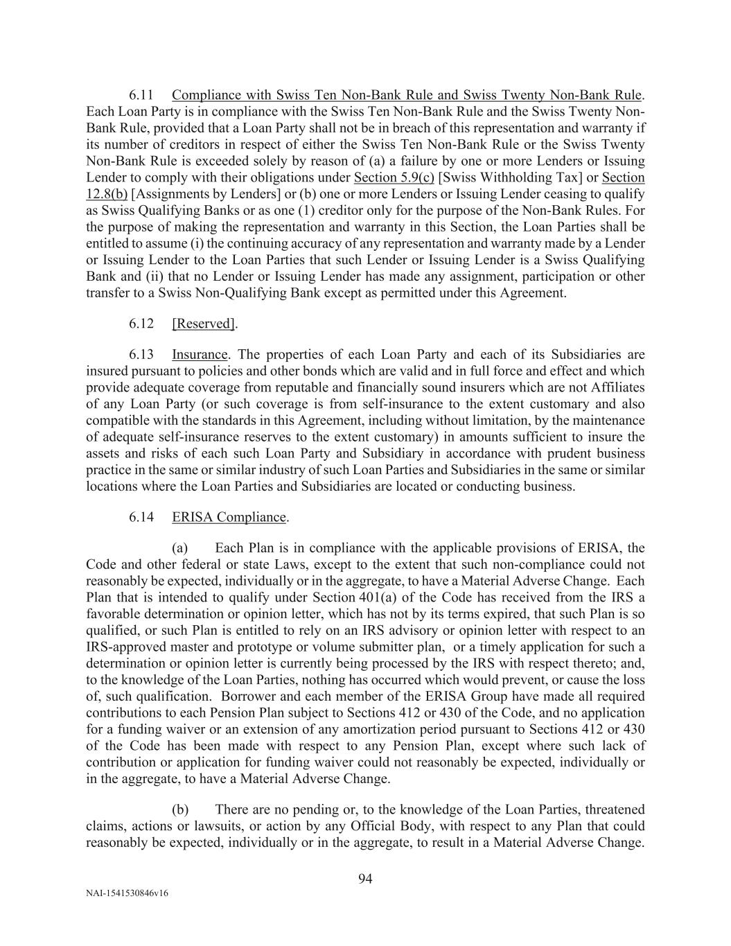 NAI-1541530846v16 TABLE OF CONTENTS (continued) Page 6.15 Environmental Matters......................................................................................... 95 6.16 Solvency ............................................................................................................... 96 6.17 Sanctions and International Trade Laws .............................................................. 96 6.18 Anti-Corruption Laws .......................................................................................... 97 6.19 Certificate of Beneficial Ownership .................................................................... 97 6.20 Labor Matters ....................................................................................................... 97 ARTICLE 7 CONDITIONS OF LENDING AND ISSUANCE OF LETTERS OF CREDIT ...................................................................................................................................... 97 7.1 Initial Loans and Letters of Credit. ...................................................................... 97 7.2 Each Loan or Letter of Credit ............................................................................ 100 ARTICLE 8 AFFIRMATIVE COVENANTS ...................................................................... 100 8.1 Preservation of Existence, Etc. .......................................................................... 100 8.2 Payment of Liabilities, Including Taxes, Etc. .................................................... 100 8.3 Maintenance of Insurance .................................................................................. 101 8.4 Maintenance of Properties and Leases ............................................................... 101 8.5 Inspection Rights ............................................................................................... 101 8.6 Keeping of Records and Books of Account ....................................................... 102 8.7 Compliance with Laws; Use of Proceeds. ......................................................... 102 8.8 Compliance with Swiss Ten Non-Bank Rule and Swiss Twenty Non-Bank Rule .................................................................................................................... 102 8.9 Anti-Corruption Laws, Anti-Money Laundering Laws, and International Trade Laws......................................................................................................... 102 8.10 [Reserved]. ......................................................................................................... 102 8.11 [Reserved]. ......................................................................................................... 102 8.12 Reporting Requirements .................................................................................... 102 8.13 Certificates; Notices; Additional Information ................................................... 103 8.14 Certificate of Beneficial Ownership and Other Additional Information ........... 104 ARTICLE 9 NEGATIVE COVENANTS .............................................................................. 105 9.1 Subsidiary Indebtedness..................................................................................... 105 9.2 Liens ................................................................................................................... 106 9.3 Liquidations, Mergers, Consolidations, Dispositions, Etc ................................. 106 9.4 Maximum Consolidated Net Leverage Ratio .................................................... 107
