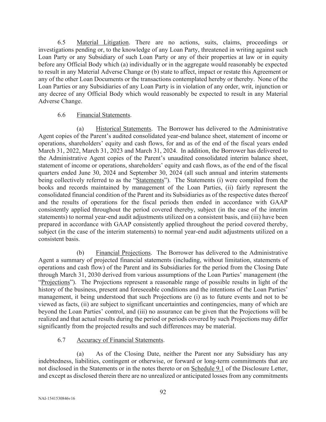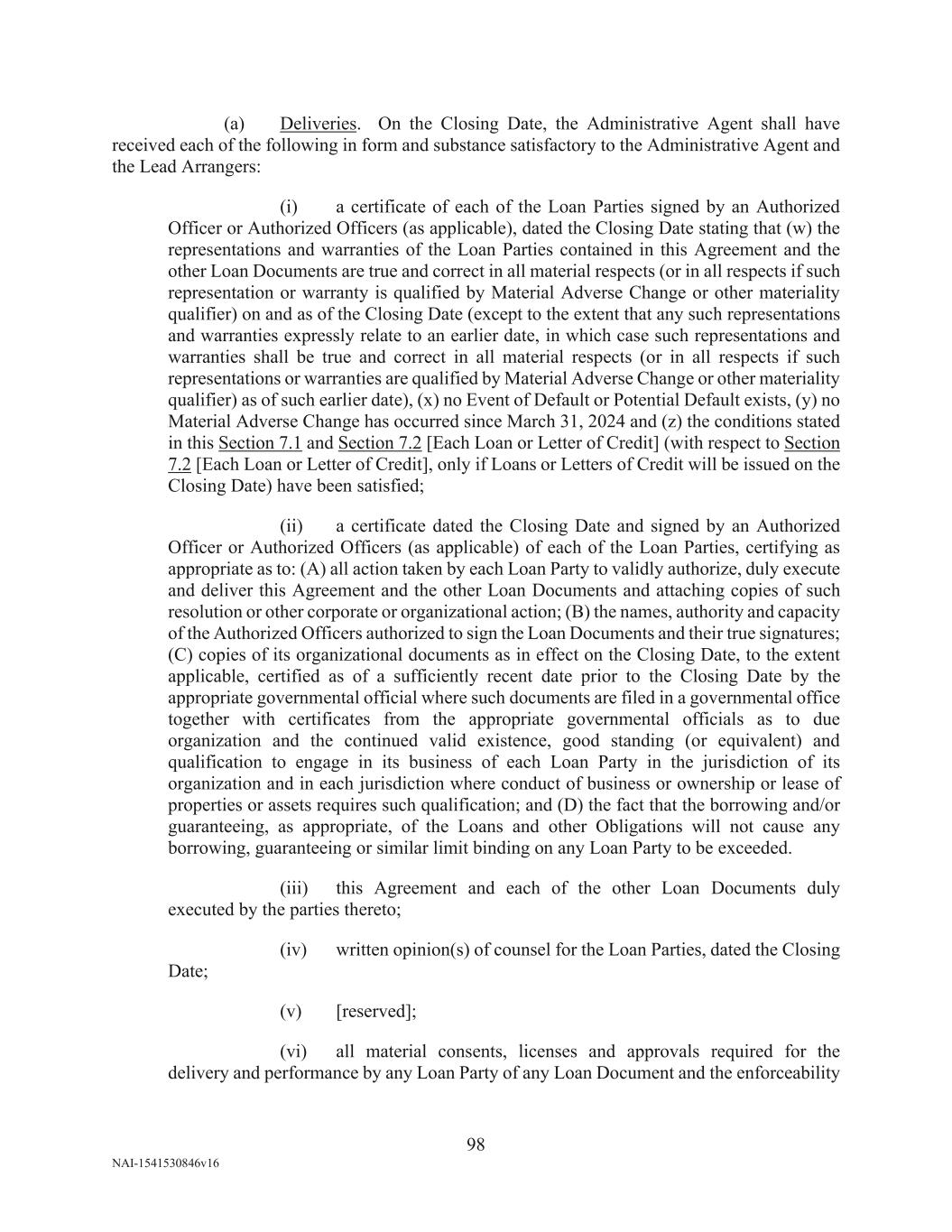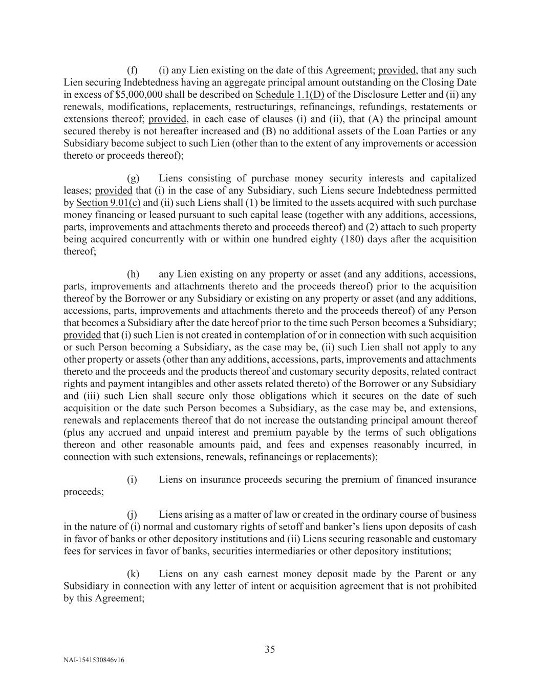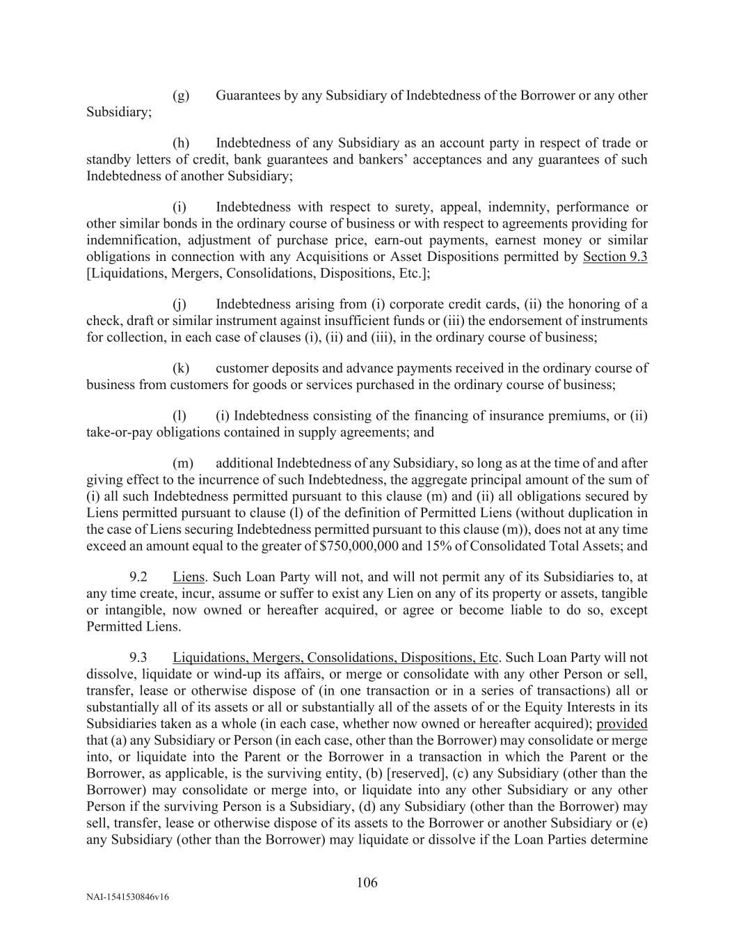 NAI-1541530846v16 TABLE OF CONTENTS (continued) Page 6.15 Environmental Matters......................................................................................... 95 6.16 Solvency ............................................................................................................... 96 6.17 Sanctions and International Trade Laws .............................................................. 96 6.18 Anti-Corruption Laws .......................................................................................... 97 6.19 Certificate of Beneficial Ownership .................................................................... 97 6.20 Labor Matters ....................................................................................................... 97 ARTICLE 7 CONDITIONS OF LENDING AND ISSUANCE OF LETTERS OF CREDIT ...................................................................................................................................... 97 7.1 Initial Loans and Letters of Credit. ...................................................................... 97 7.2 Each Loan or Letter of Credit ............................................................................ 100 ARTICLE 8 AFFIRMATIVE COVENANTS ...................................................................... 100 8.1 Preservation of Existence, Etc. .......................................................................... 100 8.2 Payment of Liabilities, Including Taxes, Etc. .................................................... 100 8.3 Maintenance of Insurance .................................................................................. 101 8.4 Maintenance of Properties and Leases ............................................................... 101 8.5 Inspection Rights ............................................................................................... 101 8.6 Keeping of Records and Books of Account ....................................................... 102 8.7 Compliance with Laws; Use of Proceeds. ......................................................... 102 8.8 Compliance with Swiss Ten Non-Bank Rule and Swiss Twenty Non-Bank Rule .................................................................................................................... 102 8.9 Anti-Corruption Laws, Anti-Money Laundering Laws, and International Trade Laws......................................................................................................... 102 8.10 [Reserved]. ......................................................................................................... 102 8.11 [Reserved]. ......................................................................................................... 102 8.12 Reporting Requirements .................................................................................... 102 8.13 Certificates; Notices; Additional Information ................................................... 103 8.14 Certificate of Beneficial Ownership and Other Additional Information ........... 104 ARTICLE 9 NEGATIVE COVENANTS .............................................................................. 105 9.1 Subsidiary Indebtedness..................................................................................... 105 9.2 Liens ................................................................................................................... 106 9.3 Liquidations, Mergers, Consolidations, Dispositions, Etc ................................. 106 9.4 Maximum Consolidated Net Leverage Ratio .................................................... 107