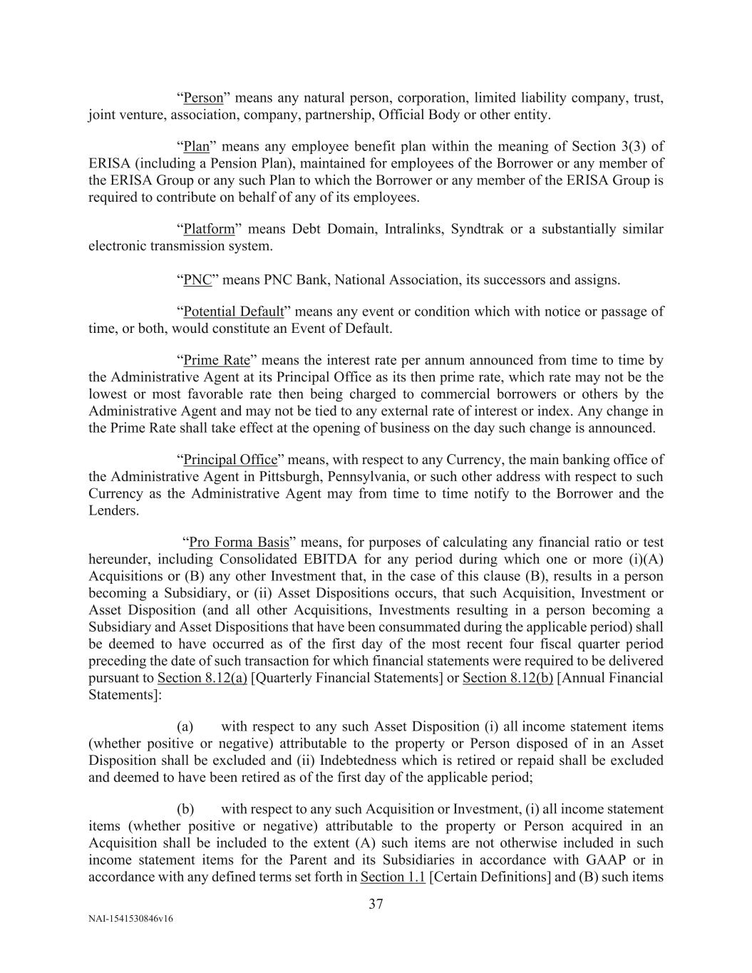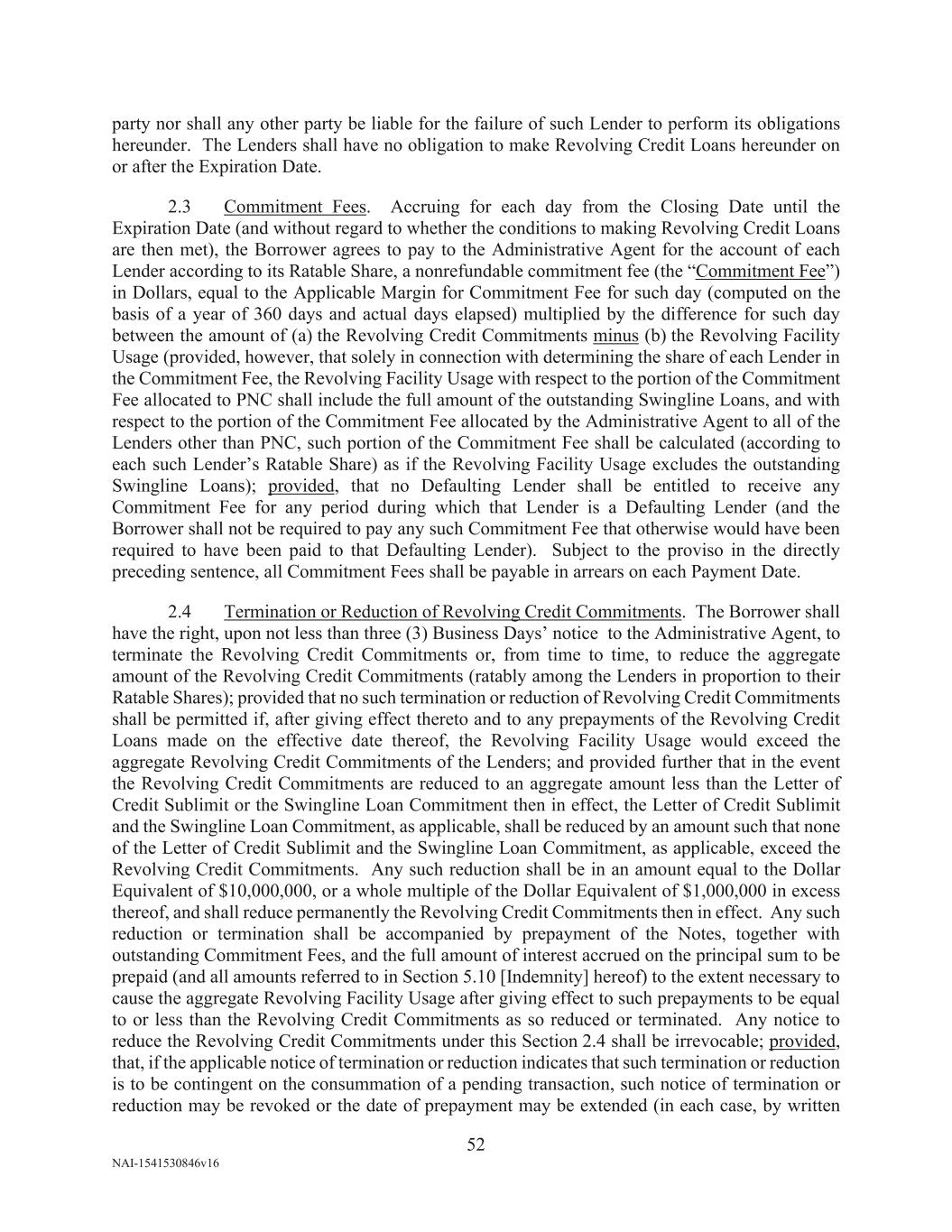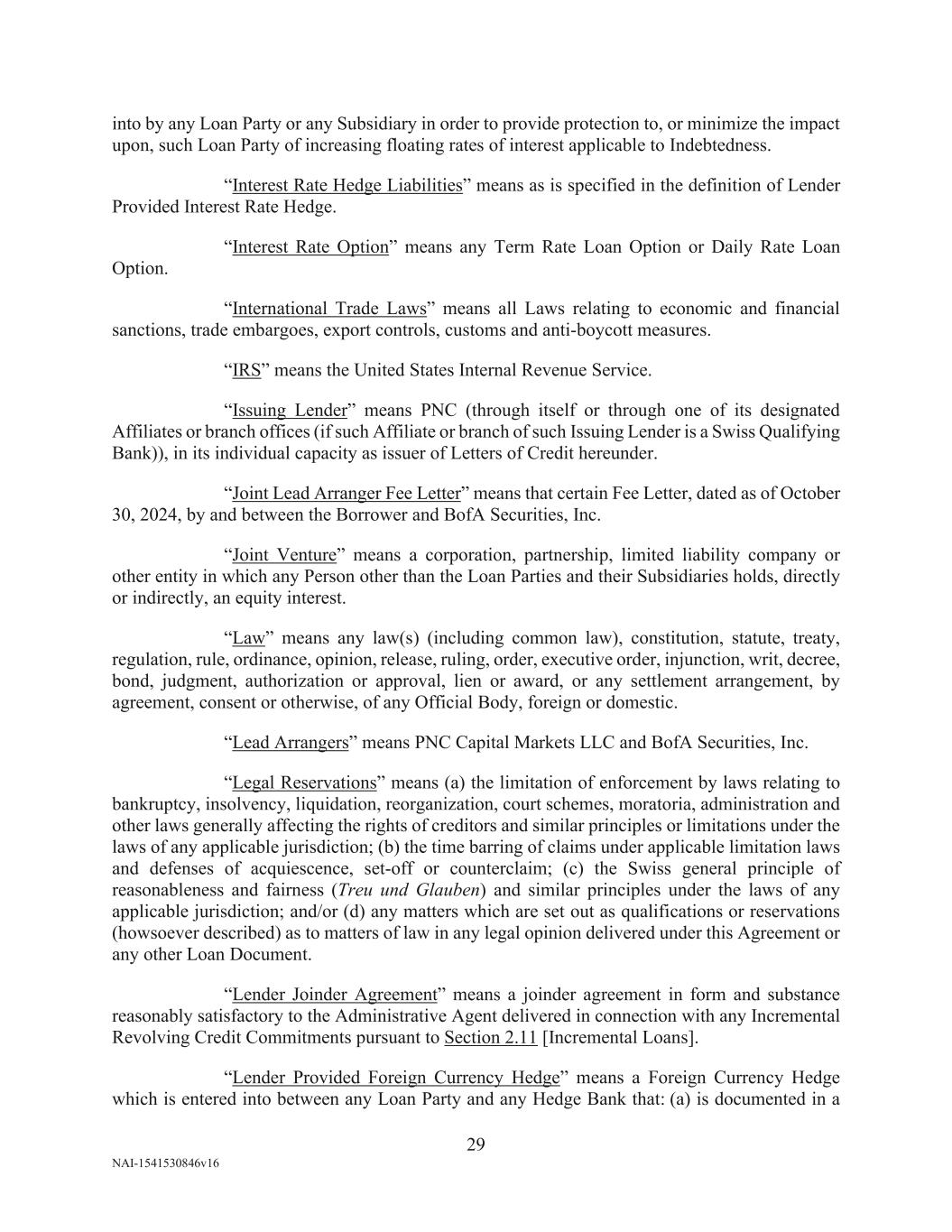 NAI-1541530846v16 13 “Code” means the Internal Revenue Code of 1986, as the same may be amended or supplemented from time to time, and any successor statute of similar import, and the rules and regulations thereunder, as from time to time in effect. “Commitment” means, as to any Lender, its Revolving Credit Commitment and, in the case of PNC (in its capacity as the Swingline Loan Lender), its Swingline Loan Commitment (but not the aggregate of its Revolving Credit Commitment and its Swingline Loan Commitment), and “Commitments” means the aggregate of the Revolving Credit Commitments of all of the Lenders. “Commitment Fee” means as is specified in Section 2.3 [Commitment Fees]. “Communications” means as is specified in Section 12.5(d)(ii) [Platform]. “Compliance Authority” means (a) the United States government or any agency or political subdivision thereof, including, without limitation, the U.S. Department of State, the U.S. Department of Commerce, the U.S. Department of the Treasury and its Office of Foreign Assets Control, and the U.S. Customs and Border Protection agency; (b) the government of Canada or any agency thereof; (c) the European Union or any agency thereof; (d) the government of the United Kingdom or any agency thereof; (e) Switzerland or any Federal agency thereof; (f) the United Nations Security Council; (g) the Hong Kong Monetary Authority; and (h) any other Official Body with jurisdiction to administer Anti-Corruption Laws, Anti-Money Laundering Laws or International Trade Laws with respect to the conduct of a Covered Entity. “Compliance Certificate” means as is specified in Section 8.13(a) [Certificate of the Parent]. “Conforming Changes” means, with respect to the Term SOFR Rate, Daily Simple RFR, Term RFR, Eurocurrency Rate or any Benchmark Replacement in relation thereto, any technical, administrative or operational changes (including changes to the definition of “Base Rate,” the definition of “Business Day,” the definition of “Interest Period,” the definition of “U.S. Government Securities Business Day,” timing and frequency of determining rates and making payments of interest, timing of borrowing requests or prepayment, conversion or continuation notices, the applicability and length of lookback periods, the applicability of breakage provisions, and other technical, administrative or operational matters) that the Administrative Agent decides (after consultation with the Borrower) may be appropriate to reflect the adoption and implementation of the Term SOFR Rate, Daily Simple RFR, Term RFR, Eurocurrency Rate or such Benchmark Replacement and to permit the administration thereof by the Administrative Agent in a manner substantially consistent with market practice (or, if the Administrative Agent decides (in consultation with the Borrower) that adoption of any portion of such market practice is not administratively feasible or if the Administrative Agent determines (in consultation with the Borrower) that no market practice for the administration of the Term SOFR Rate, Daily Simple RFR, Term RFR, Eurocurrency Rate or the Benchmark Replacement exists, in such other manner of administration as the Administrative Agent decides (in consultation with the Borrower) is reasonably necessary in connection with the administration of this Agreement and the other Loan Documents).